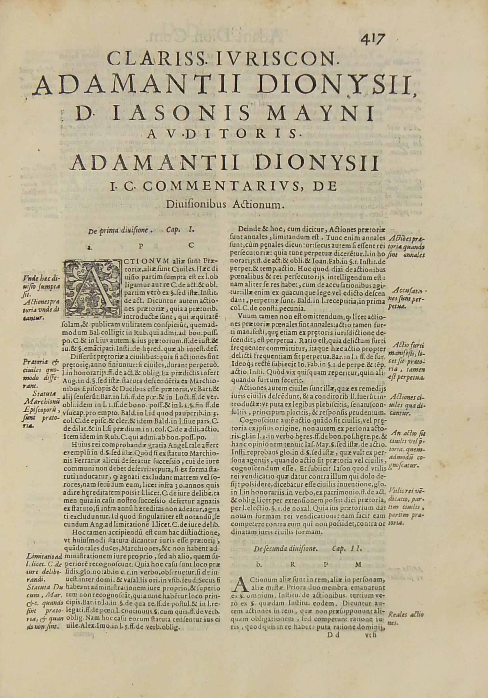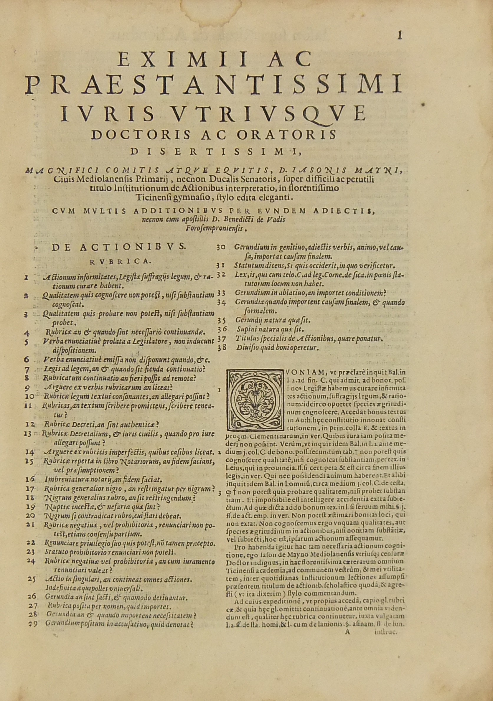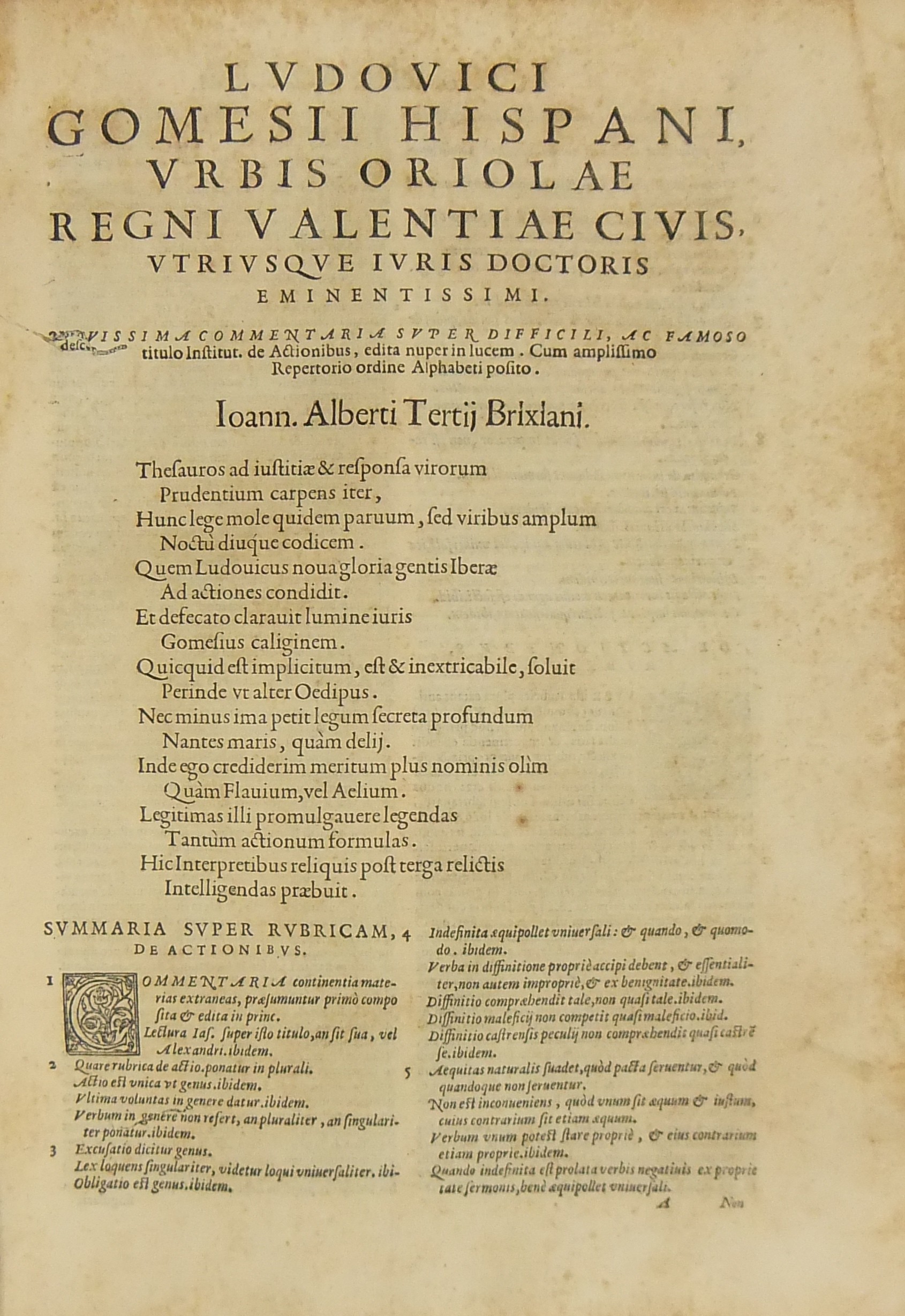 De actionibus titulus Institutionum Iustiniani, tertiam iuris civilis partem continens, Commentarijs D. Iasonis Mayni... eiusdemque; Additionibus, & Apostillis D. Benedicti de Vadis... & a D. Antonio Carcassona Sardo auctis, illustratus. Accessit in eundem titulum omnium Actionum Nomenclatura, Arbusculae elegantissimae ope insertarum, ac elegans tractatus Ioannis Crispi Montani Aquilani cum insigni earundem Actionum Divisione ab Adamantio Dionysio,... edita. Adiecimus praeterea de illarum varietate libros sex Placentini I.C. Vetustissimi. Ac demum Ludovicum Gomesium... eundem Titulum luculentissime interpretantem. Cum Summarijs, & suo cuique Indice locupletissimo
