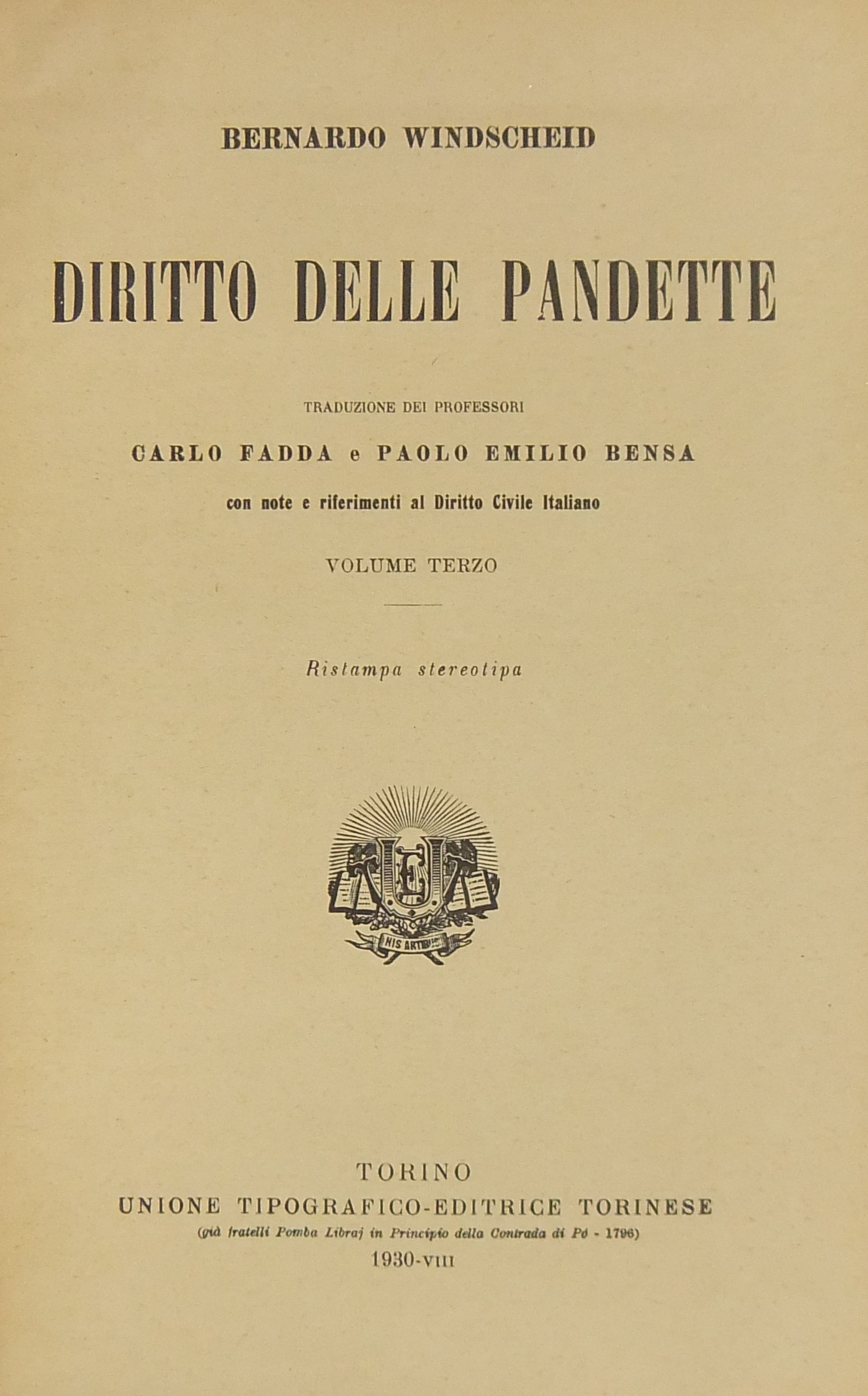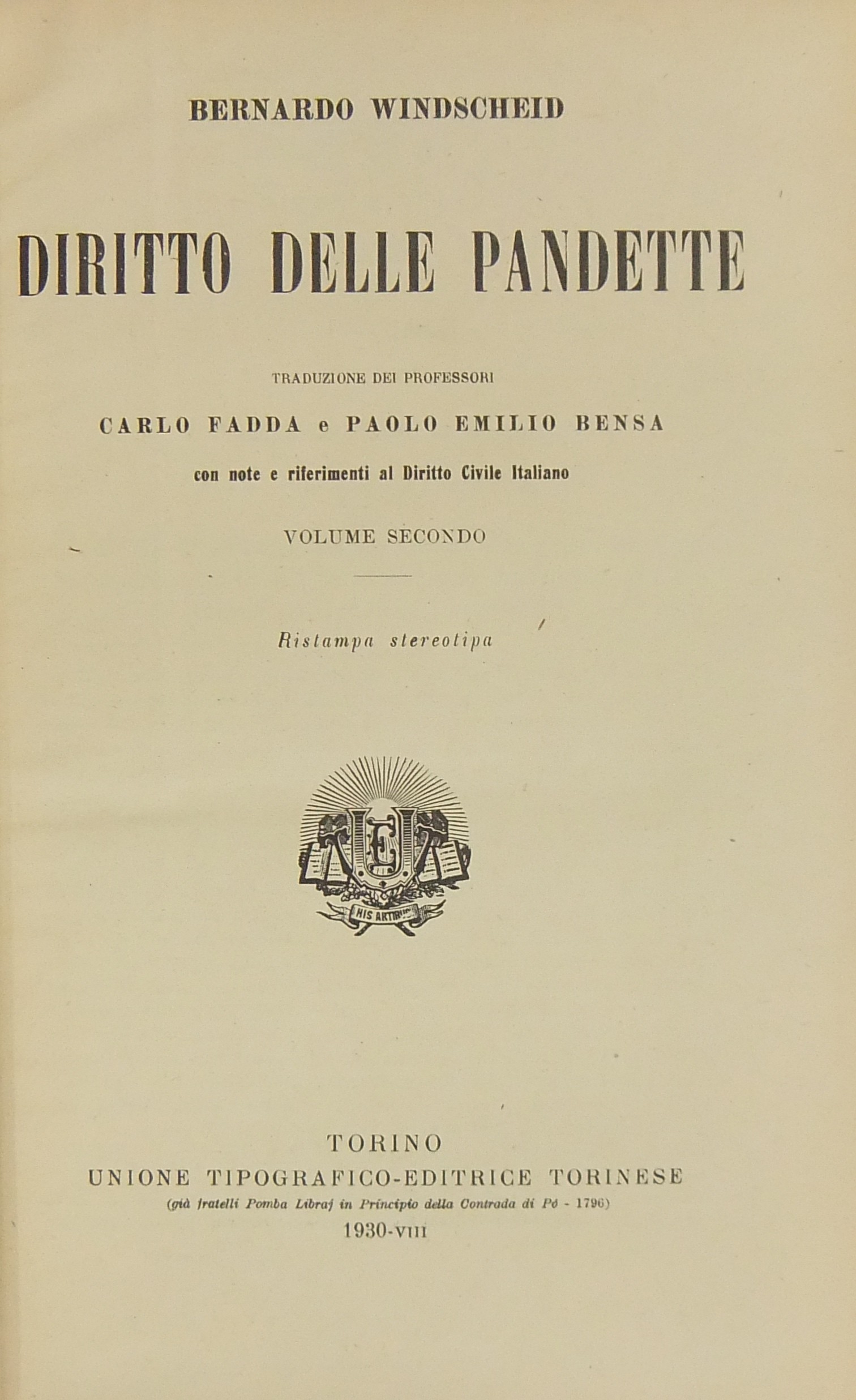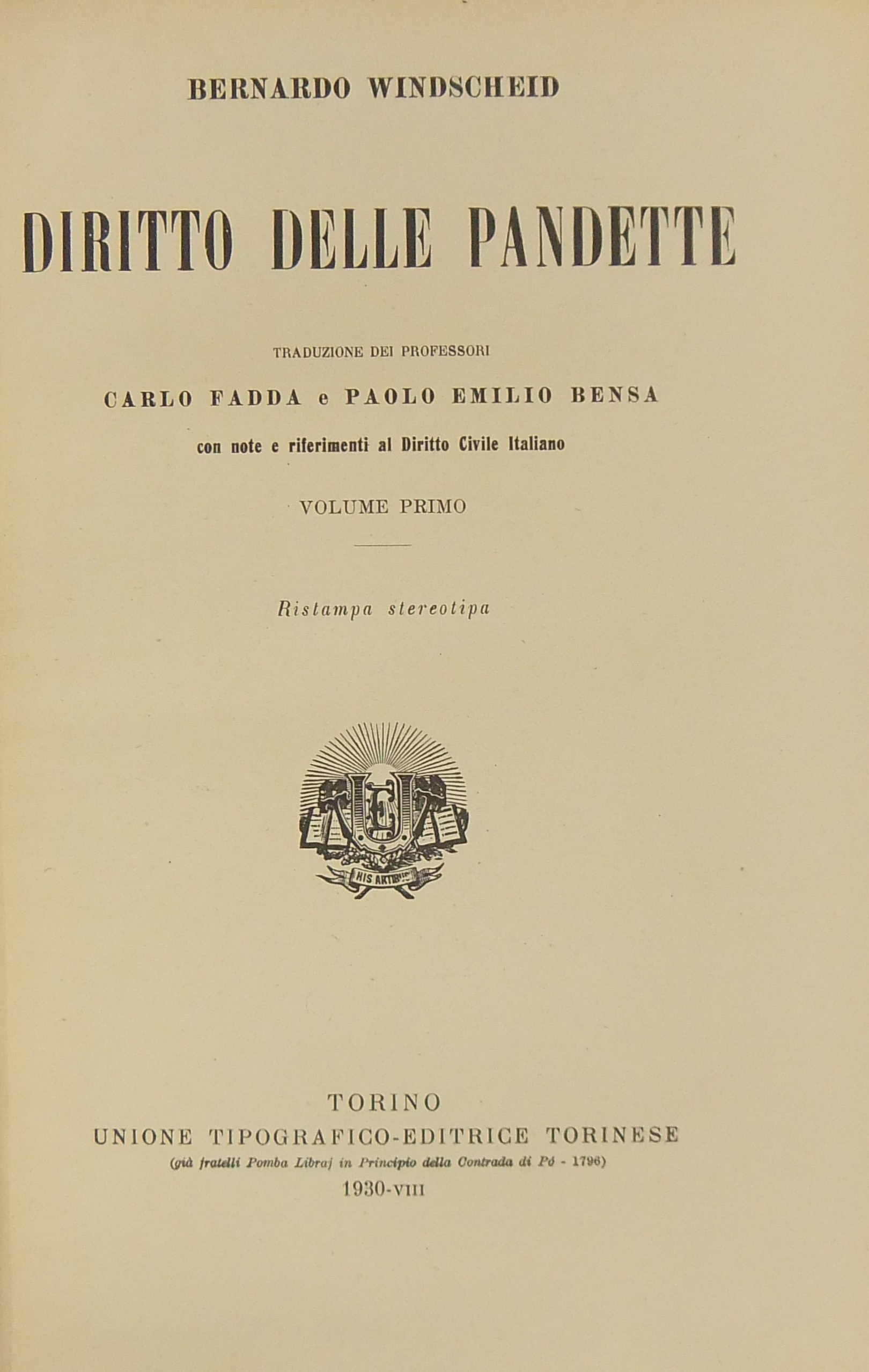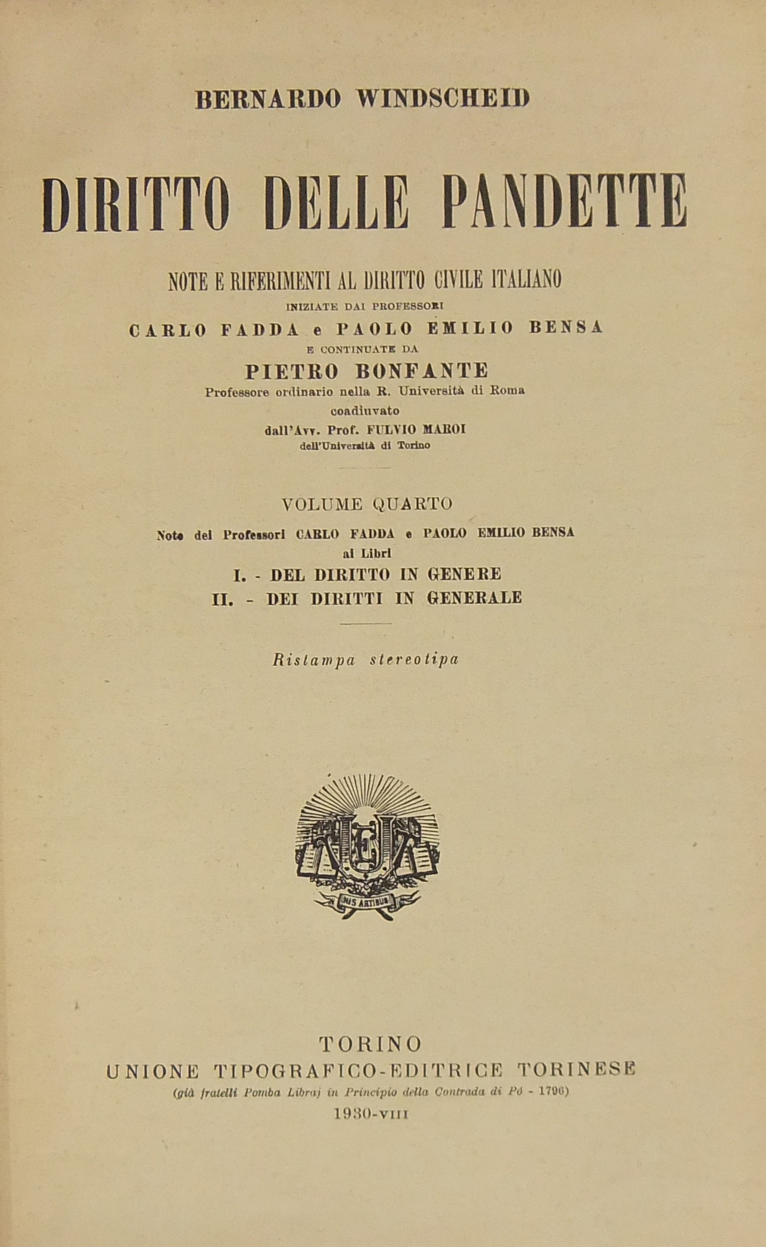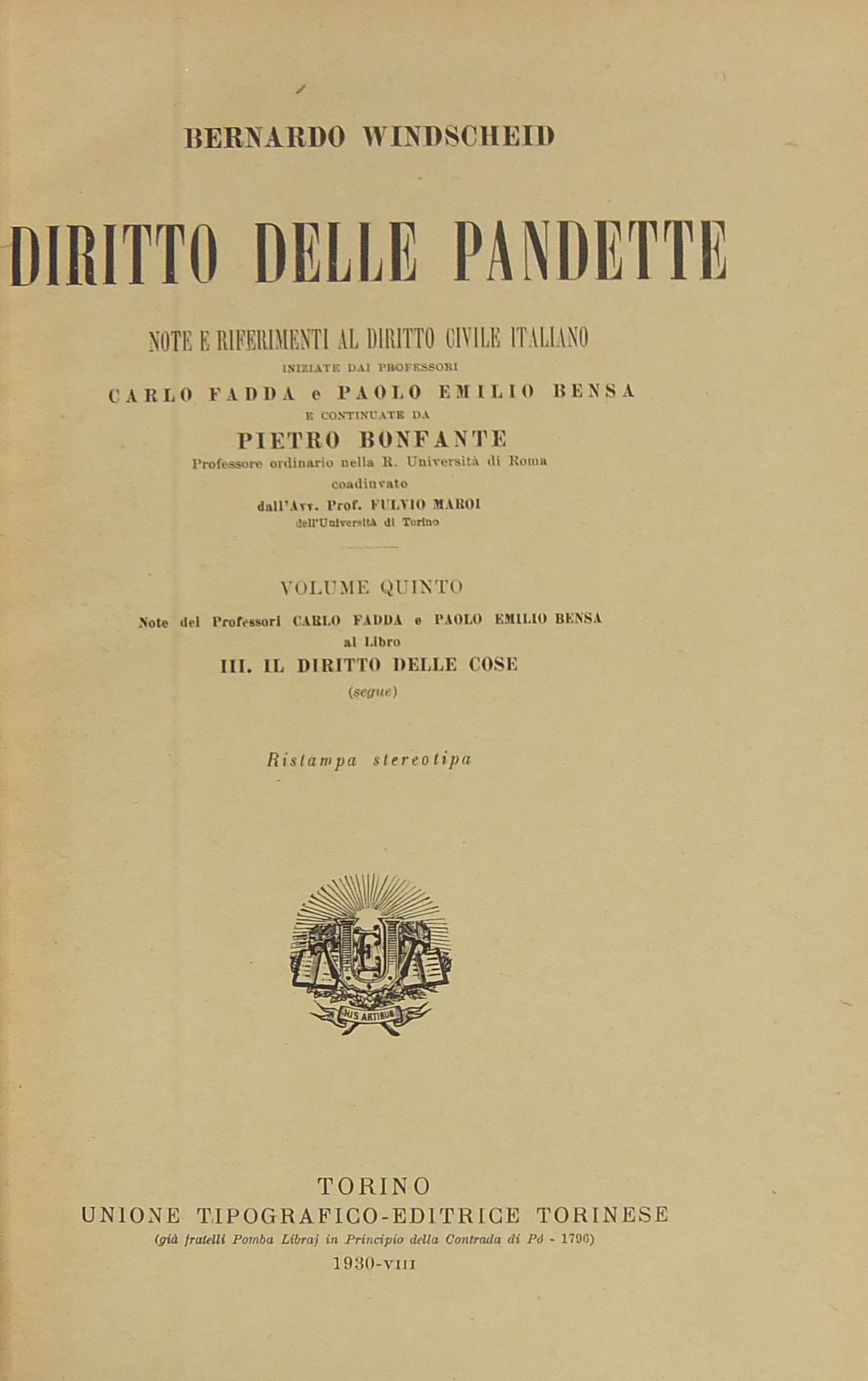 Diritto delle Pandette. Note e riferimenti al Diritto Civile Italiano iniziate dai professori Carlo Fadda e Paolo Emilio Bensa e continuate da Pietro Bonfante coadiuvato dall'Avv. Prof. Fulvio Maroi. Vol. I - Introduzione; Del diritto in genere; Dei diritti in generale; Il diritto delle cose. Vol. II - Il diritto dei crediti. Vol. III - Diritto di famiglia; Il diritto ereditario. Vol. IV - Note dei professori Carlo Fadda e Paolo Emilio Bensa ai Libri I - Del diritto in genere; II - Dei diritti in generale. Vol. V - Note dei professori Carlo Fadda e Paolo Emilio Bensa al Libro III - Il diritto delle cose