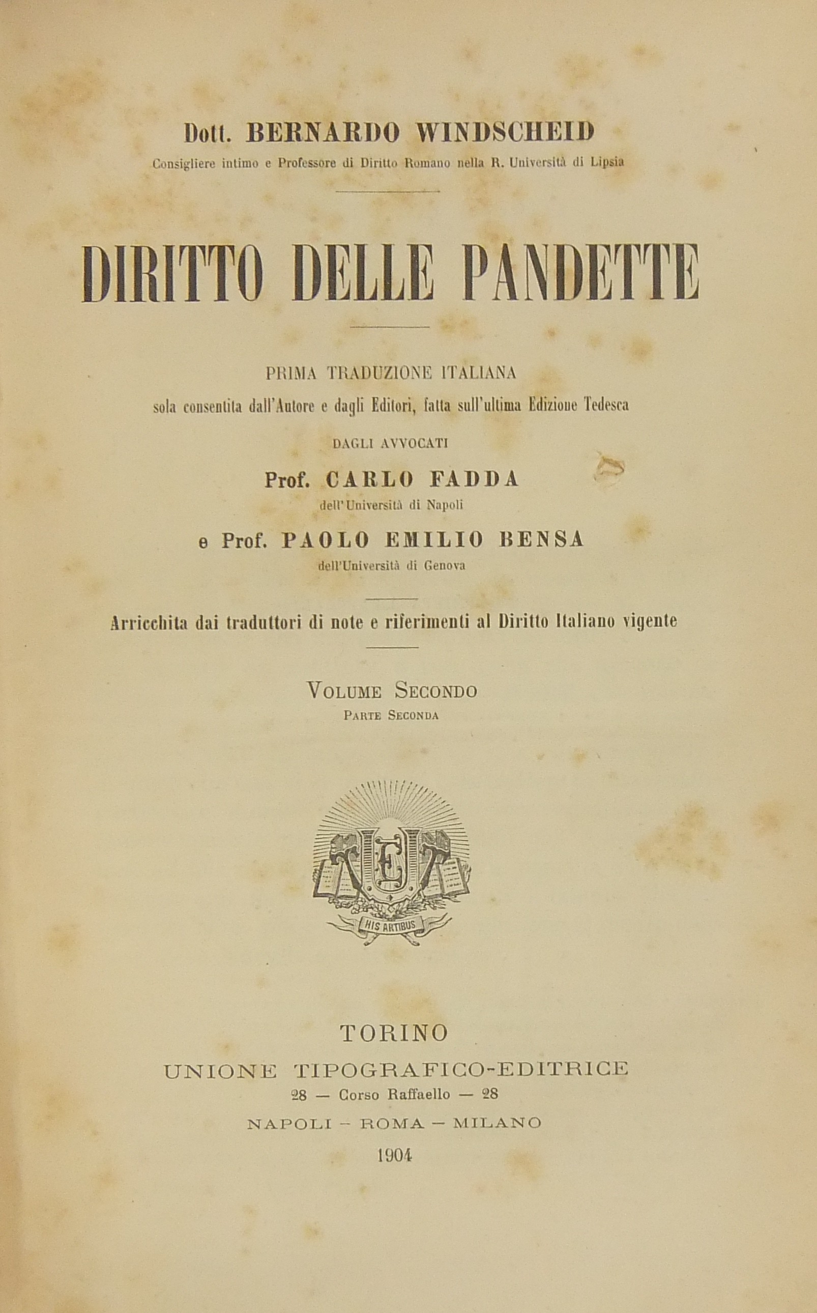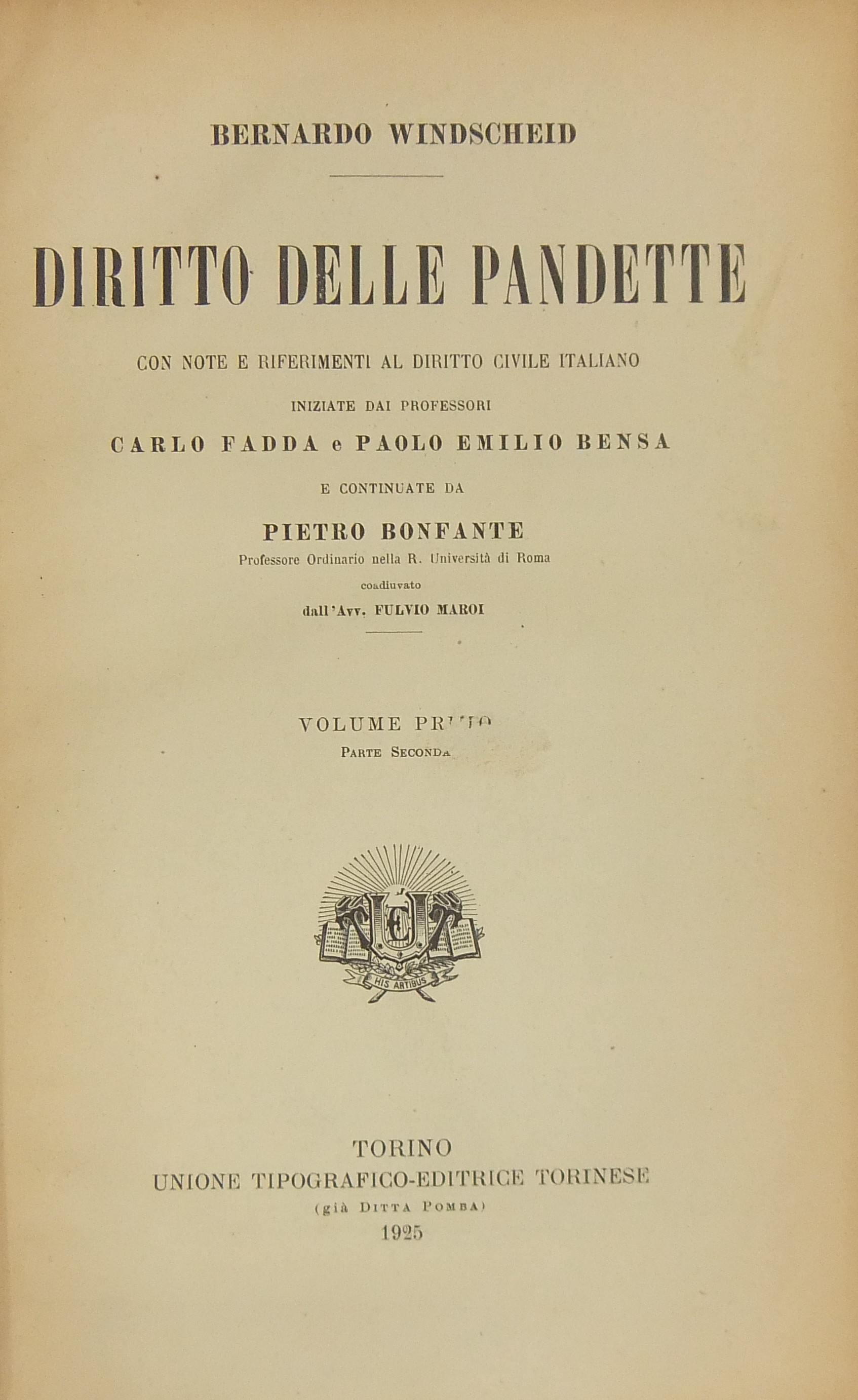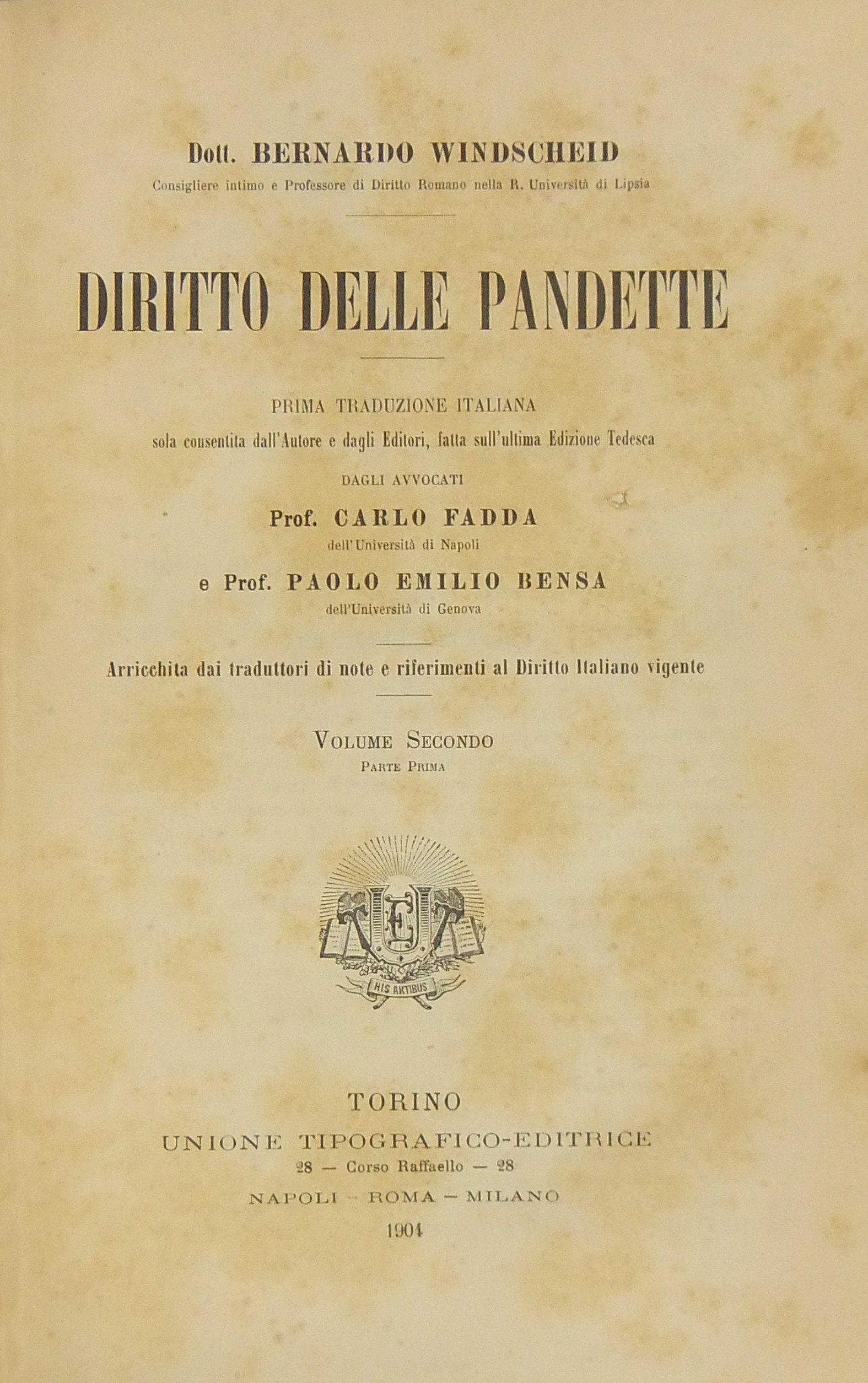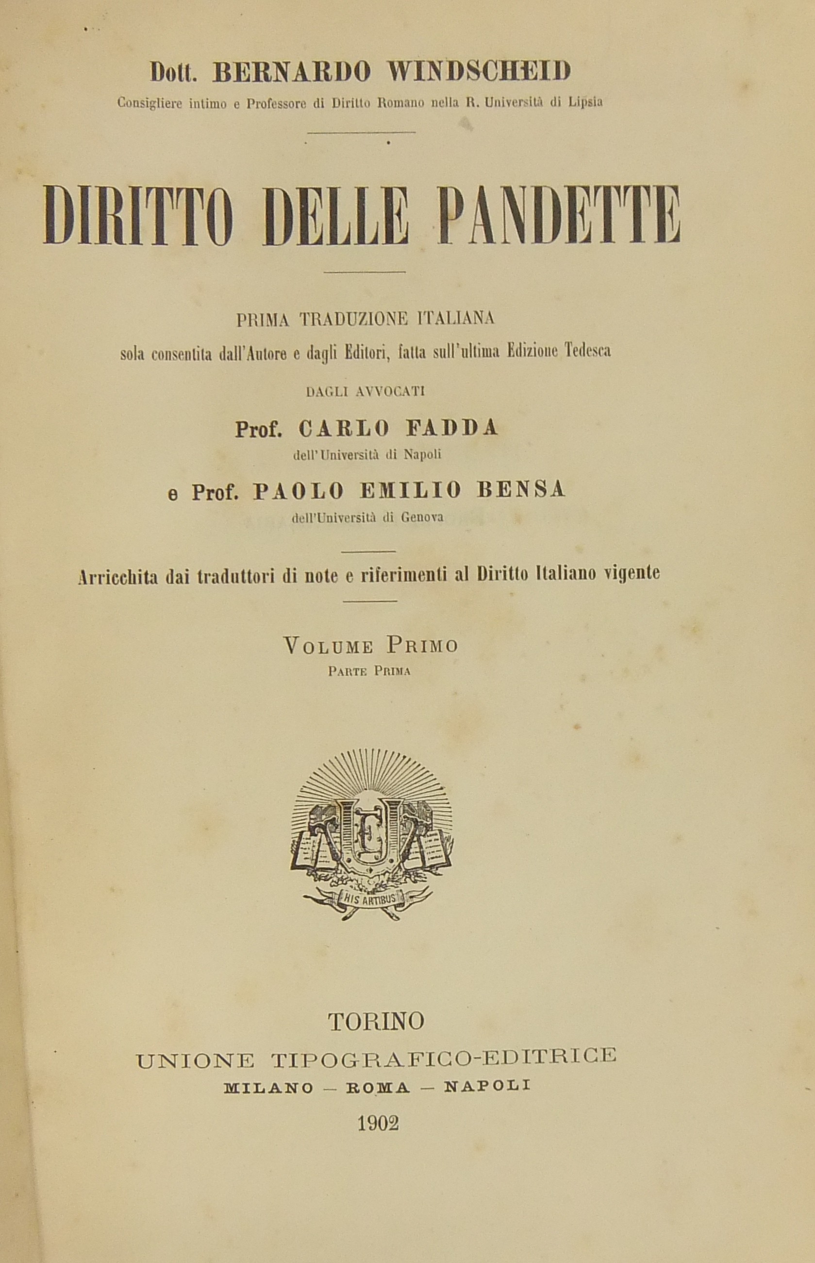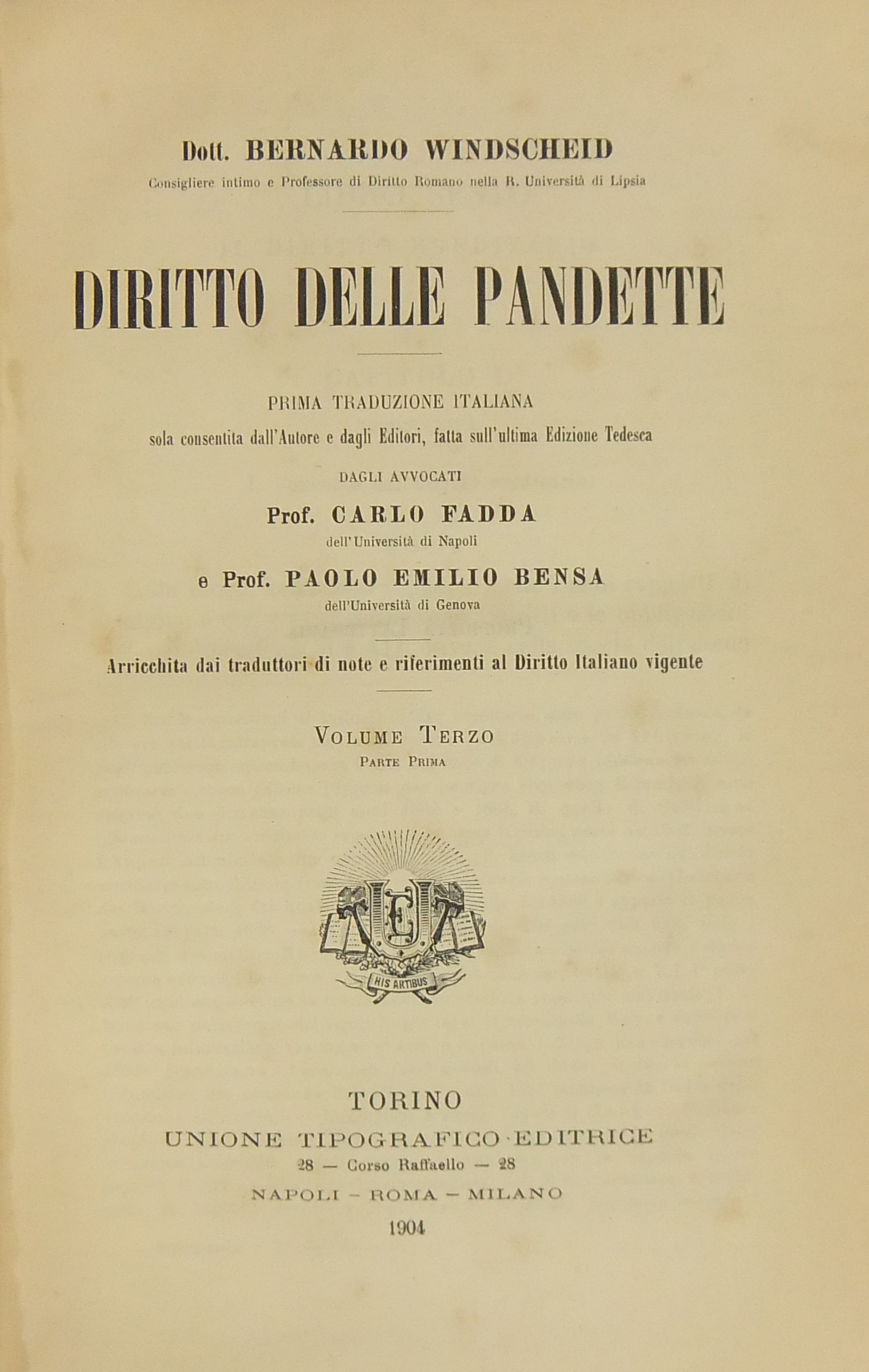 Diritto delle Pandette. Prima traduzione italiana... fatta sull'ultima edizione tedesca dagli Avvocati Prof. Carlo Fadda e Prof. Paolo Emilio Bensa arricchita dai traduttori di note e riferimenti al Diritto Italiano vigente. Vol. I, parte I - Introduzione; Note dei traduttori; Libro I - Del diritto in genere; Libro II - Dei diritti in generale. Vol. I, parte II - Libro III - Il diritto delle cose. Vol. II, parte I - Libro IV - Il diritto dei crediti. Vol. II, parte II - Libro IV - Il diritto dei crediti (Continuazione); Libro V - Il diritto di famiglia. Vol. III, parte I - Libro VI - Il diritto ereditario