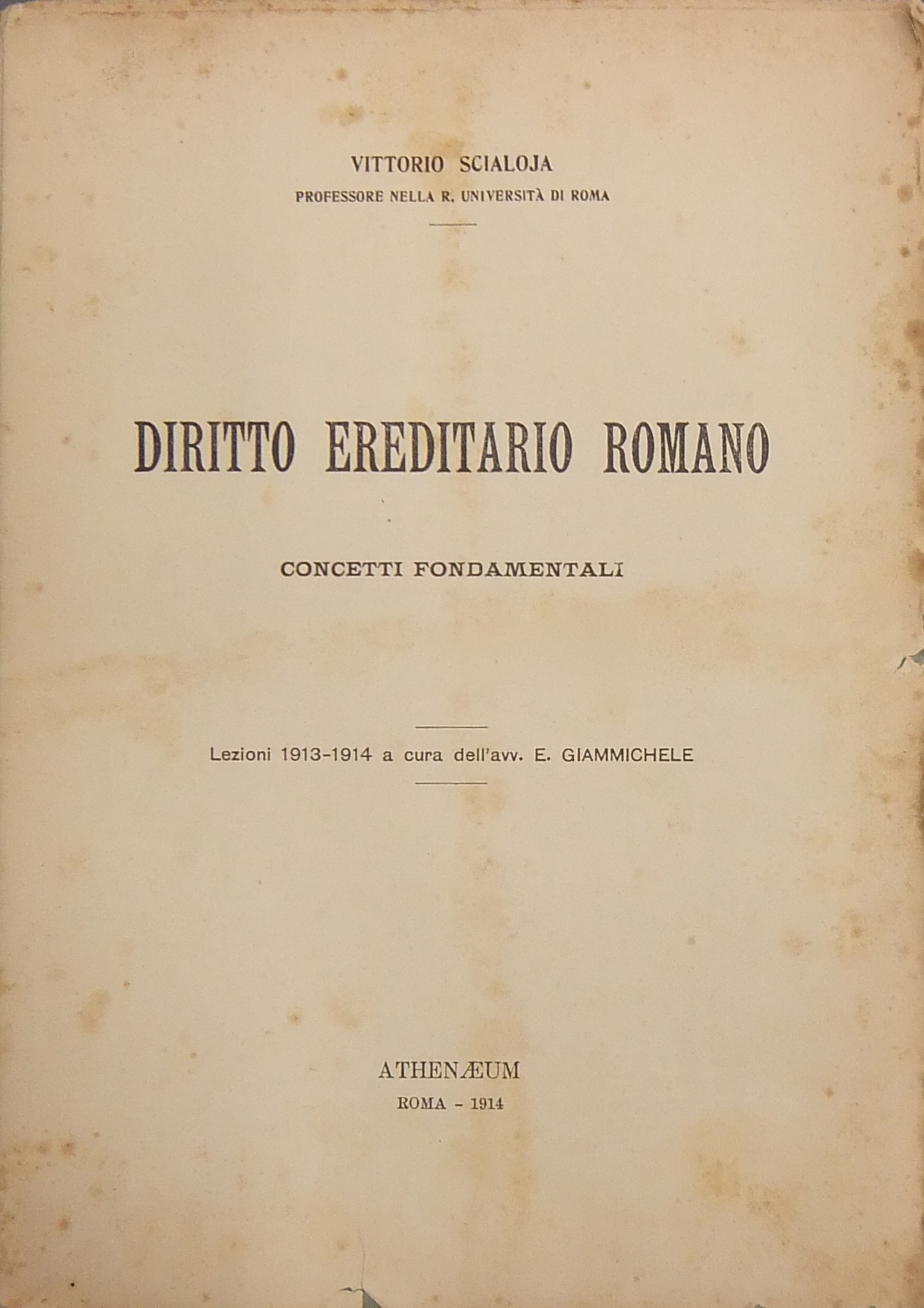 Diritto ereditario romano. Concetti fondamentali. Lezioni 1913-1914 a cura dell'Avv. E. Giammichele