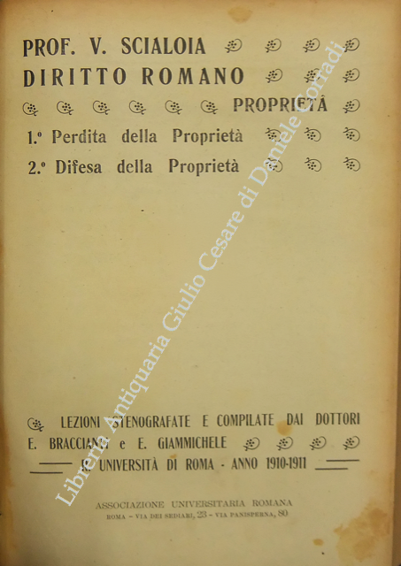 Diritto romano. Introduzione al corso 1910-1911. Concetto e definizione della proprietà. Limitazioni della proprietà. Modi di acquisto della proprietà. Lezioni compilate dai Dott. Giammichele e Braccianti. UNITO A: Diritto romano. Proprietà. 1° - Perdita della proprietà; 2° - Difesa della proprietà. Lezioni stenografate e compilate dai Dottori E. Braccianti e E. Giammichele. R. Università di Roma. Anno 1910-1911. pp. 590