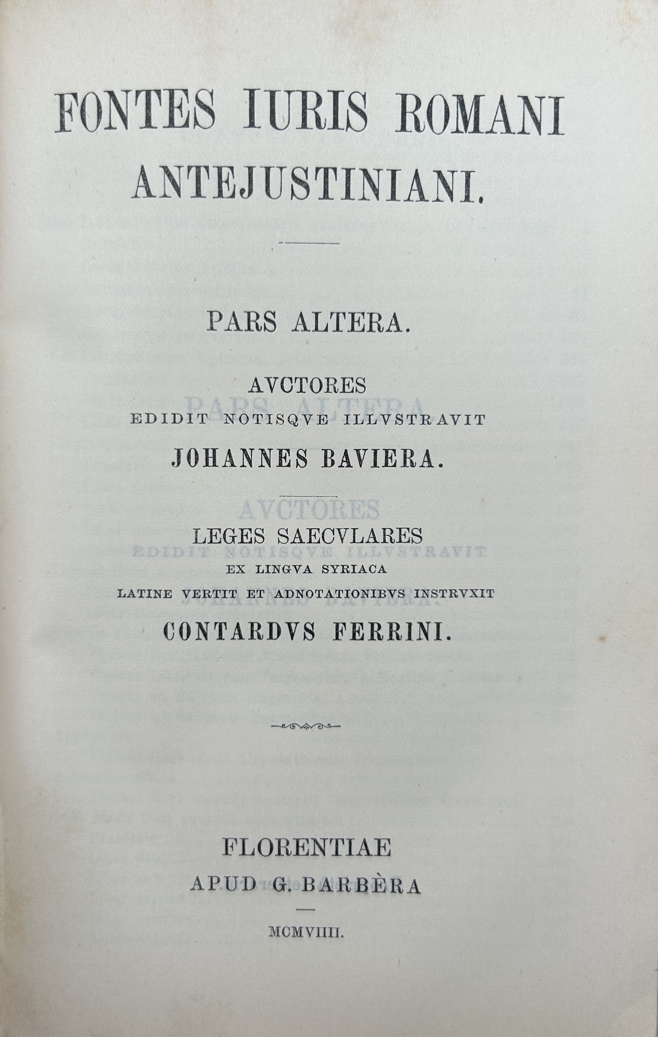 Fontes iuris romani antejustiniani. Pars Prima - Leges. Edidit notisque illustravit Salvator Riccobono. Pars Altera - Auctores edidit notisque illustravit Johannes Baviera. Leges saeculares ex lingua syriaca latine vertit et adnotatioibus instruxit Contardus Ferrini