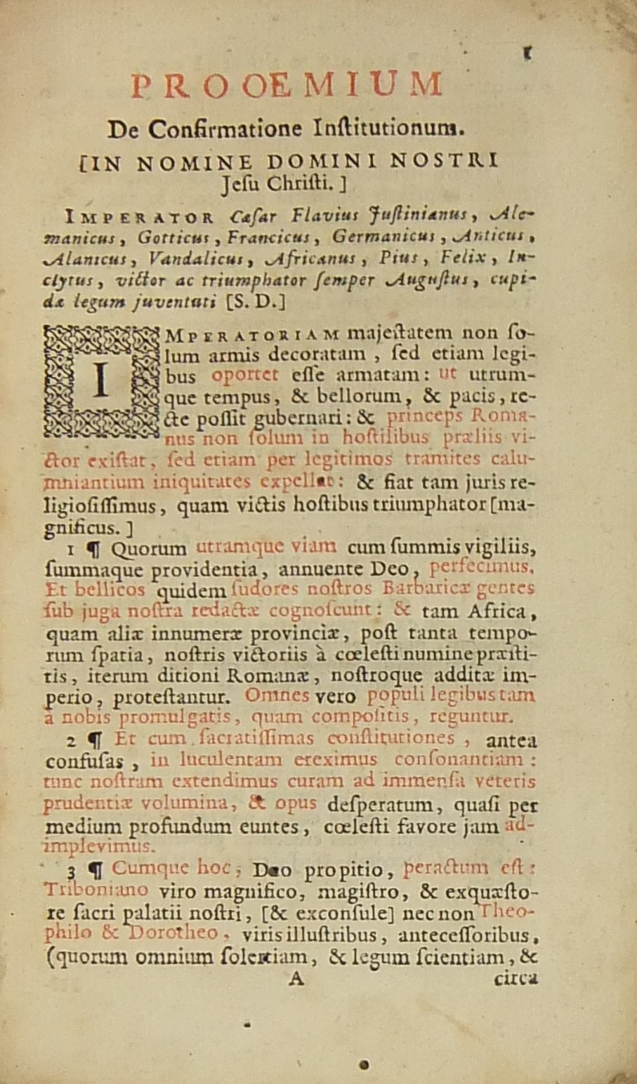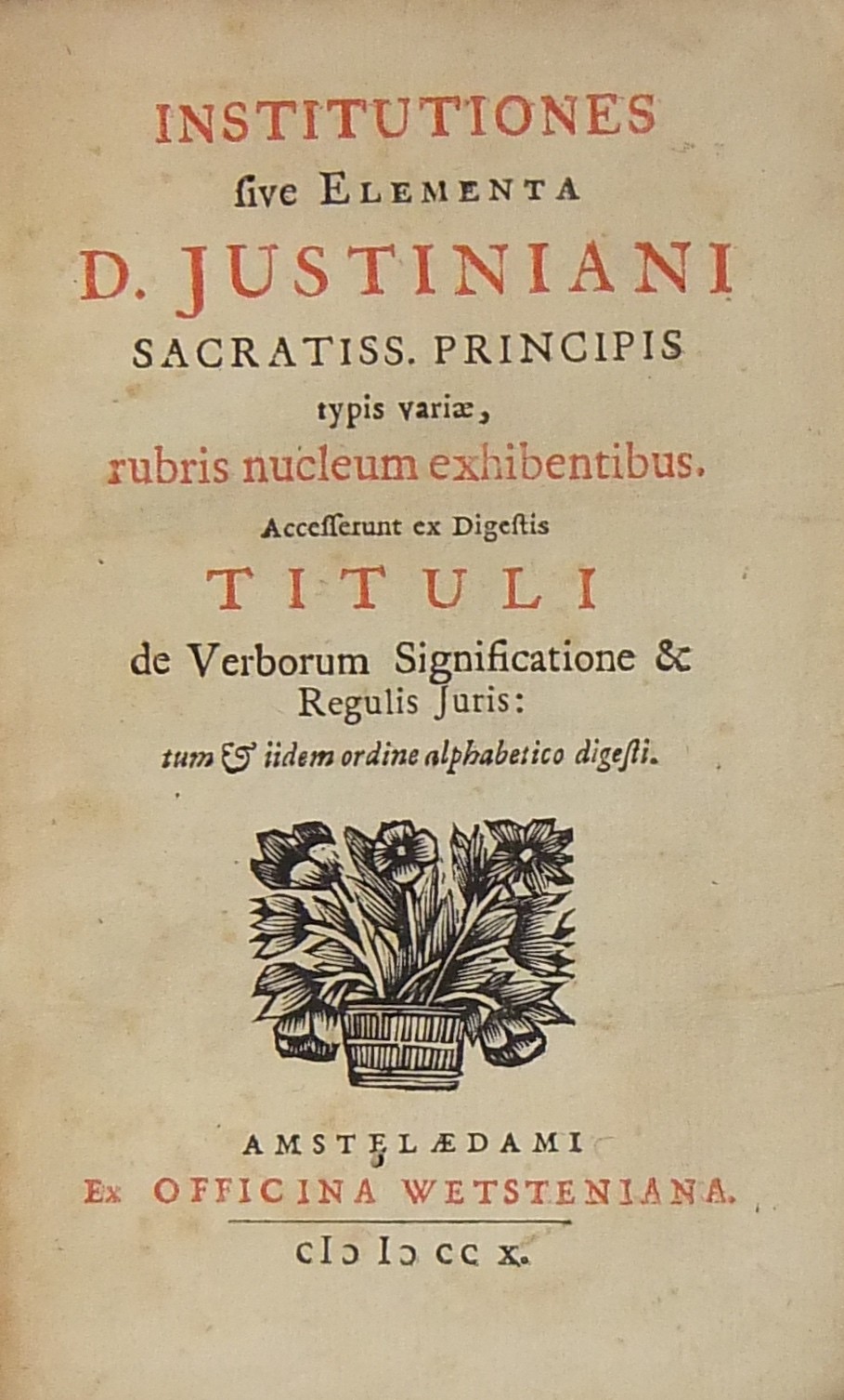 Institutiones sive Elementa D. Justiniani Sacratiss. Principis typis variae rubris nucleum exhibentibus. Accesserunt ex Digestis tituli de Verborum Significatione & Regulis Juris tum & iidem ordine alphabetico digesti
