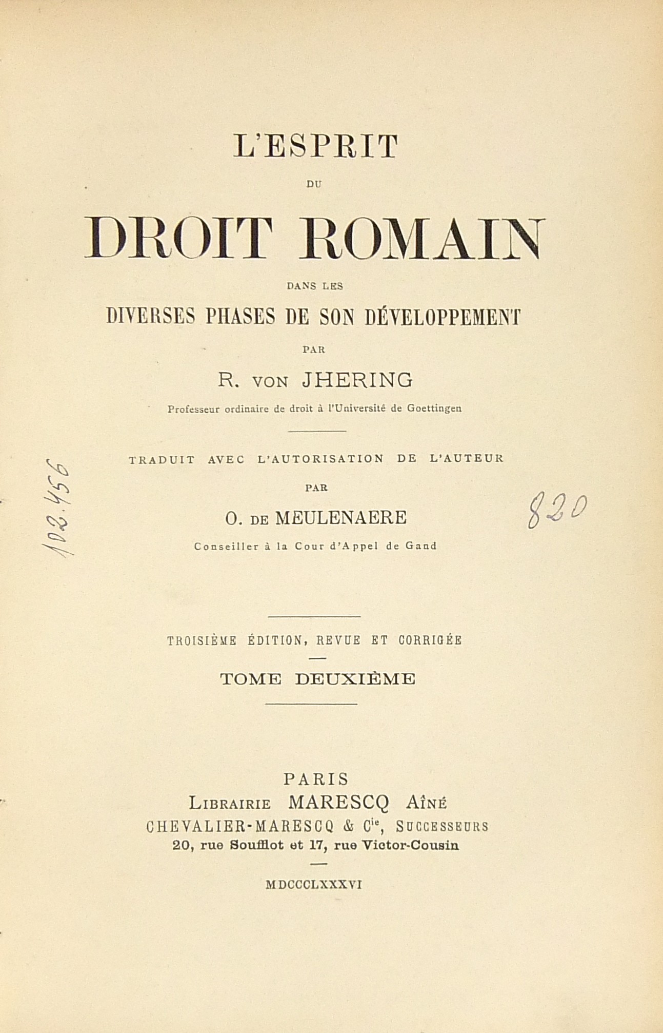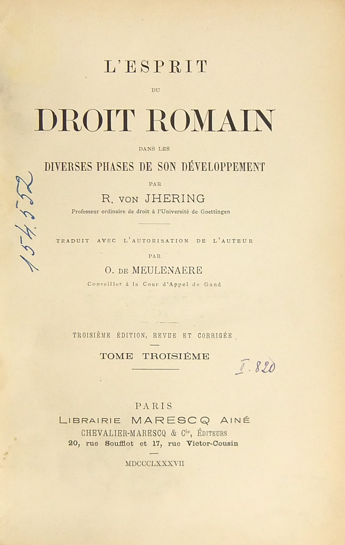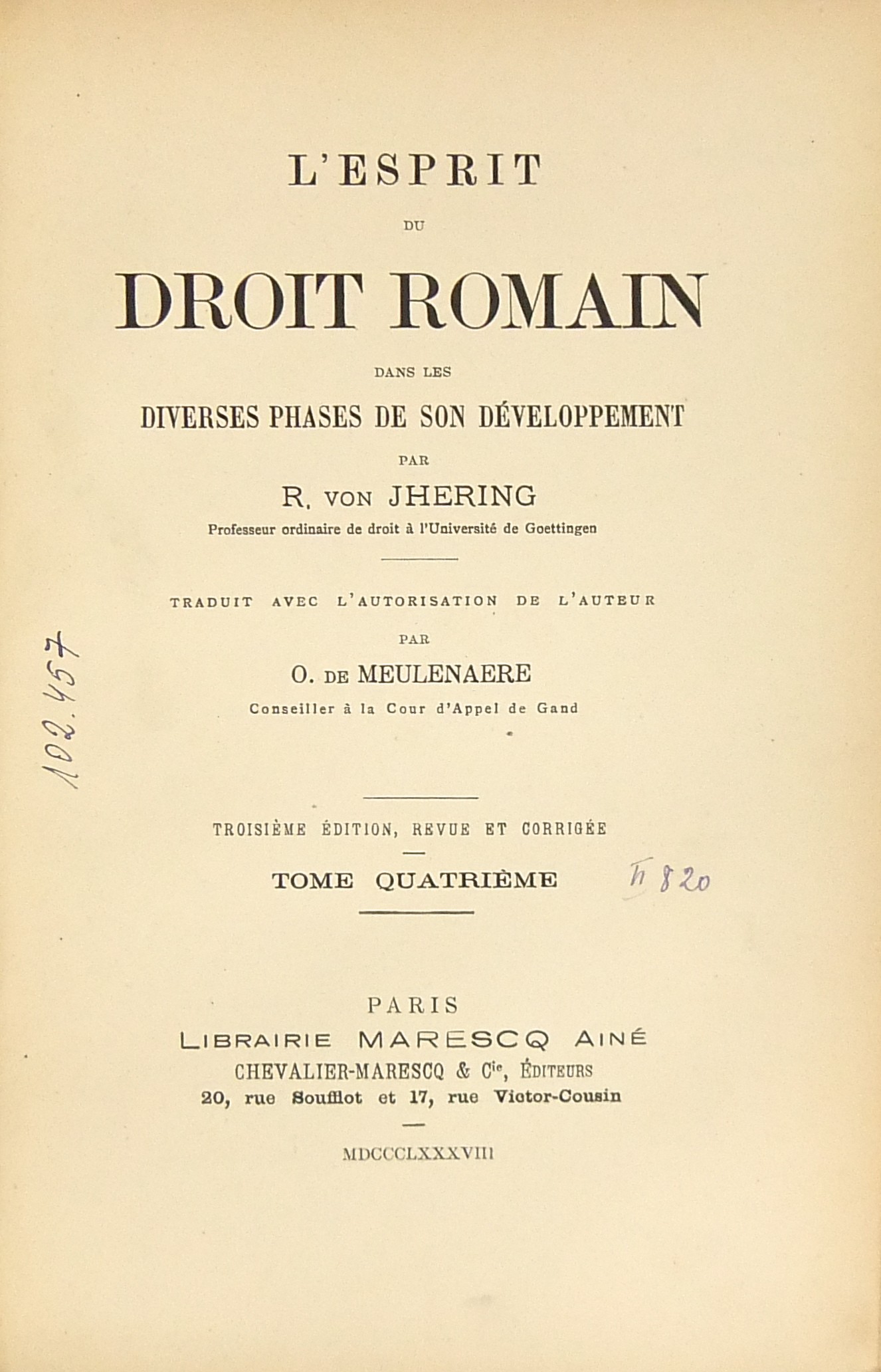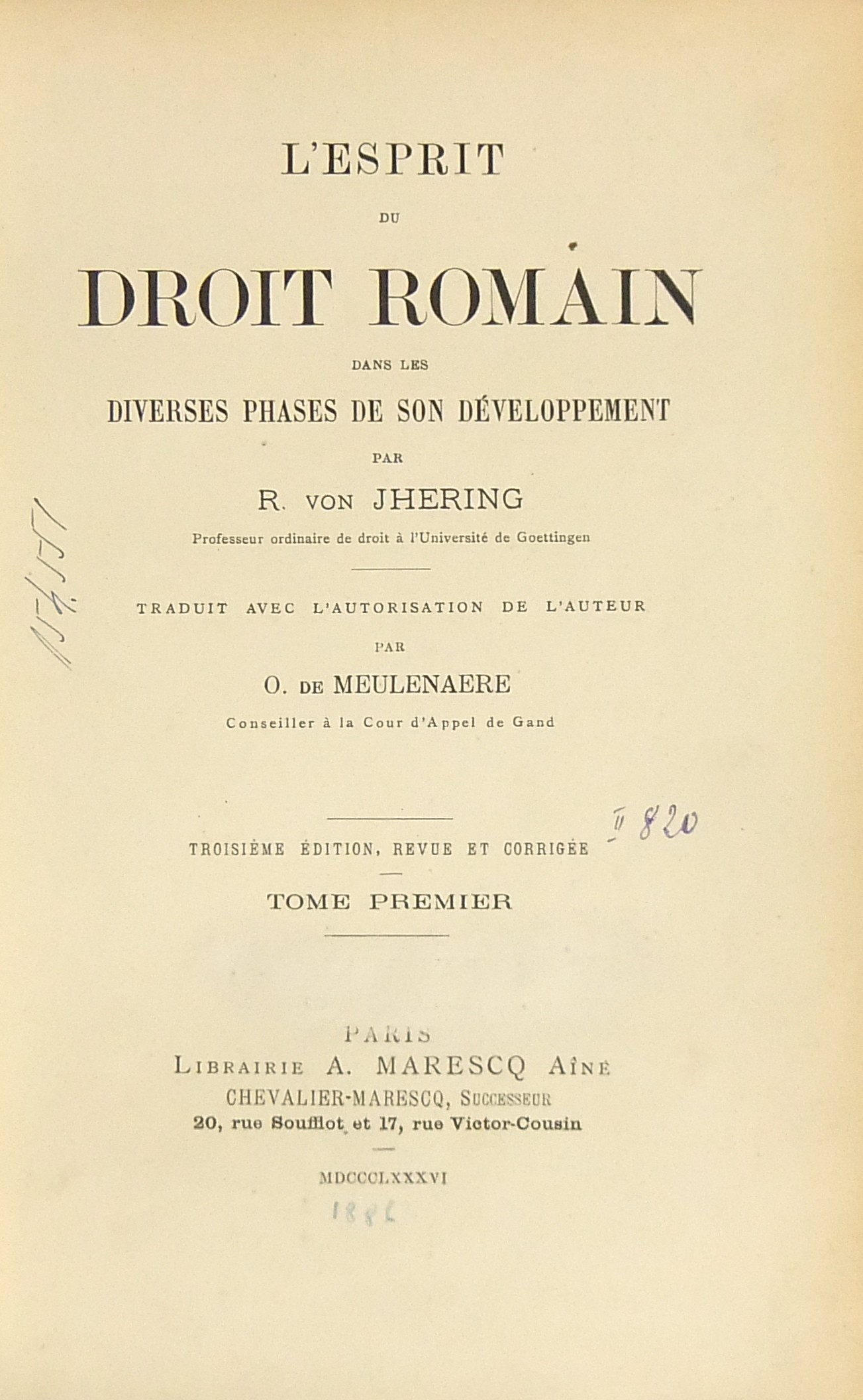 L'esprit du droit romain dans les diverses phases de son developpement. Traduit avec l'autorisation de l'auteur par O. de Meulenaere