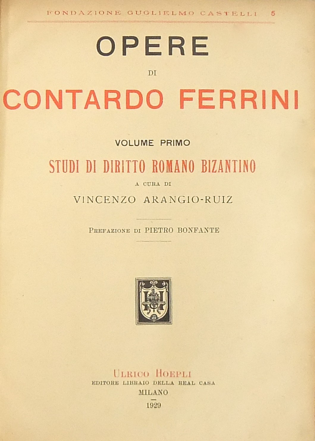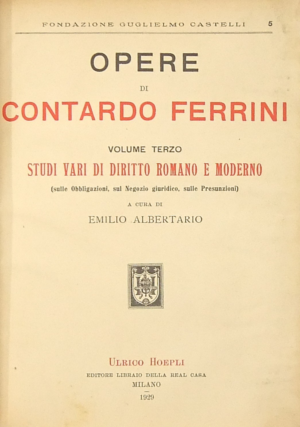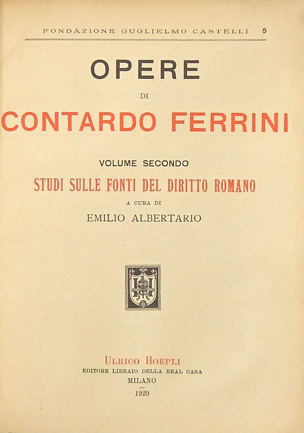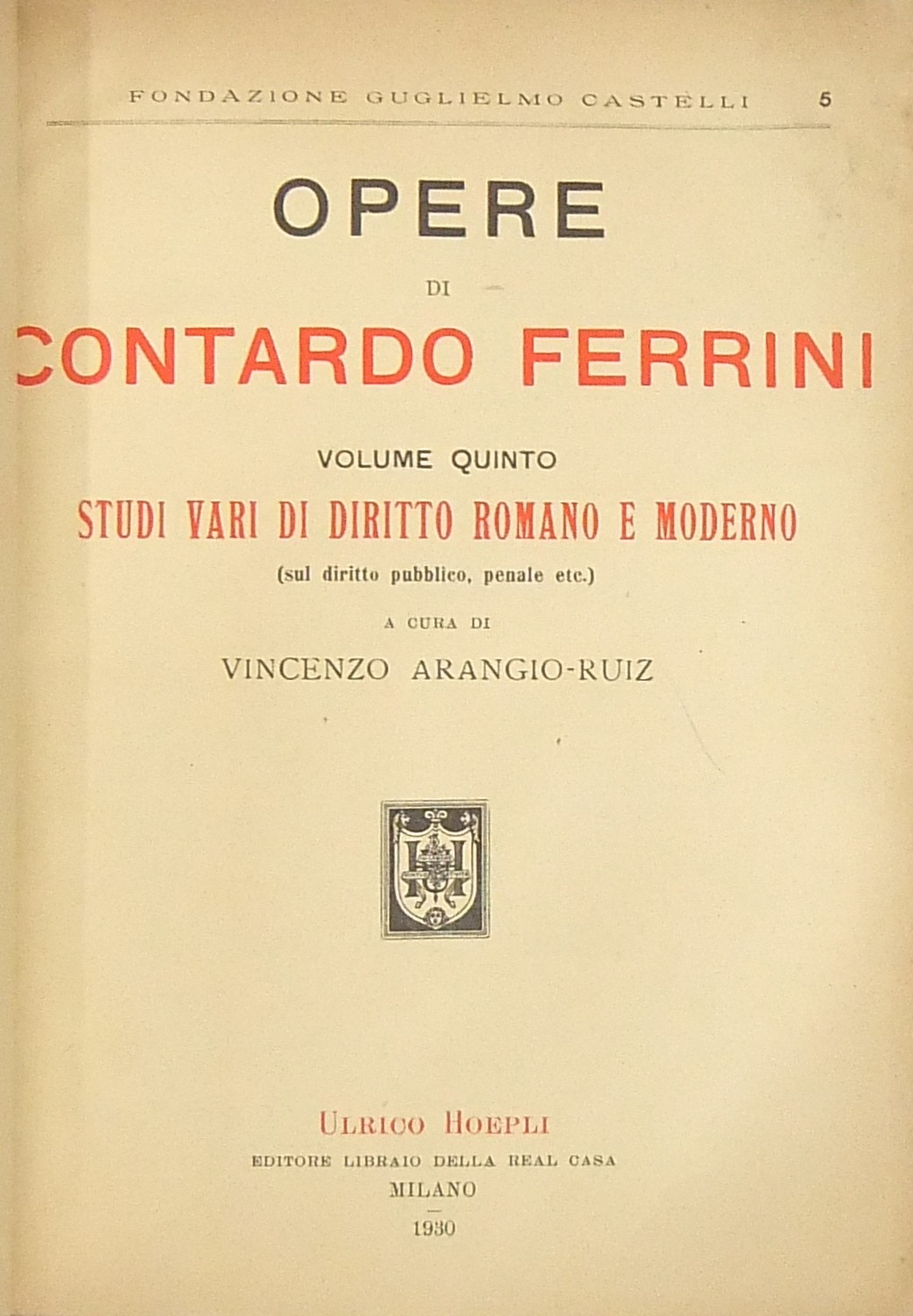 Opere. Prefazione di Pietro Bonfante. Vol. I - Studi di diritto romano bizantino (a cura di Vincenzo Arangio Ruiz); Vol. II - Studi sulle fonti del diritto romano (a cura di Emilio Albertario); Vol. III - Studi vari di diritto romano e moderno (sulle obbligazioni sul negozio giuridico sulle presunzioni) (a cura di Emilio Albertario); Vol. IV - Studi vari di diritto romano e moderno (sui diritti reali e di successione) (a cura di Pietro Ciapessoni); Vol. V - Studi vari di diritto romano e moderno (sul diritto pubblico penale etc.) (a cura di Vincenzo Arangio Ruiz)