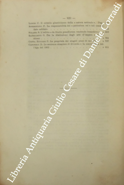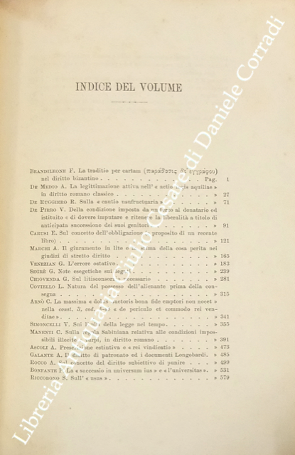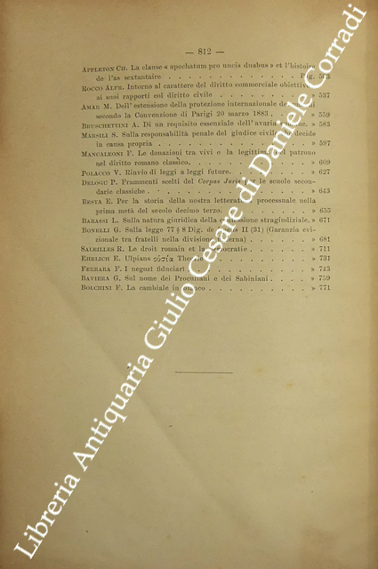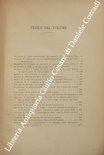 Scritti di: Abello, Alimena, Amar, Appleton, Arnò, Ascoli, Barassi, Baviera, Besta, Bolaffio, Bolchini, Bonelli, Bonfante, Brandileone, Brugi, Bruschettini, Caillemer, Caporali, Carusi, Chiovenda, Chironi, Coppa Zuccari, Coviello, Delogu, De Medio, De Pirro, De Ruggiero, Di Marzo, Ehrlich, Fedozzi, Ferrara, Galante, Lameire, Longo, Mancaleoni, Manenti, Marchi, Marsili, Meynial, Miceli, Navarrini, Perozzi, Pivano, Polacco, Ranelletti, Riccobono, Rocco, Ruffini, Saleilles, Scaduto, Schiappoli, Segrè, Siciliano Villanueva, Simoncelli, Solazzi, Sorrentino, Tamassia, Venezian.