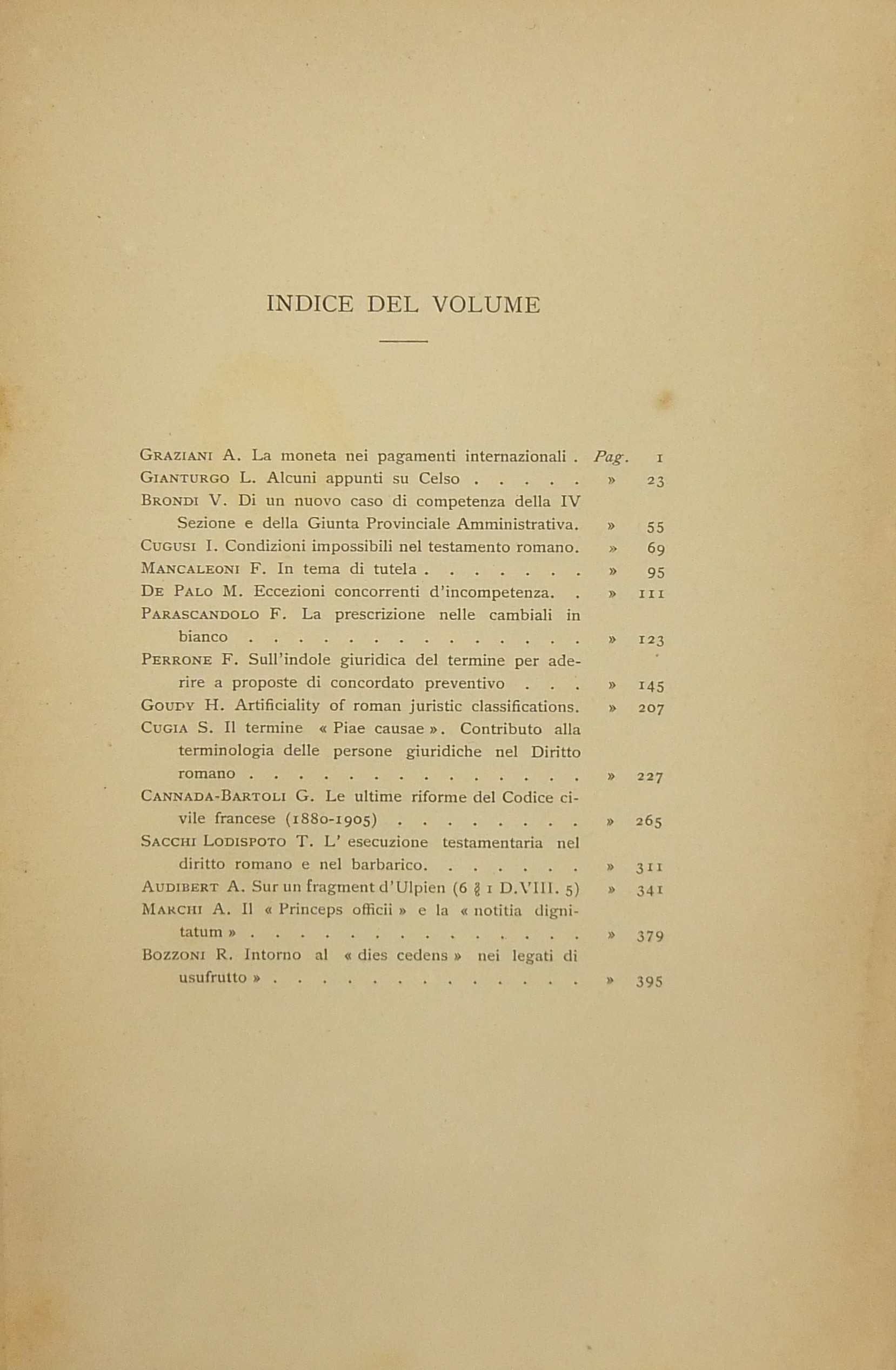 Scritti di: Audibert, Bozzoni, Brondi, Cannada Bartoli, Cugia, Cugusi, De Palo, Gianturco, Goudy, Graziani, Mancaleoni, Marchi, Parascandolo, Perrone, Sacchi Lodispoto.