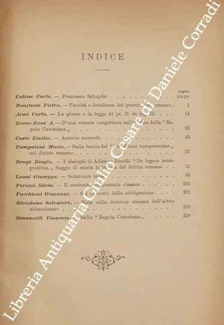 Scritti di: Arnò, Bonfante, Brugi, Calisse, Costa, Leoni, Pacchioni, Pampaloni, Perozzi, Riccobono, Simoncelli, Zocco-Rosa