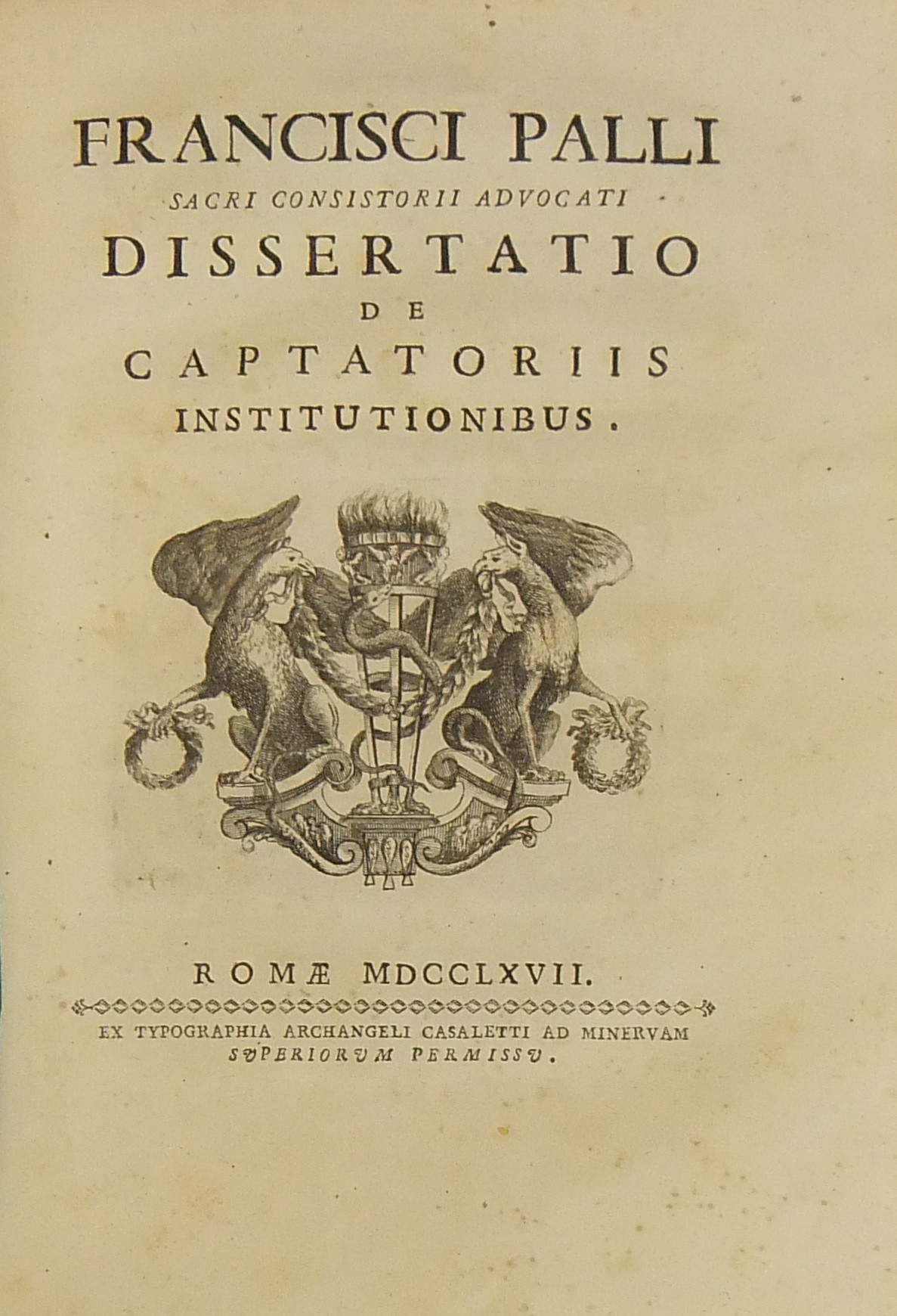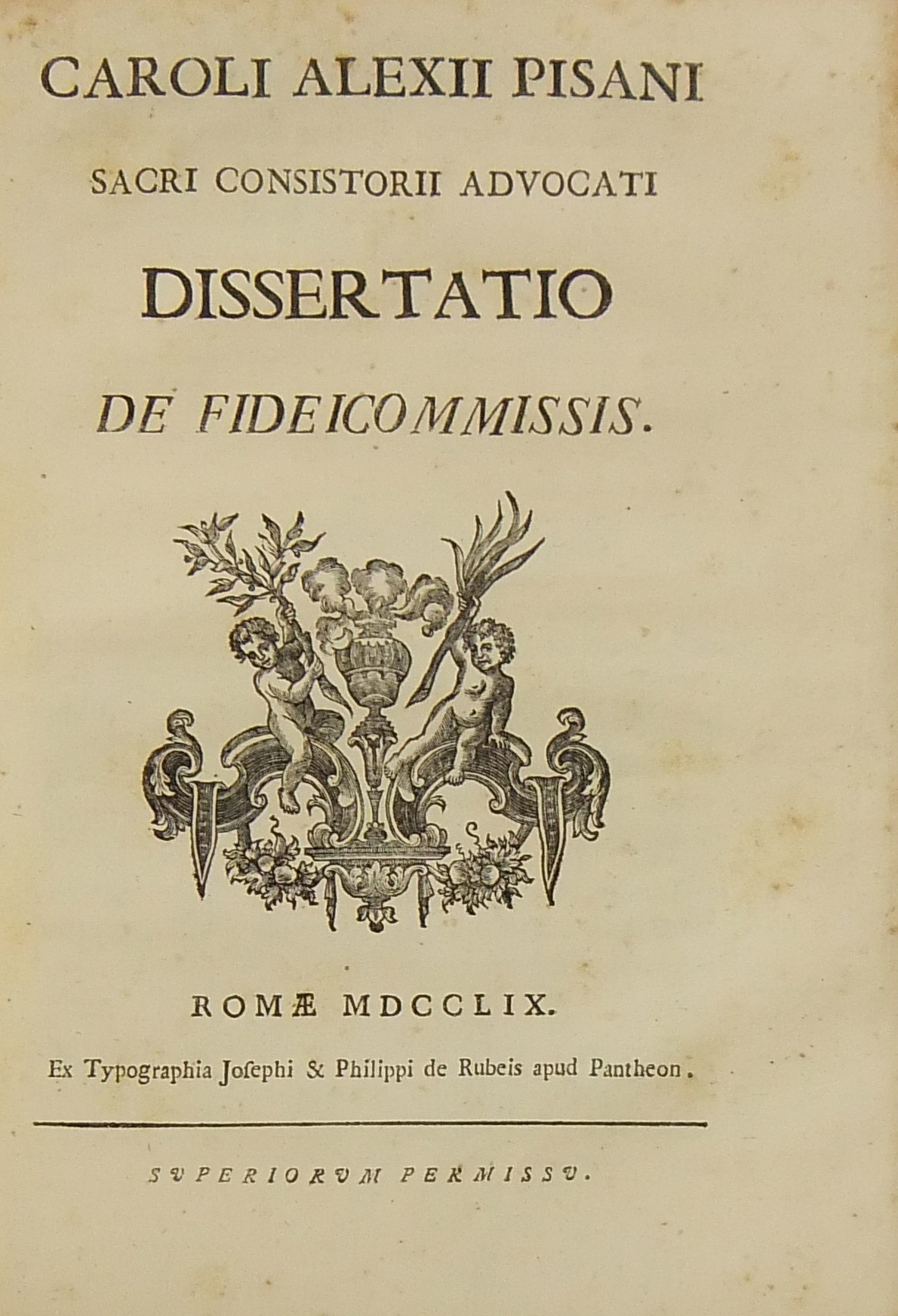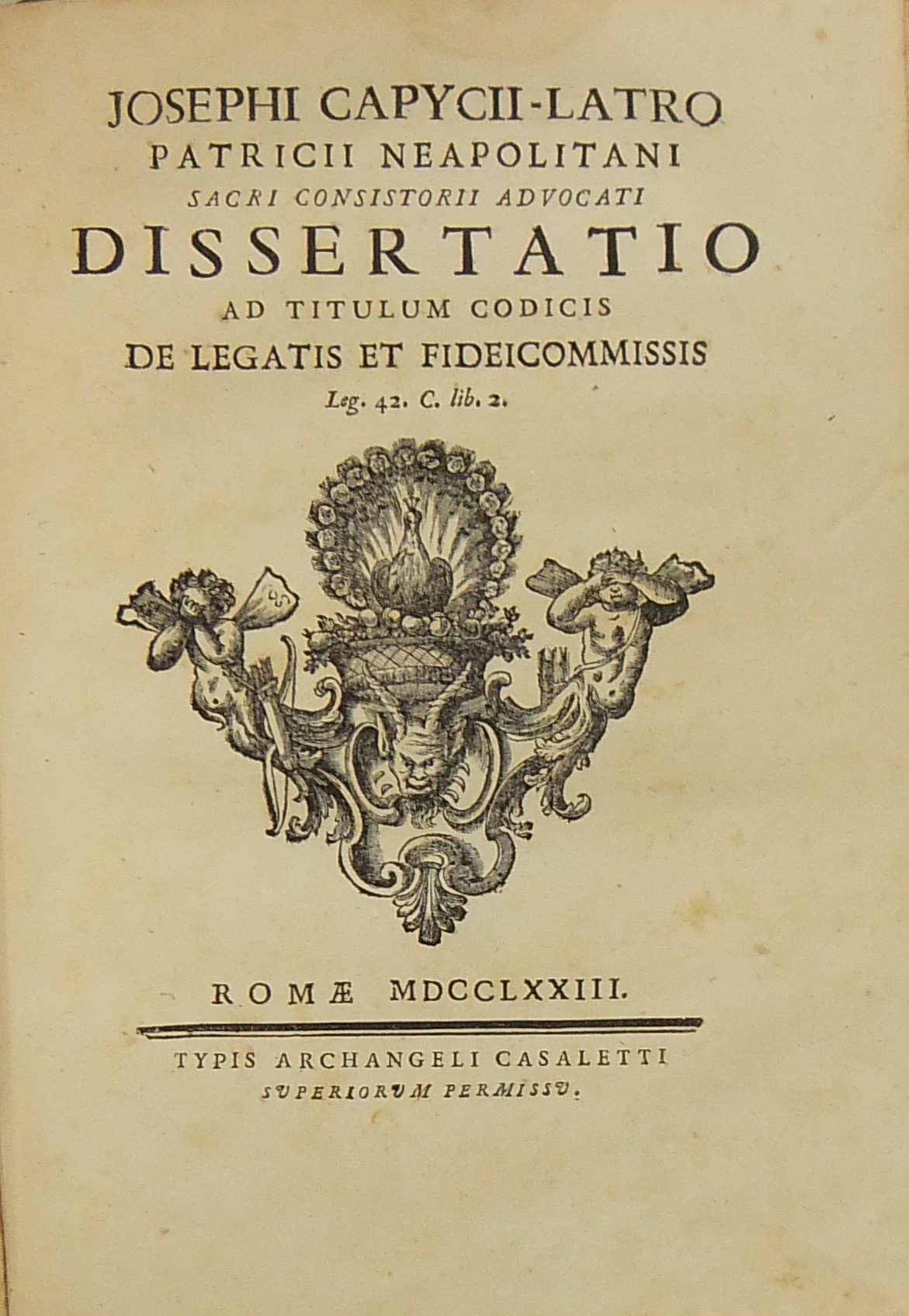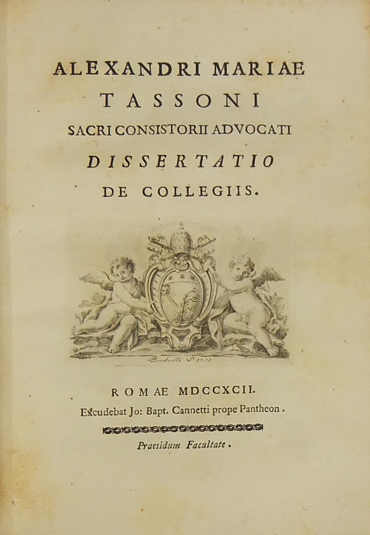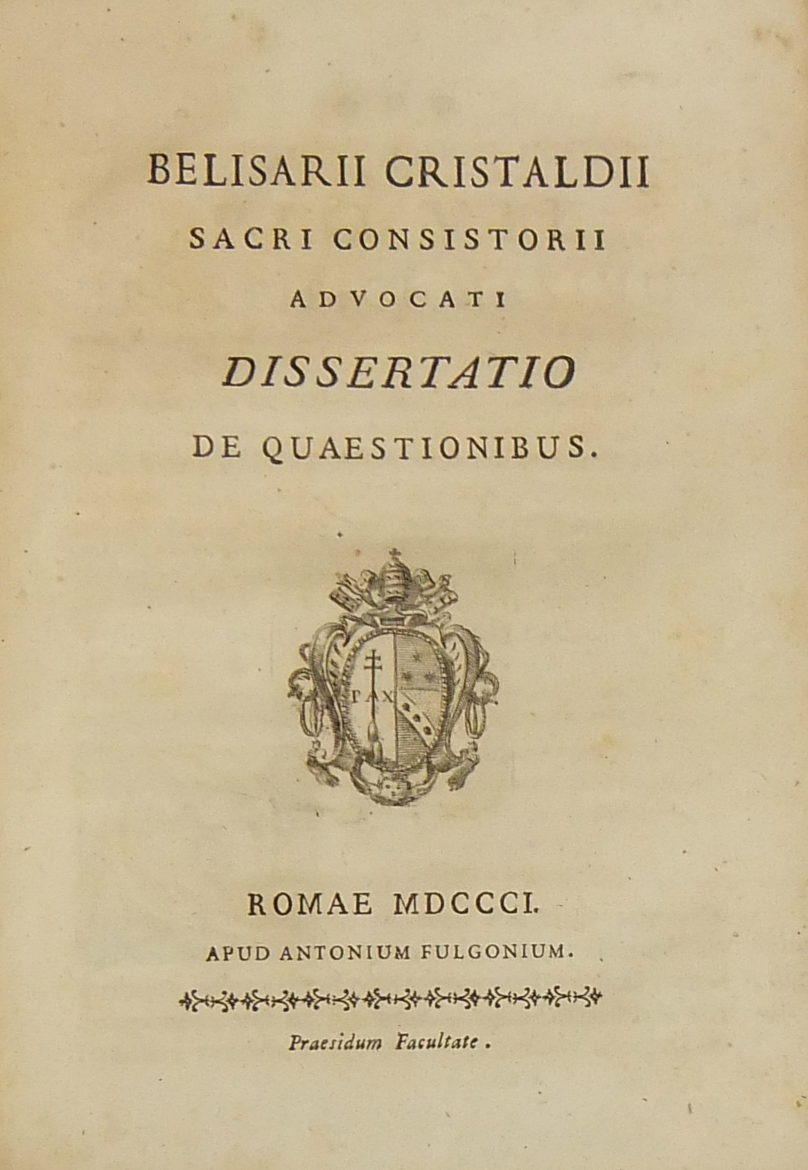 Alexandri Littae, Dissertatio de jure adcrescendi, 1745. Epistola R.P. Antonii Taveira ad Benedictum PP. XIV, 1758. Caroli Alexii Pisani, Dissertatio de fideicommisis, 1759. Francisci Palli, Dissertatio de captatoriis institutionibus, 1762. Dominici de Sancto Petro, Dissertatio de emancipationibus liberorum, 1767. Josephi Mariae Monti, Dissertatio de legitimazione, 1767. Caroli Aloysii Constantini, Dissertatio de poenis, 1769. Laurenti Prosperi Bottinii Lucensis, Dissertatio ad titulum codicis de repudiis, et judicio de moribus sublato, 1770. Antonii Dugnani, Dissertatio de alluvionibus, 1770. Josephi Capycii-Latro, Dissertatio ad titulum codicis de legatis et fideicommisis leg. 42, C, lib. 2, 1773. Josephi Morelli, Dissertatio de usuris, 1775. Josephi Capycii-Latro, Dissertatio ad titulum codicis de religiosis, et sumptibus funerum et c., 1779. Caroli Erskine, Dissertatio ad legem unicam codicis de monopoliis & c., 1783. Bernardini Mariscotti patricii Bononiensis, Dissertatio ad leg. unic. cod. de venat., 1784. Alphunsi de Aventis ferrariensis, Dissertatio de proportione monetarum, 1785. Vincentii Bartolucci, Dissertatio de viis publicis, 1786. Hieronymi Napulioni spoletini, Enarratio in titulum codicis de vectigalibus et commissis, 1792. Paschalis De Petro, Dissertatio de alea et aleatoribus, 1792. Alexandri Mariae Tassoni, Dissertatio de collegiis, 1792. Antonii Durini mediolanensis, Dissertatio ad legem I. Codicis de metallariis et metallis et procuratoribus metallorum, 1795. Belisarii Cristaldii, Dissertatio de quaestionibus, 1801. Hieronymi Bontadosi, Dissertatio de annonis, et tributis, s.d. Augustini Valle, Dissertatio de bonis ecclesiae, s.d. Augustini Valle, Dissertatio de bonis ecclesiae, s.d.