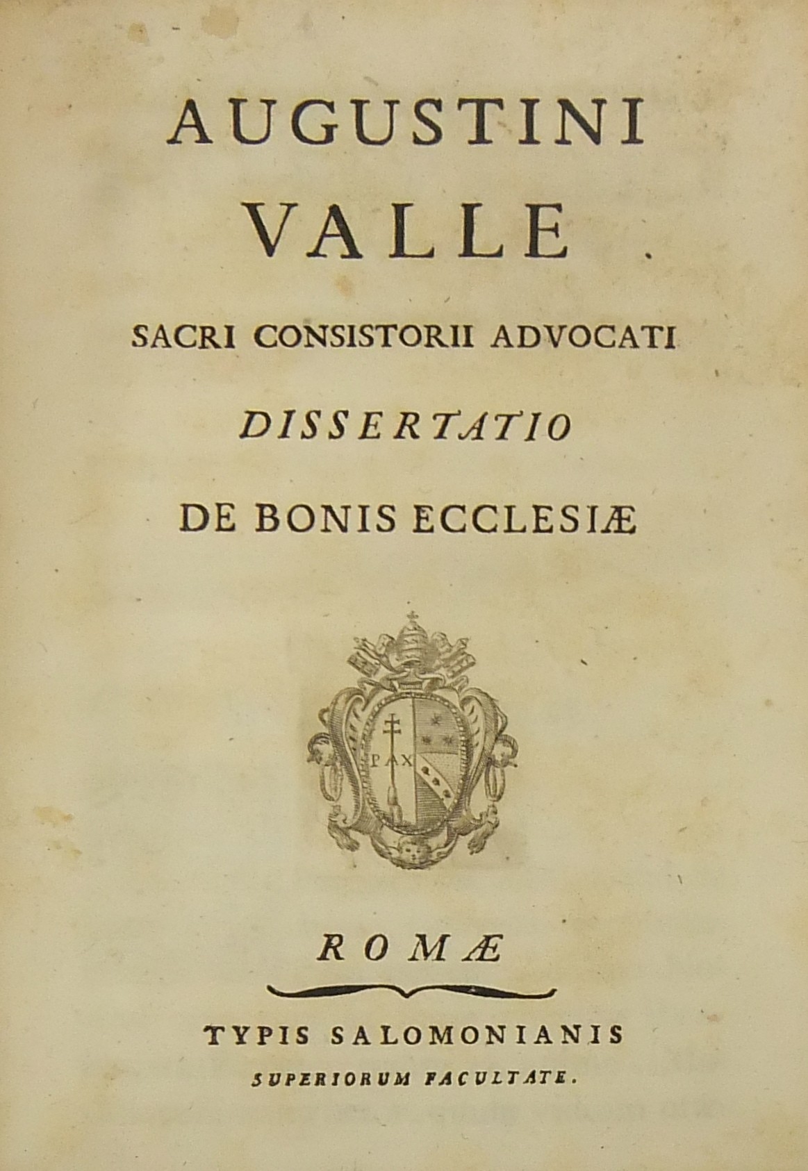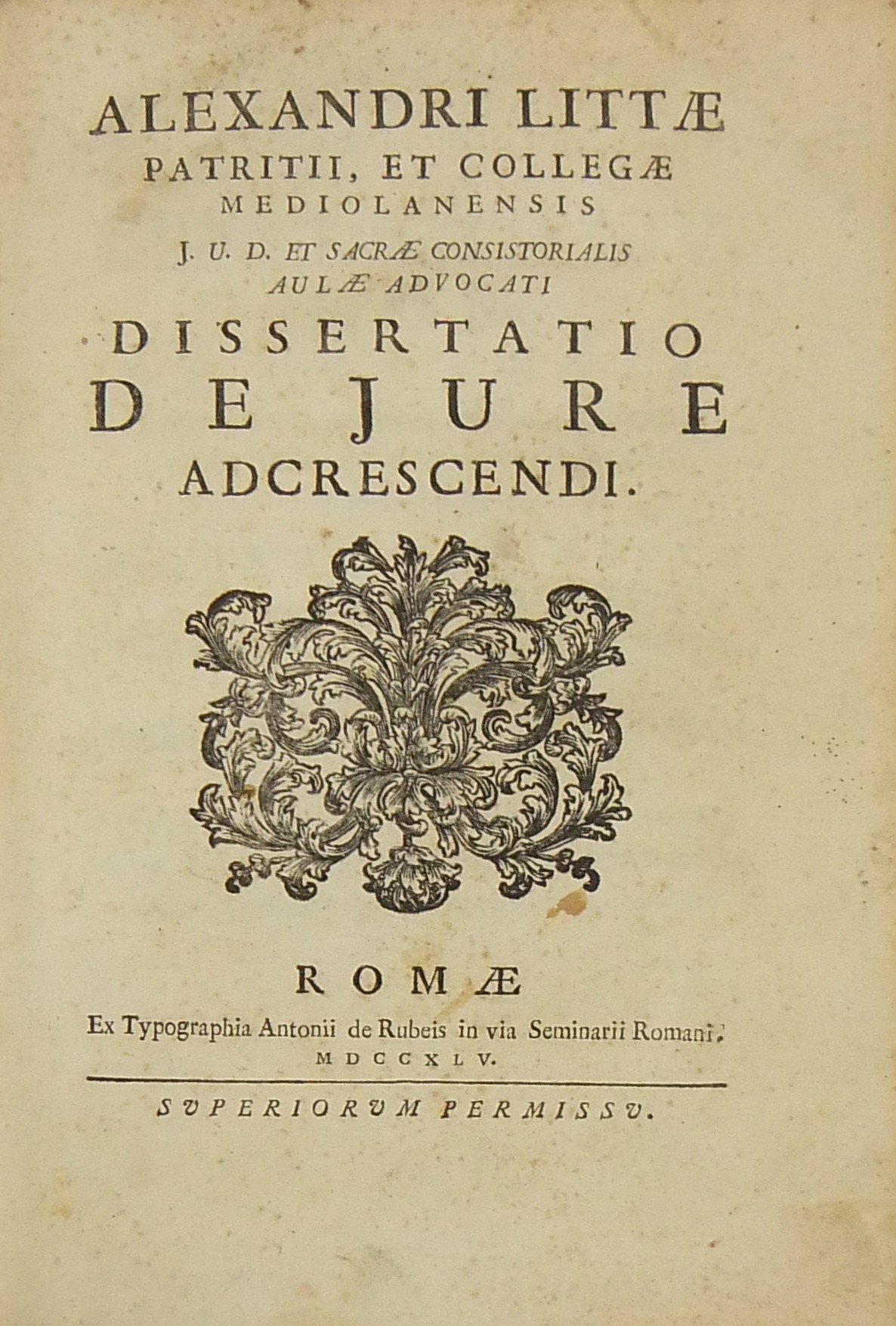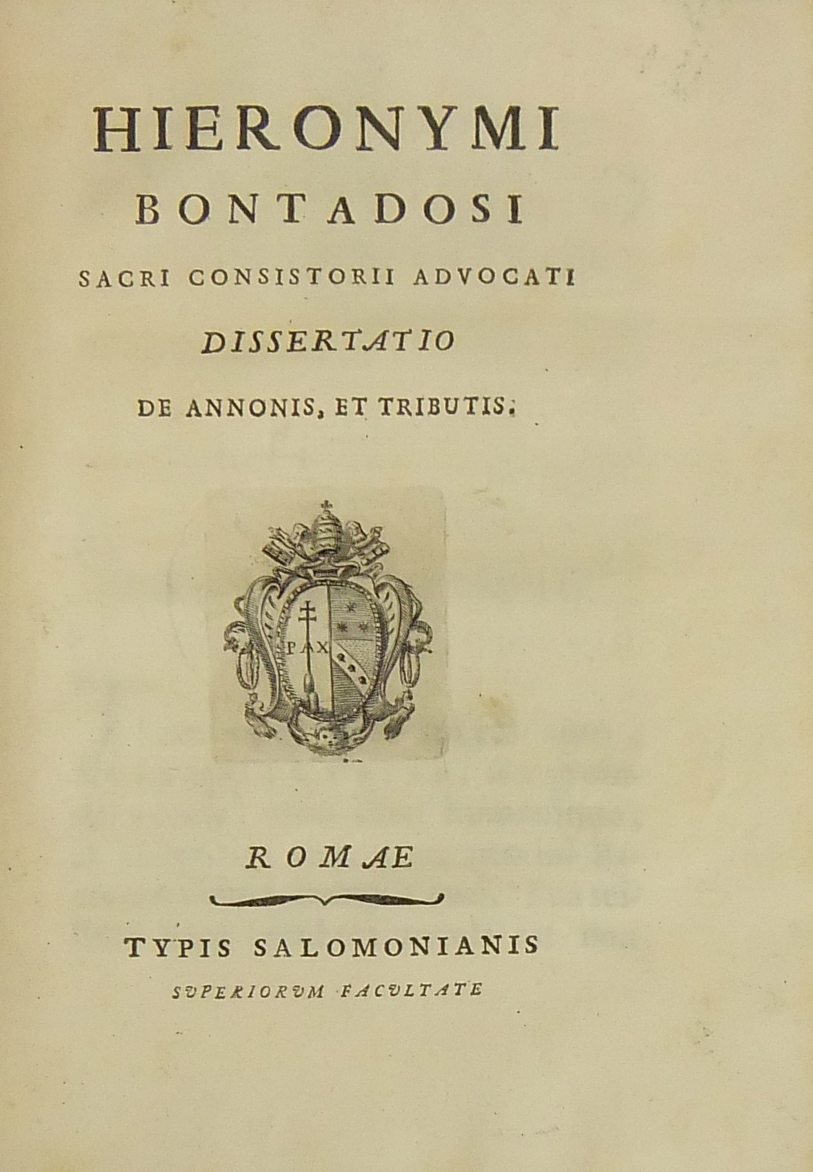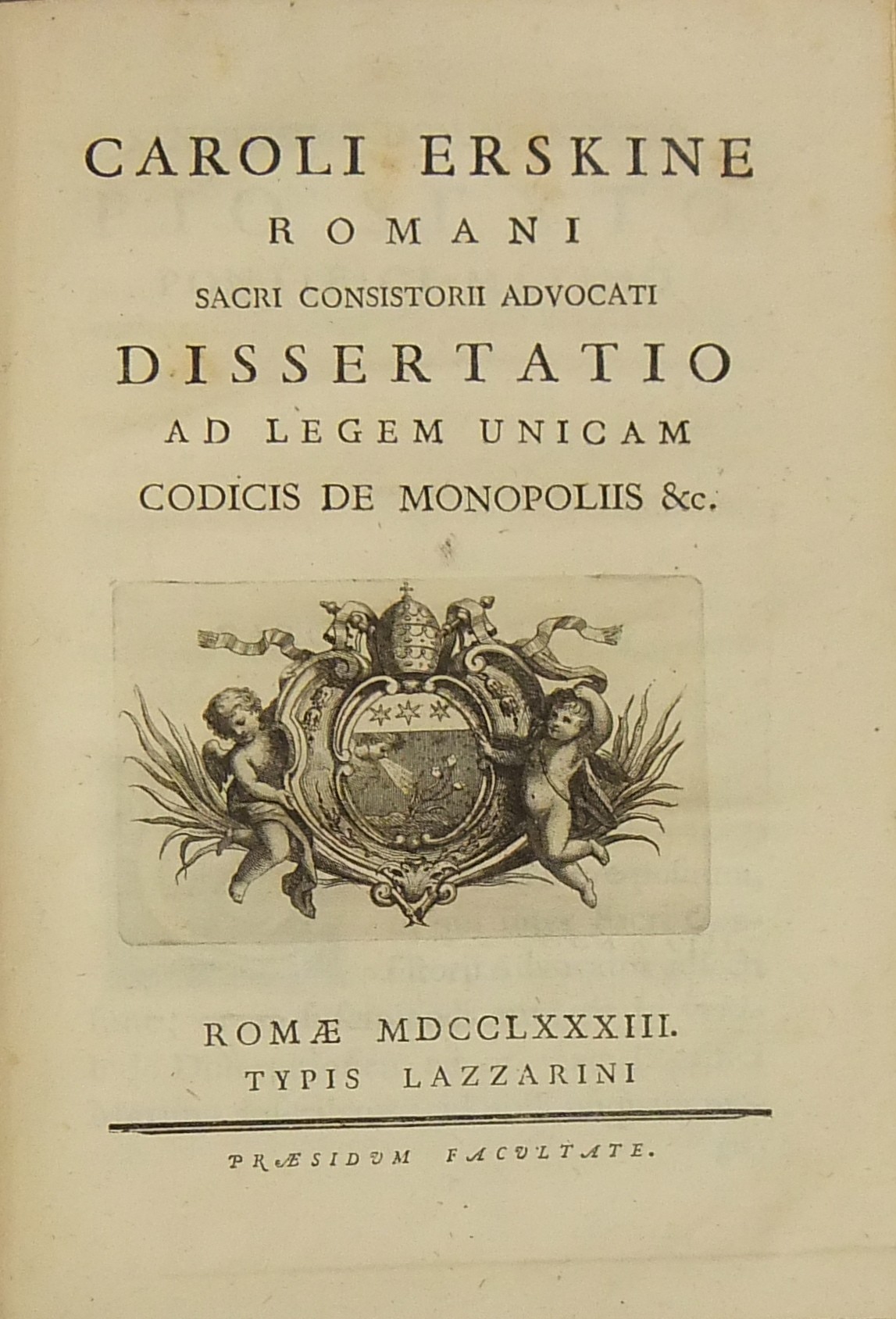 Alexandri Littae, Dissertatio de jure adcrescendi, 1745. Epistola R.P. Antonii Taveira ad Benedictum PP. XIV, 1758. Caroli Alexii Pisani, Dissertatio de fideicommisis, 1759. Francisci Palli, Dissertatio de captatoriis institutionibus, 1762. Dominici de Sancto Petro, Dissertatio de emancipationibus liberorum, 1767. Josephi Mariae Monti, Dissertatio de legitimazione, 1767. Caroli Aloysii Constantini, Dissertatio de poenis, 1769. Laurenti Prosperi Bottinii Lucensis, Dissertatio ad titulum codicis de repudiis, et judicio de moribus sublato, 1770. Antonii Dugnani, Dissertatio de alluvionibus, 1770. Josephi Capycii-Latro, Dissertatio ad titulum codicis de legatis et fideicommisis leg. 42, C, lib. 2, 1773. Josephi Morelli, Dissertatio de usuris, 1775. Josephi Capycii-Latro, Dissertatio ad titulum codicis de religiosis, et sumptibus funerum et c., 1779. Caroli Erskine, Dissertatio ad legem unicam codicis de monopoliis & c., 1783. Bernardini Mariscotti patricii Bononiensis, Dissertatio ad leg. unic. cod. de venat., 1784. Alphunsi de Aventis ferrariensis, Dissertatio de proportione monetarum, 1785. Vincentii Bartolucci, Dissertatio de viis publicis, 1786. Hieronymi Napulioni spoletini, Enarratio in titulum codicis de vectigalibus et commissis, 1792. Paschalis De Petro, Dissertatio de alea et aleatoribus, 1792. Alexandri Mariae Tassoni, Dissertatio de collegiis, 1792. Antonii Durini mediolanensis, Dissertatio ad legem I. Codicis de metallariis et metallis et procuratoribus metallorum, 1795. Belisarii Cristaldii, Dissertatio de quaestionibus, 1801. Hieronymi Bontadosi, Dissertatio de annonis, et tributis, s.d. Augustini Valle, Dissertatio de bonis ecclesiae, s.d. Augustini Valle, Dissertatio de bonis ecclesiae, s.d.