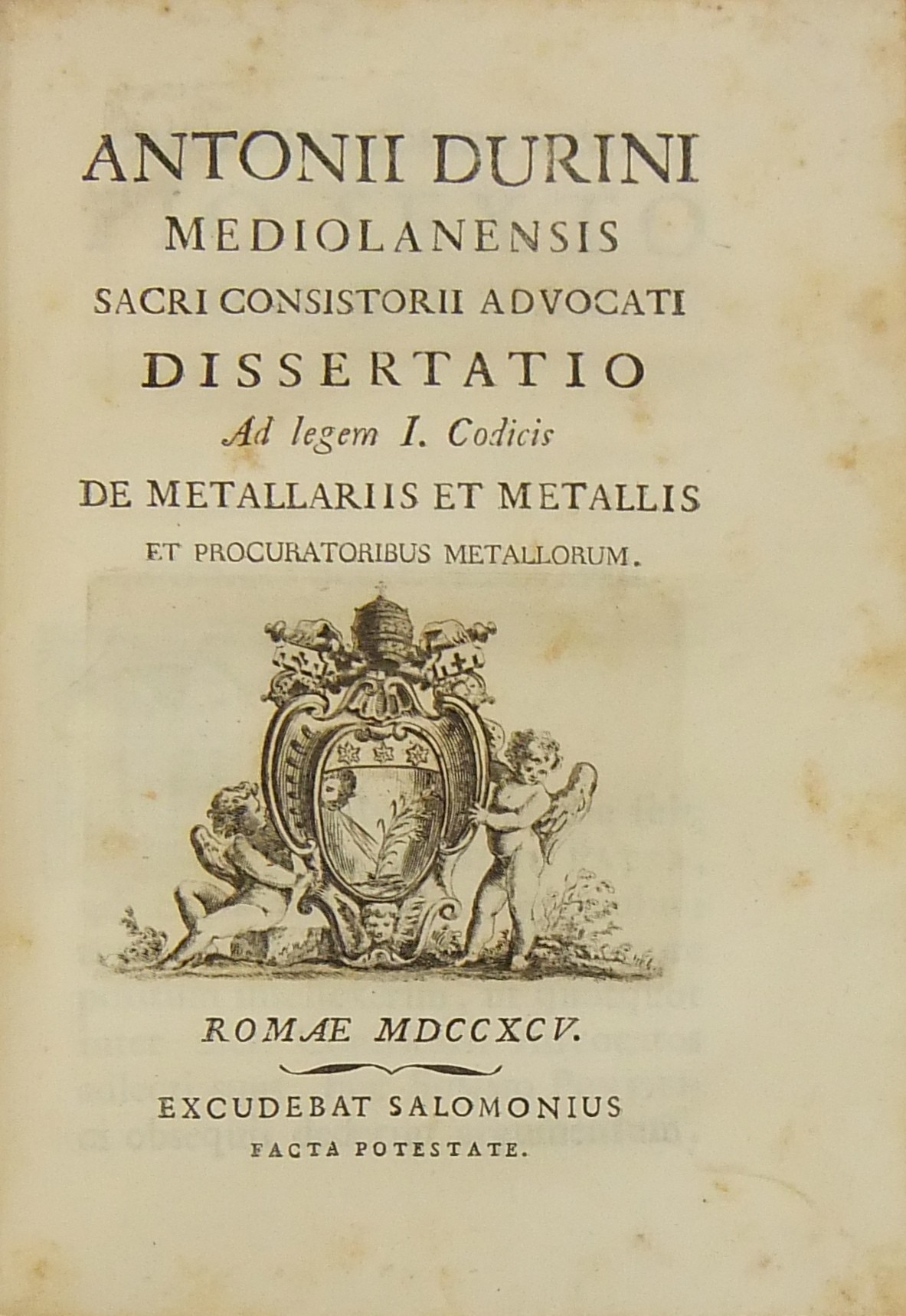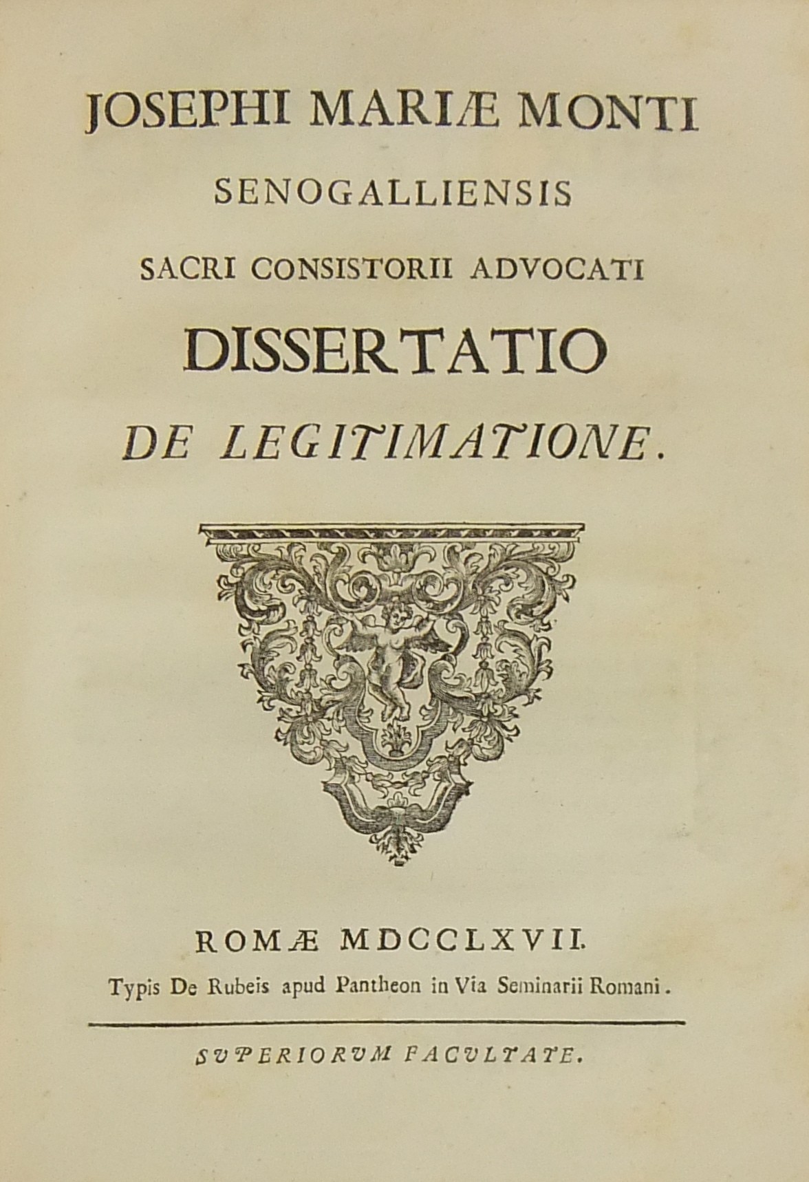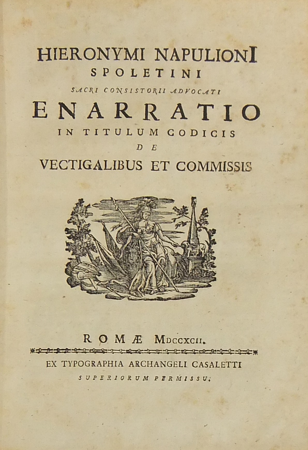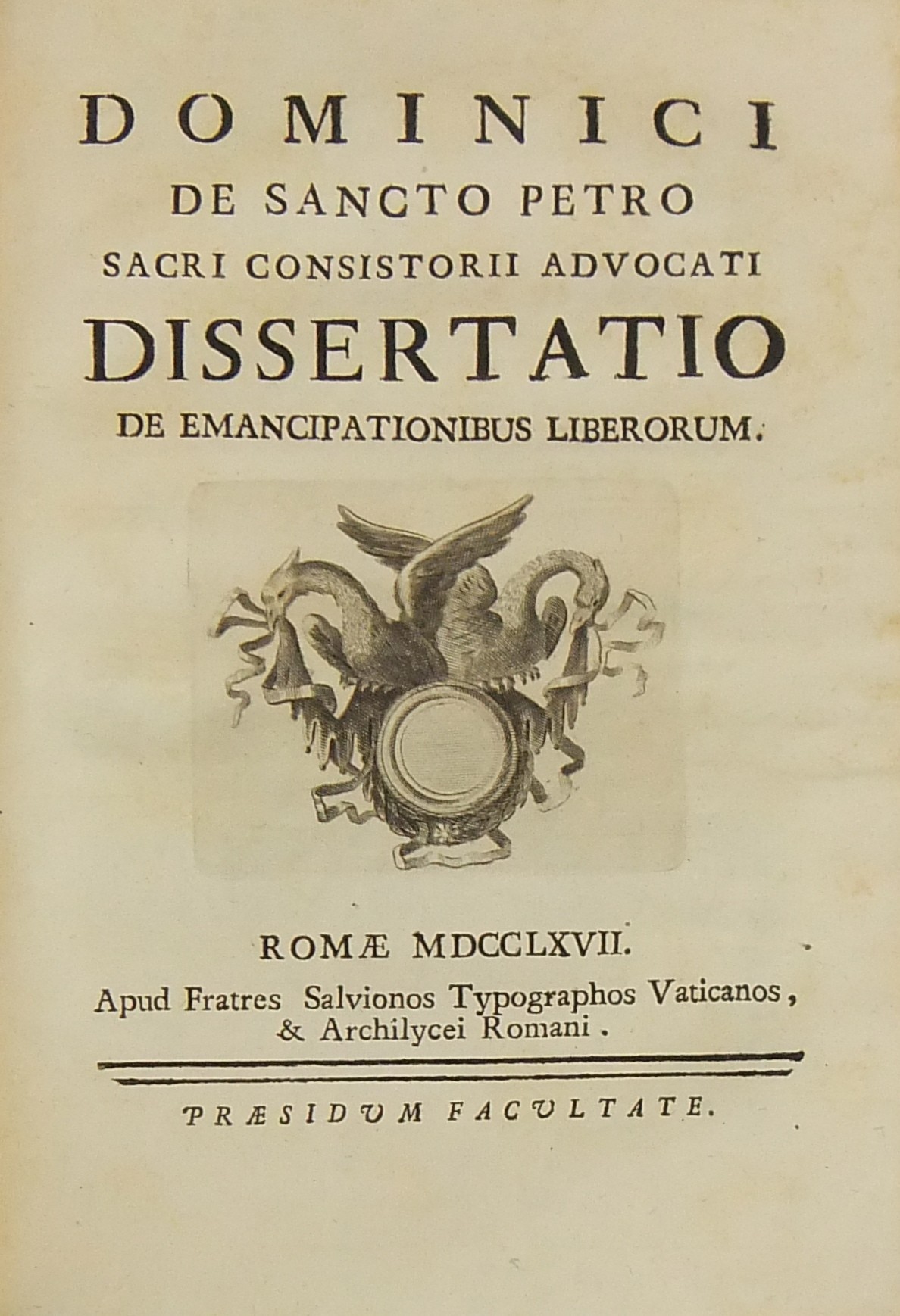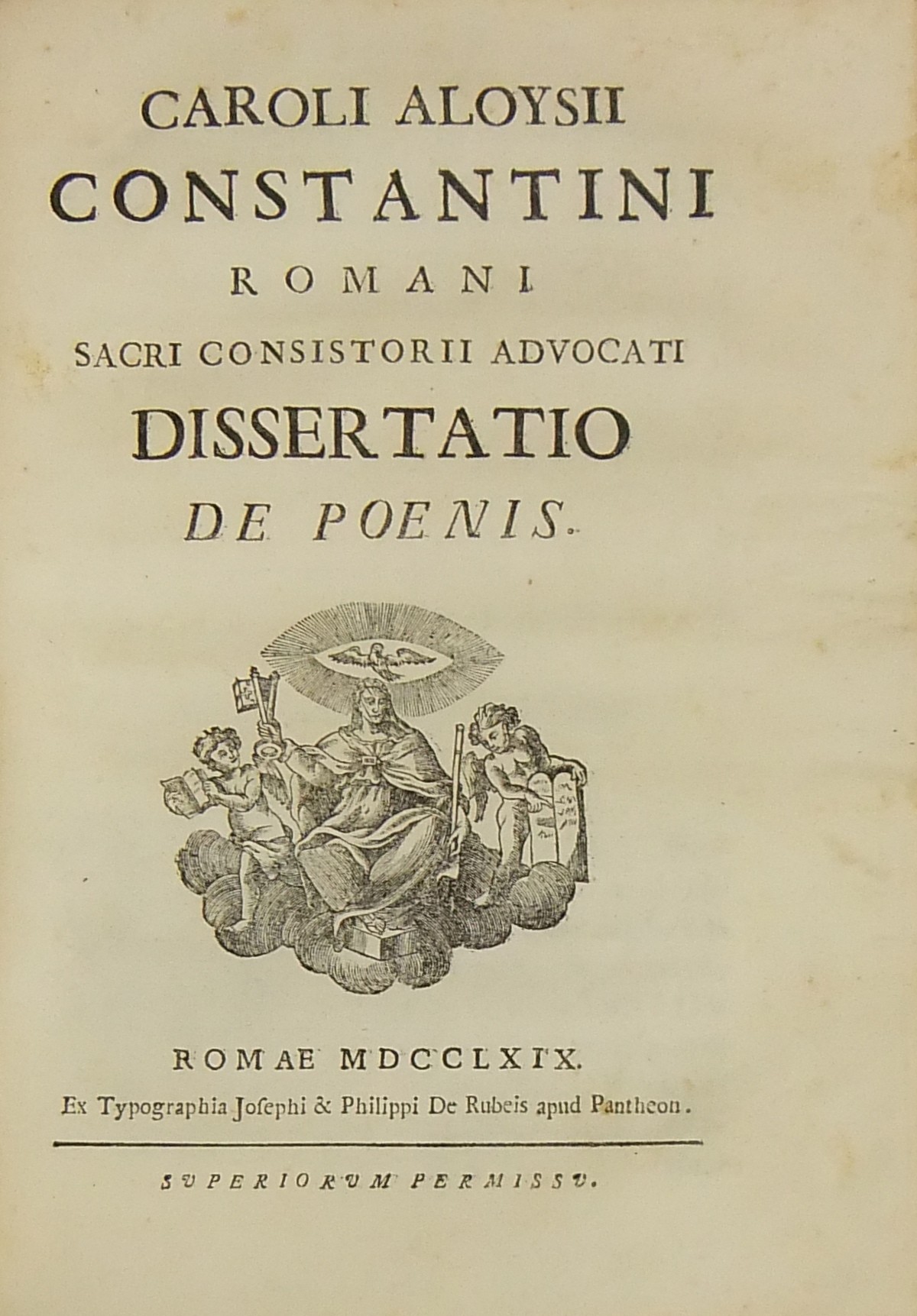 Alexandri Littae, Dissertatio de jure adcrescendi, 1745. Epistola R.P. Antonii Taveira ad Benedictum PP. XIV, 1758. Caroli Alexii Pisani, Dissertatio de fideicommisis, 1759. Francisci Palli, Dissertatio de captatoriis institutionibus, 1762. Dominici de Sancto Petro, Dissertatio de emancipationibus liberorum, 1767. Josephi Mariae Monti, Dissertatio de legitimazione, 1767. Caroli Aloysii Constantini, Dissertatio de poenis, 1769. Laurenti Prosperi Bottinii Lucensis, Dissertatio ad titulum codicis de repudiis, et judicio de moribus sublato, 1770. Antonii Dugnani, Dissertatio de alluvionibus, 1770. Josephi Capycii-Latro, Dissertatio ad titulum codicis de legatis et fideicommisis leg. 42, C, lib. 2, 1773. Josephi Morelli, Dissertatio de usuris, 1775. Josephi Capycii-Latro, Dissertatio ad titulum codicis de religiosis, et sumptibus funerum et c., 1779. Caroli Erskine, Dissertatio ad legem unicam codicis de monopoliis & c., 1783. Bernardini Mariscotti patricii Bononiensis, Dissertatio ad leg. unic. cod. de venat., 1784. Alphunsi de Aventis ferrariensis, Dissertatio de proportione monetarum, 1785. Vincentii Bartolucci, Dissertatio de viis publicis, 1786. Hieronymi Napulioni spoletini, Enarratio in titulum codicis de vectigalibus et commissis, 1792. Paschalis De Petro, Dissertatio de alea et aleatoribus, 1792. Alexandri Mariae Tassoni, Dissertatio de collegiis, 1792. Antonii Durini mediolanensis, Dissertatio ad legem I. Codicis de metallariis et metallis et procuratoribus metallorum, 1795. Belisarii Cristaldii, Dissertatio de quaestionibus, 1801. Hieronymi Bontadosi, Dissertatio de annonis, et tributis, s.d. Augustini Valle, Dissertatio de bonis ecclesiae, s.d. Augustini Valle, Dissertatio de bonis ecclesiae, s.d.
