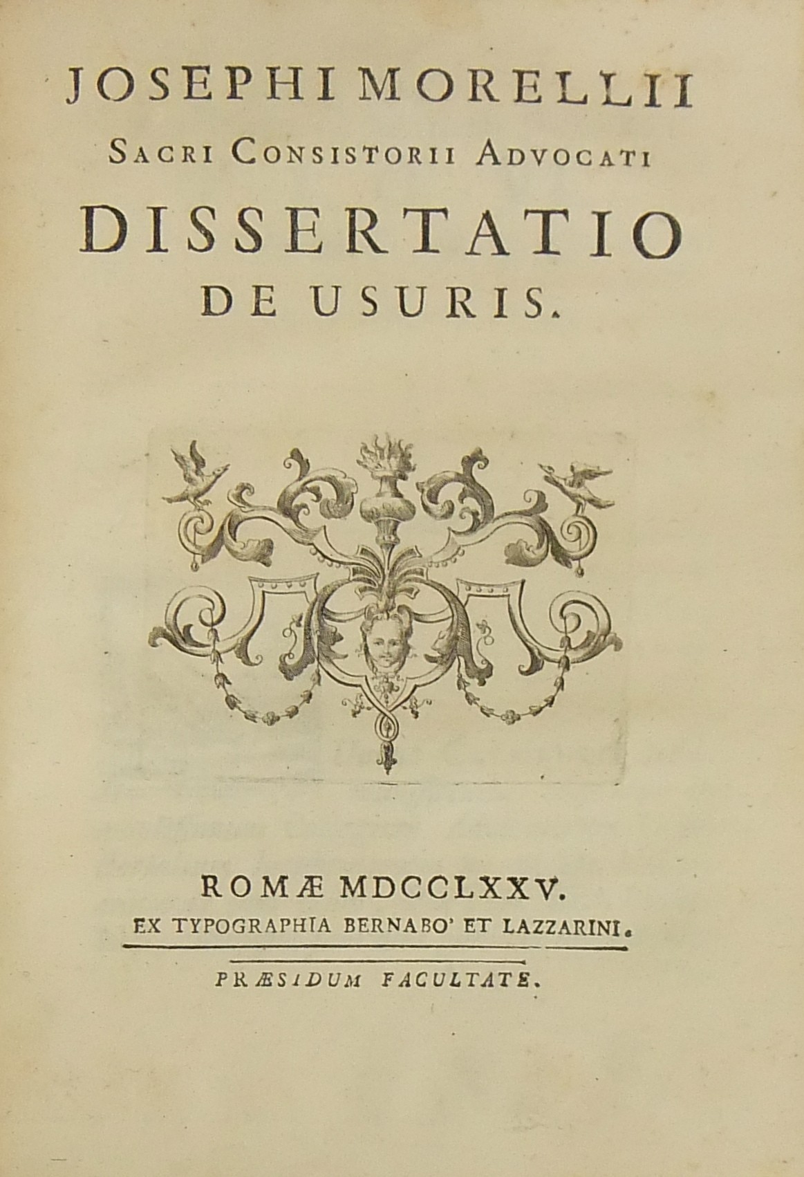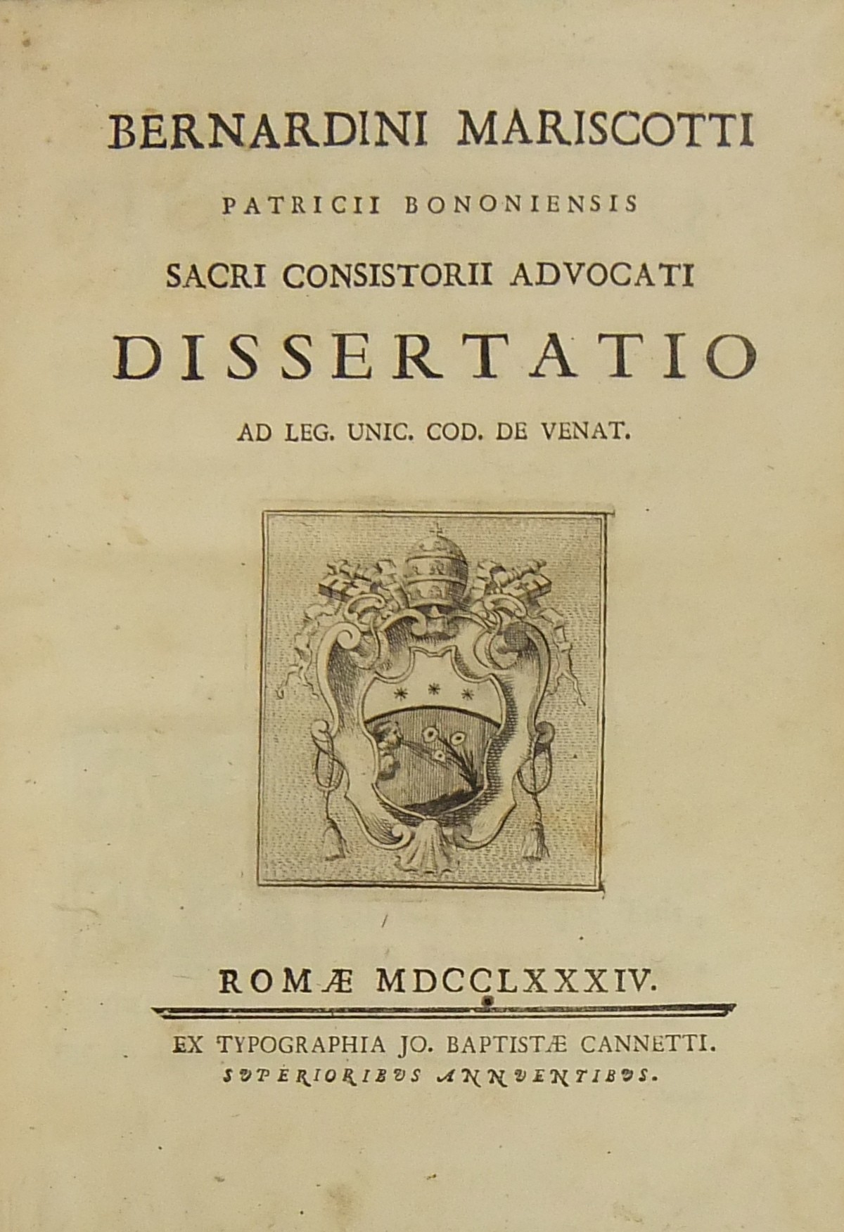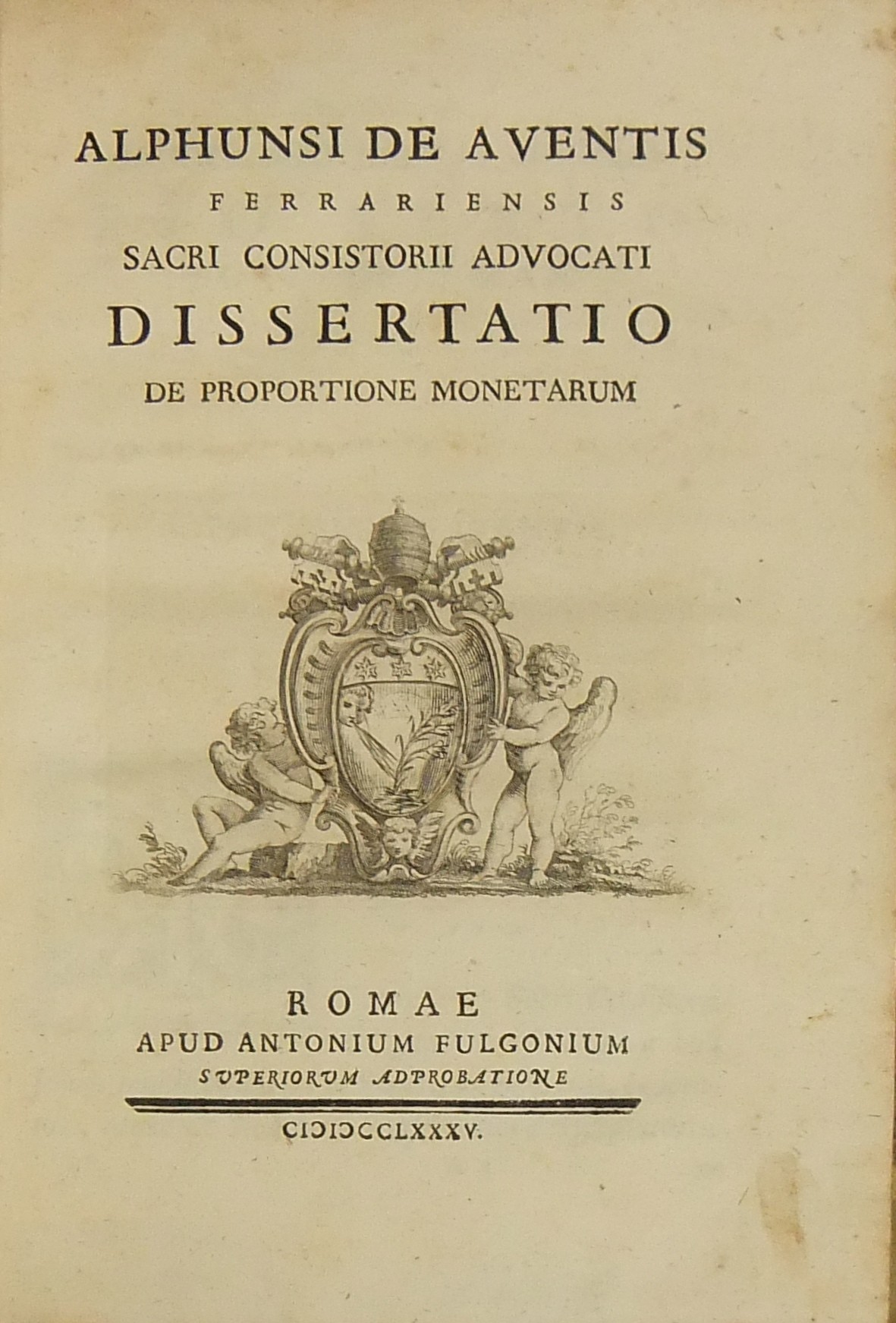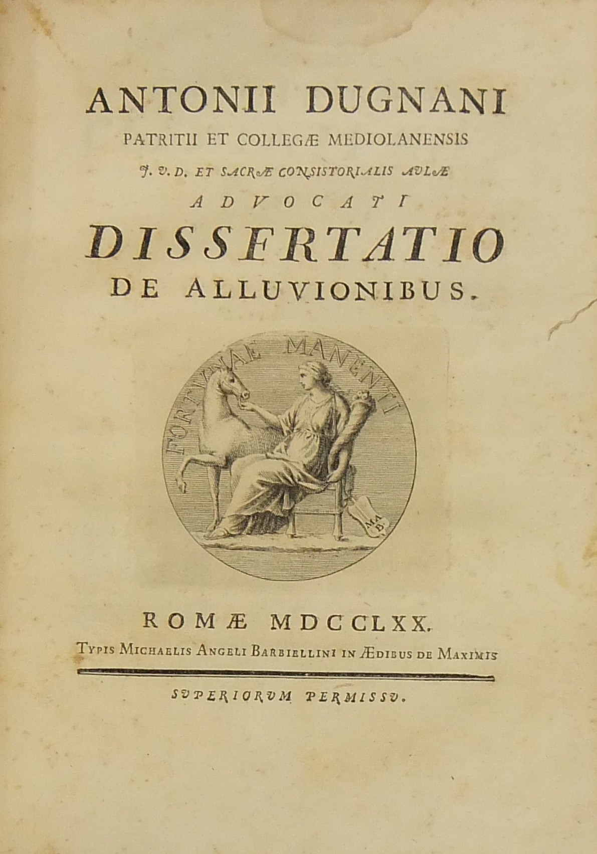 Alexandri Littae, Dissertatio de jure adcrescendi, 1745. Epistola R.P. Antonii Taveira ad Benedictum PP. XIV, 1758. Caroli Alexii Pisani, Dissertatio de fideicommisis, 1759. Francisci Palli, Dissertatio de captatoriis institutionibus, 1762. Dominici de Sancto Petro, Dissertatio de emancipationibus liberorum, 1767. Josephi Mariae Monti, Dissertatio de legitimazione, 1767. Caroli Aloysii Constantini, Dissertatio de poenis, 1769. Laurenti Prosperi Bottinii Lucensis, Dissertatio ad titulum codicis de repudiis, et judicio de moribus sublato, 1770. Antonii Dugnani, Dissertatio de alluvionibus, 1770. Josephi Capycii-Latro, Dissertatio ad titulum codicis de legatis et fideicommisis leg. 42, C, lib. 2, 1773. Josephi Morelli, Dissertatio de usuris, 1775. Josephi Capycii-Latro, Dissertatio ad titulum codicis de religiosis, et sumptibus funerum et c., 1779. Caroli Erskine, Dissertatio ad legem unicam codicis de monopoliis & c., 1783. Bernardini Mariscotti patricii Bononiensis, Dissertatio ad leg. unic. cod. de venat., 1784. Alphunsi de Aventis ferrariensis, Dissertatio de proportione monetarum, 1785. Vincentii Bartolucci, Dissertatio de viis publicis, 1786. Hieronymi Napulioni spoletini, Enarratio in titulum codicis de vectigalibus et commissis, 1792. Paschalis De Petro, Dissertatio de alea et aleatoribus, 1792. Alexandri Mariae Tassoni, Dissertatio de collegiis, 1792. Antonii Durini mediolanensis, Dissertatio ad legem I. Codicis de metallariis et metallis et procuratoribus metallorum, 1795. Belisarii Cristaldii, Dissertatio de quaestionibus, 1801. Hieronymi Bontadosi, Dissertatio de annonis, et tributis, s.d. Augustini Valle, Dissertatio de bonis ecclesiae, s.d. Augustini Valle, Dissertatio de bonis ecclesiae, s.d.