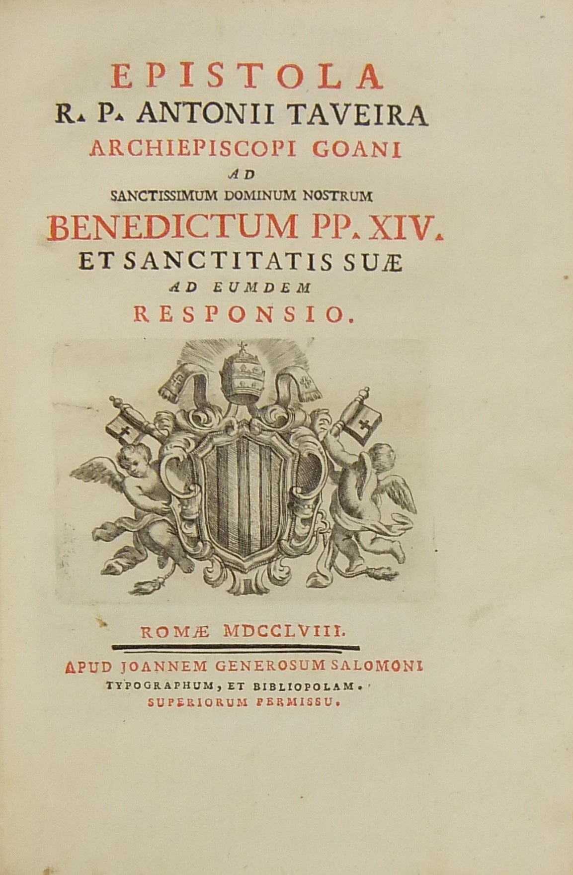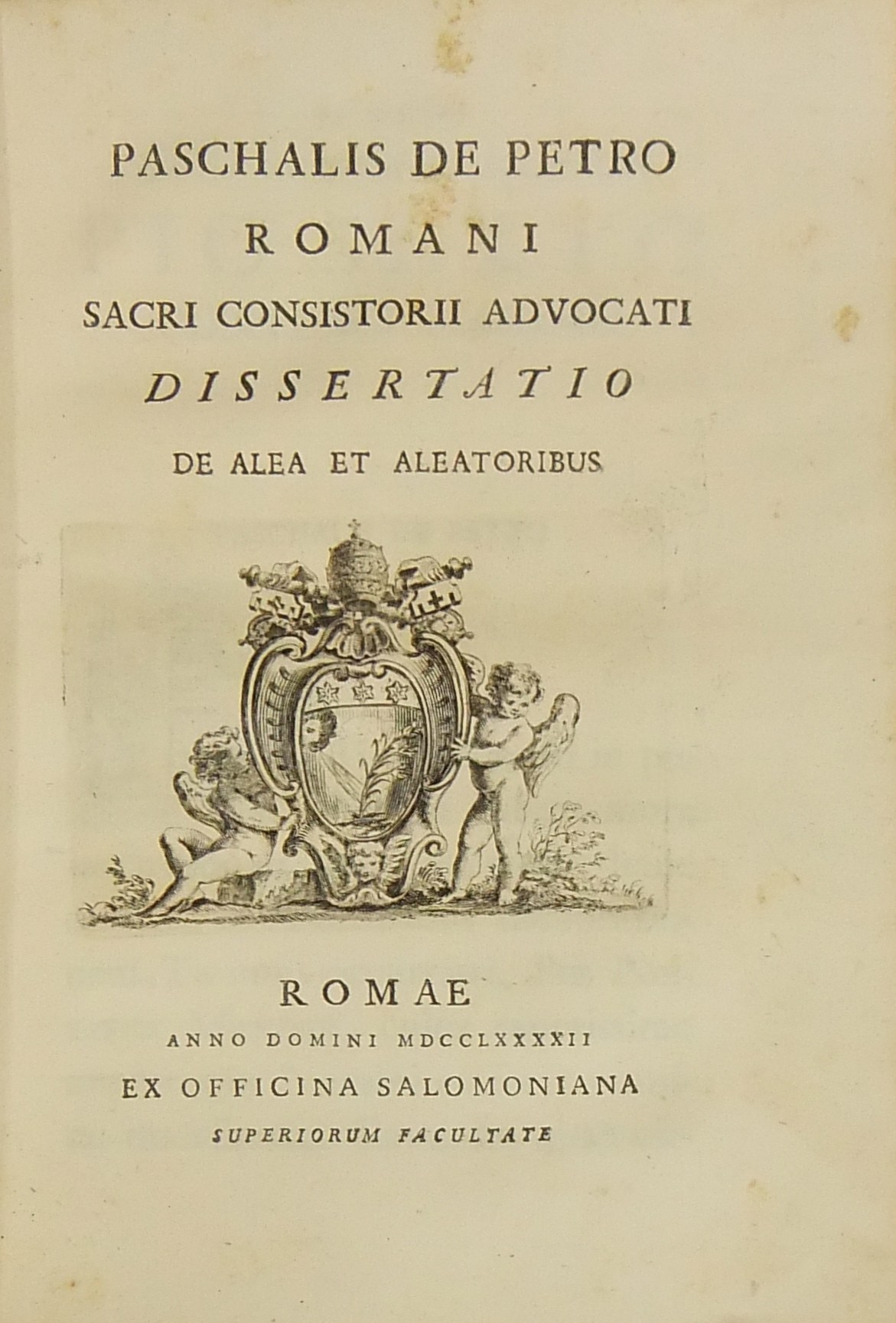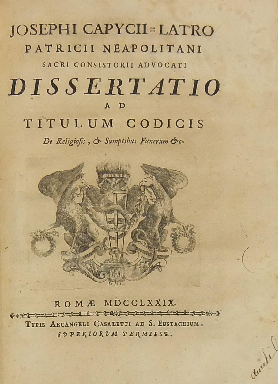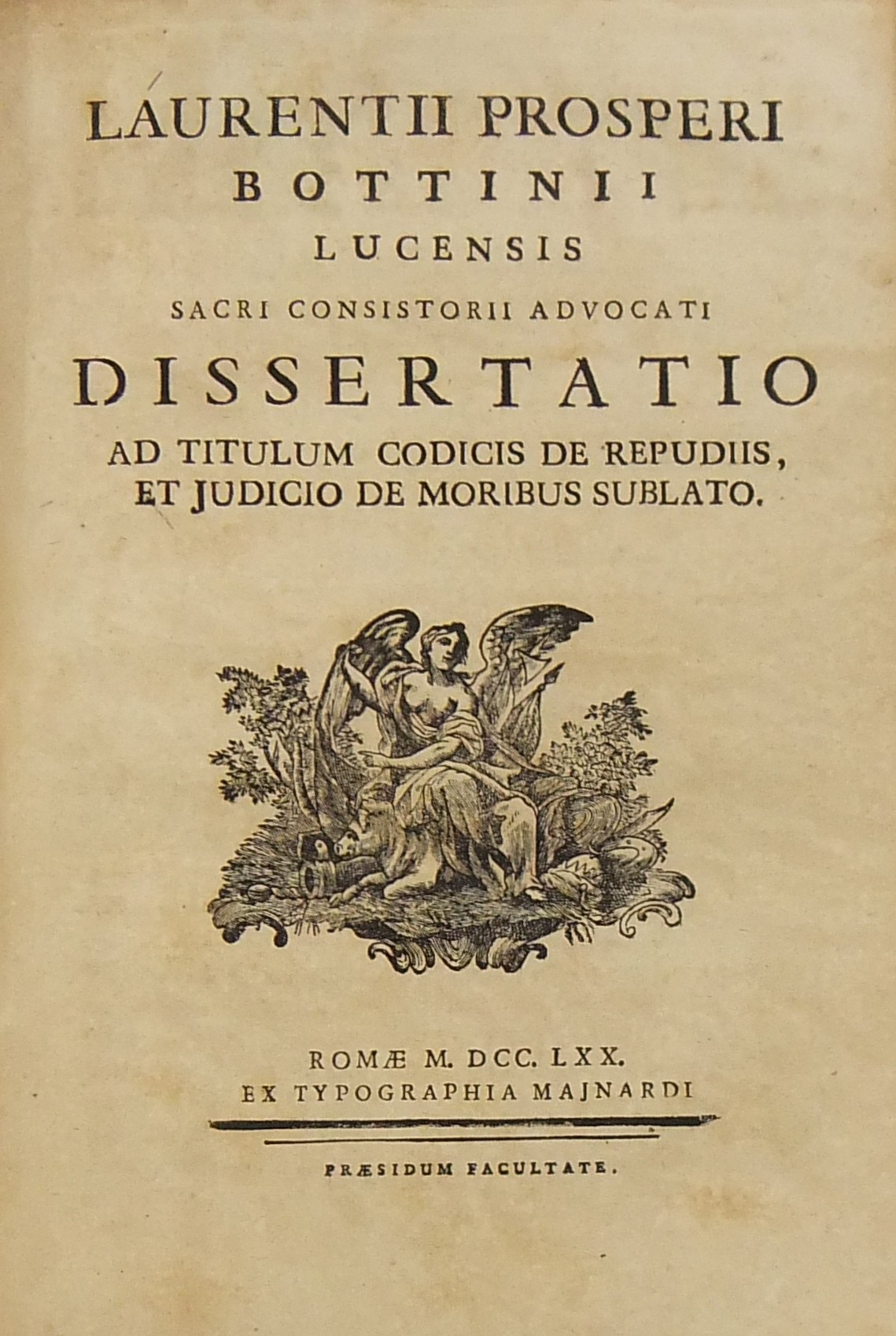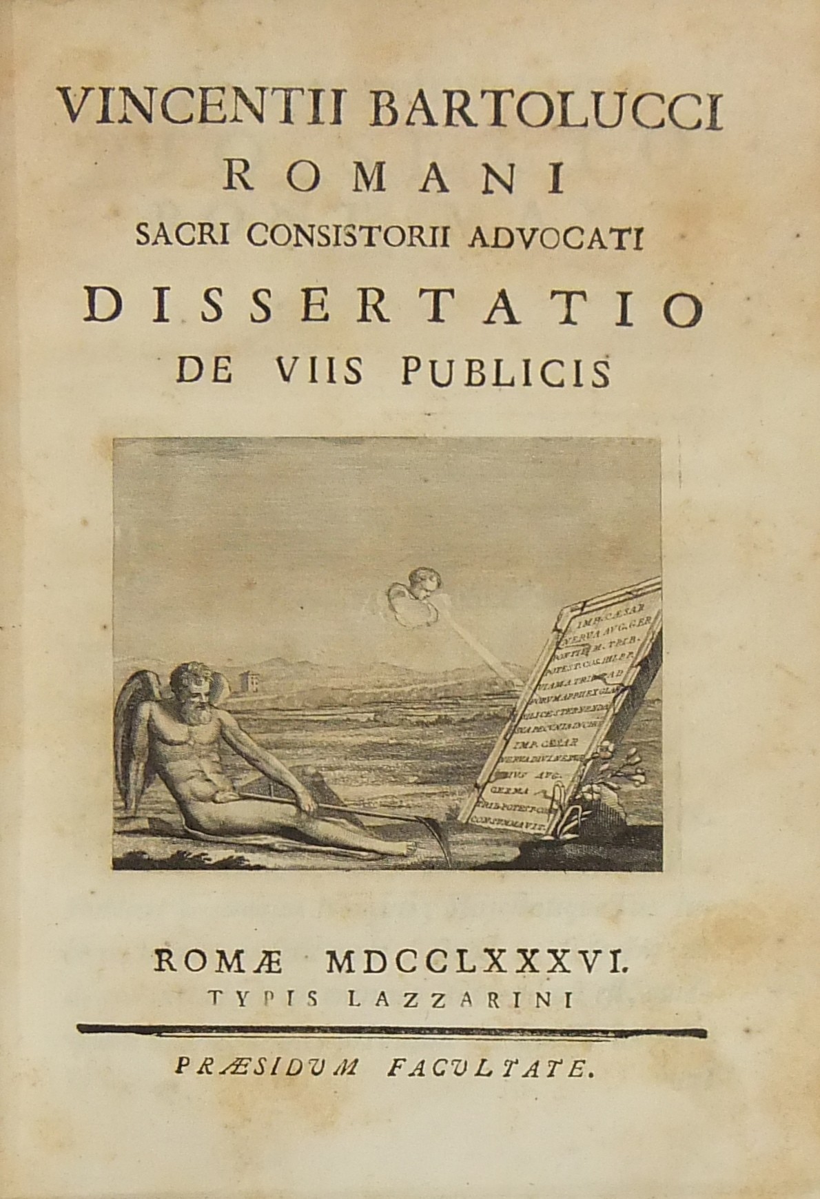 Alexandri Littae, Dissertatio de jure adcrescendi, 1745. Epistola R.P. Antonii Taveira ad Benedictum PP. XIV, 1758. Caroli Alexii Pisani, Dissertatio de fideicommisis, 1759. Francisci Palli, Dissertatio de captatoriis institutionibus, 1762. Dominici de Sancto Petro, Dissertatio de emancipationibus liberorum, 1767. Josephi Mariae Monti, Dissertatio de legitimazione, 1767. Caroli Aloysii Constantini, Dissertatio de poenis, 1769. Laurenti Prosperi Bottinii Lucensis, Dissertatio ad titulum codicis de repudiis, et judicio de moribus sublato, 1770. Antonii Dugnani, Dissertatio de alluvionibus, 1770. Josephi Capycii-Latro, Dissertatio ad titulum codicis de legatis et fideicommisis leg. 42, C, lib. 2, 1773. Josephi Morelli, Dissertatio de usuris, 1775. Josephi Capycii-Latro, Dissertatio ad titulum codicis de religiosis, et sumptibus funerum et c., 1779. Caroli Erskine, Dissertatio ad legem unicam codicis de monopoliis & c., 1783. Bernardini Mariscotti patricii Bononiensis, Dissertatio ad leg. unic. cod. de venat., 1784. Alphunsi de Aventis ferrariensis, Dissertatio de proportione monetarum, 1785. Vincentii Bartolucci, Dissertatio de viis publicis, 1786. Hieronymi Napulioni spoletini, Enarratio in titulum codicis de vectigalibus et commissis, 1792. Paschalis De Petro, Dissertatio de alea et aleatoribus, 1792. Alexandri Mariae Tassoni, Dissertatio de collegiis, 1792. Antonii Durini mediolanensis, Dissertatio ad legem I. Codicis de metallariis et metallis et procuratoribus metallorum, 1795. Belisarii Cristaldii, Dissertatio de quaestionibus, 1801. Hieronymi Bontadosi, Dissertatio de annonis, et tributis, s.d. Augustini Valle, Dissertatio de bonis ecclesiae, s.d. Augustini Valle, Dissertatio de bonis ecclesiae, s.d.