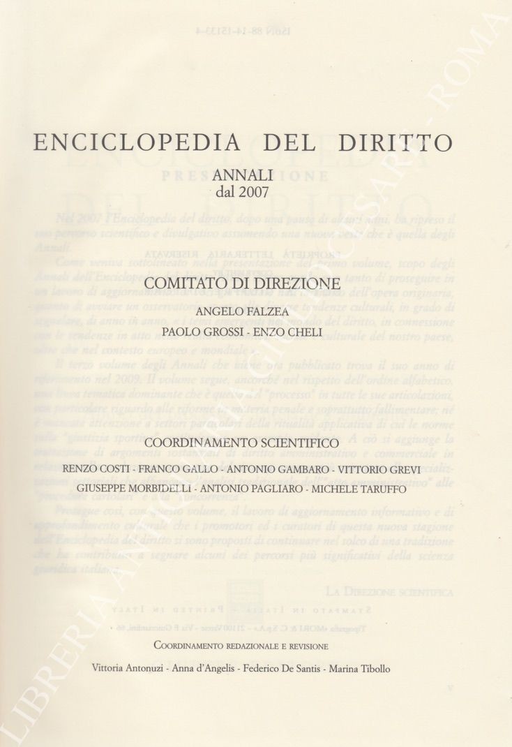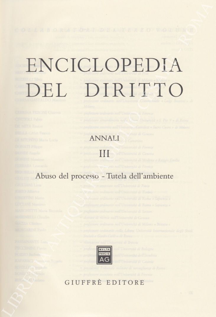 Enciclopedia del diritto. Annali III - (Abuso del processo - Tutela dell'ambiente). Diretta da Francesco Calasso poi (dal 1966) da Costantino Mortati e Salvatore Pugliatti poi anche (dal 1978) da Francesco Santoro-Passarelli