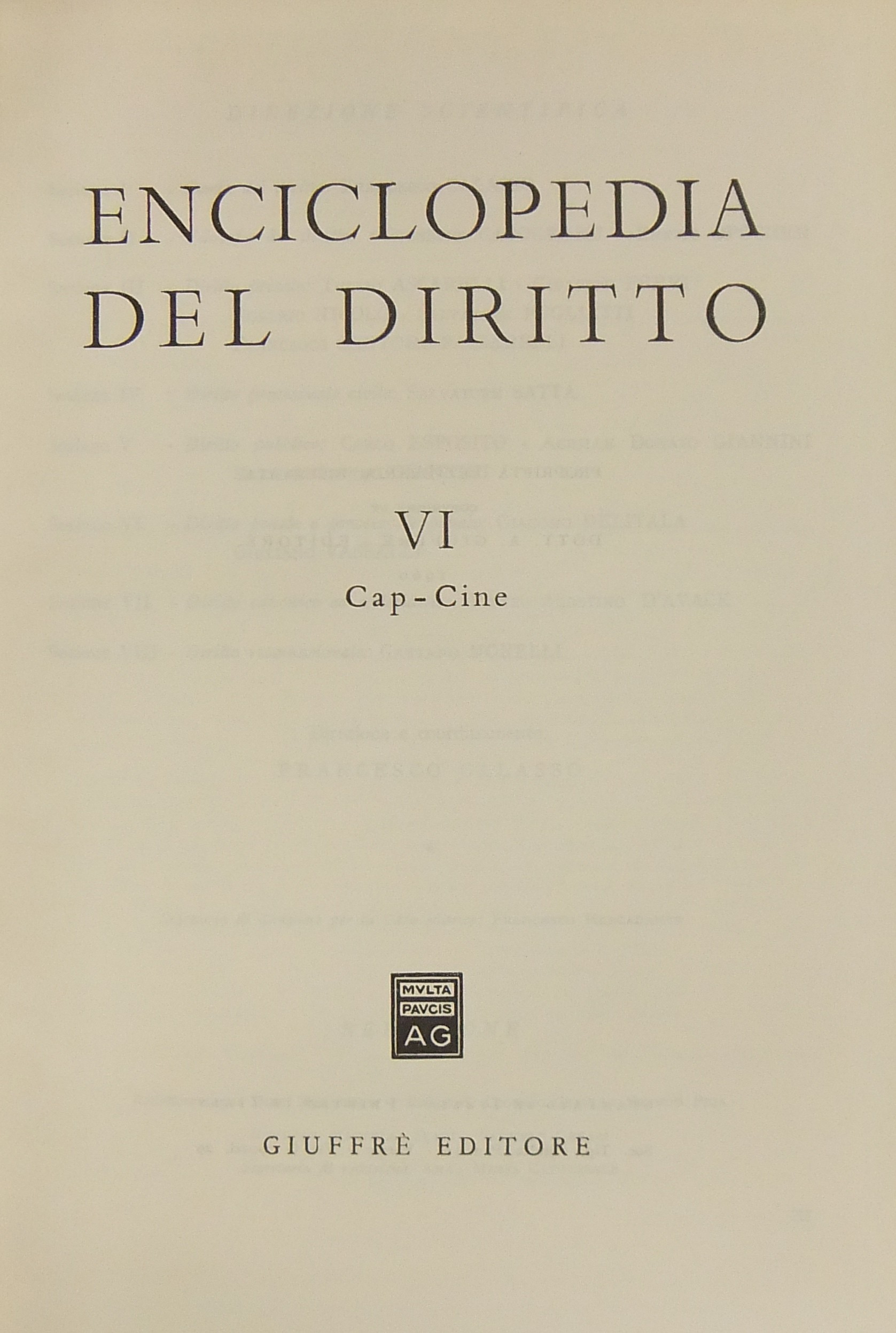 Enciclopedia del diritto. Vol. VI - Cap-Cine. Diretta da Francesco Calasso poi (dal 1966) da Costantino Mortati e Salvatore Pugliatti poi anche (dal 1978) da Francesco Santoro-Passarelli
