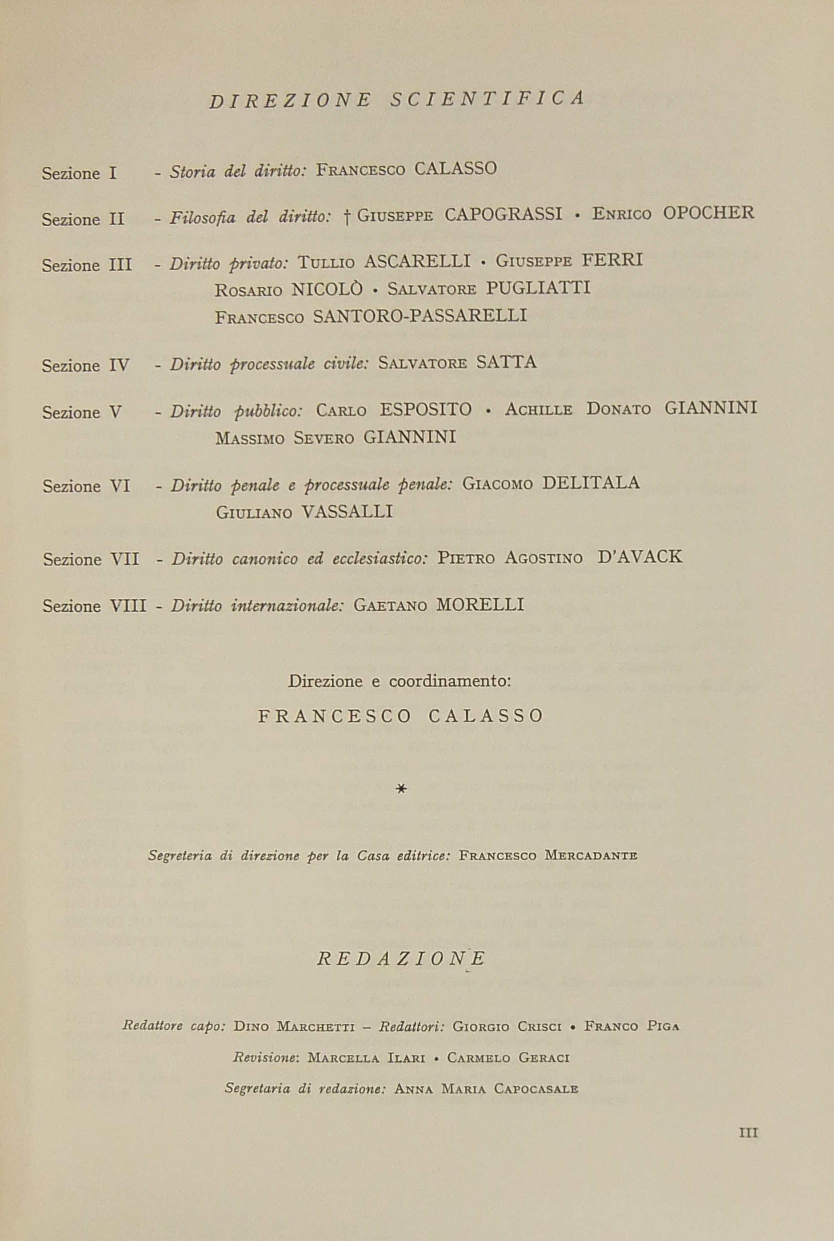 Direzione scientifica: Francesco Calasso, Giuseppe Capograssi, Enrico Opocher, Tullio Ascarelli, Rosario Nicolò, Salvatore Pugliatti, Francesco Santoro Passarelli, Salvatore Satta, Carlo Esposito, Achille Donato Giannini, Massimo Severo Giannini, Giacomo Delitala, Giuliano Vassalli, Pietro Agostino D’Avack, Gaetano Morelli.