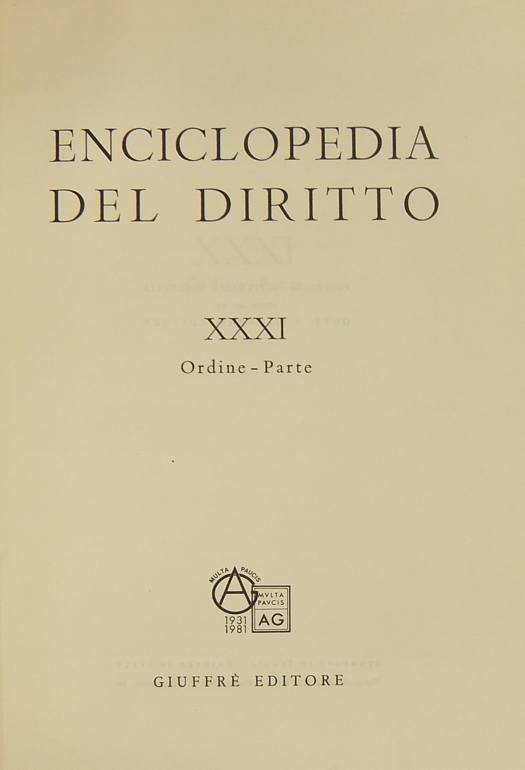 Enciclopedia del diritto. Vol. XXXI - Ordine-Parte. Diretta da Francesco Calasso poi (dal 1966) da Costantino Mortati e Salvatore Pugliatti poi anche (dal 1978) da Francesco Santoro-Passarelli