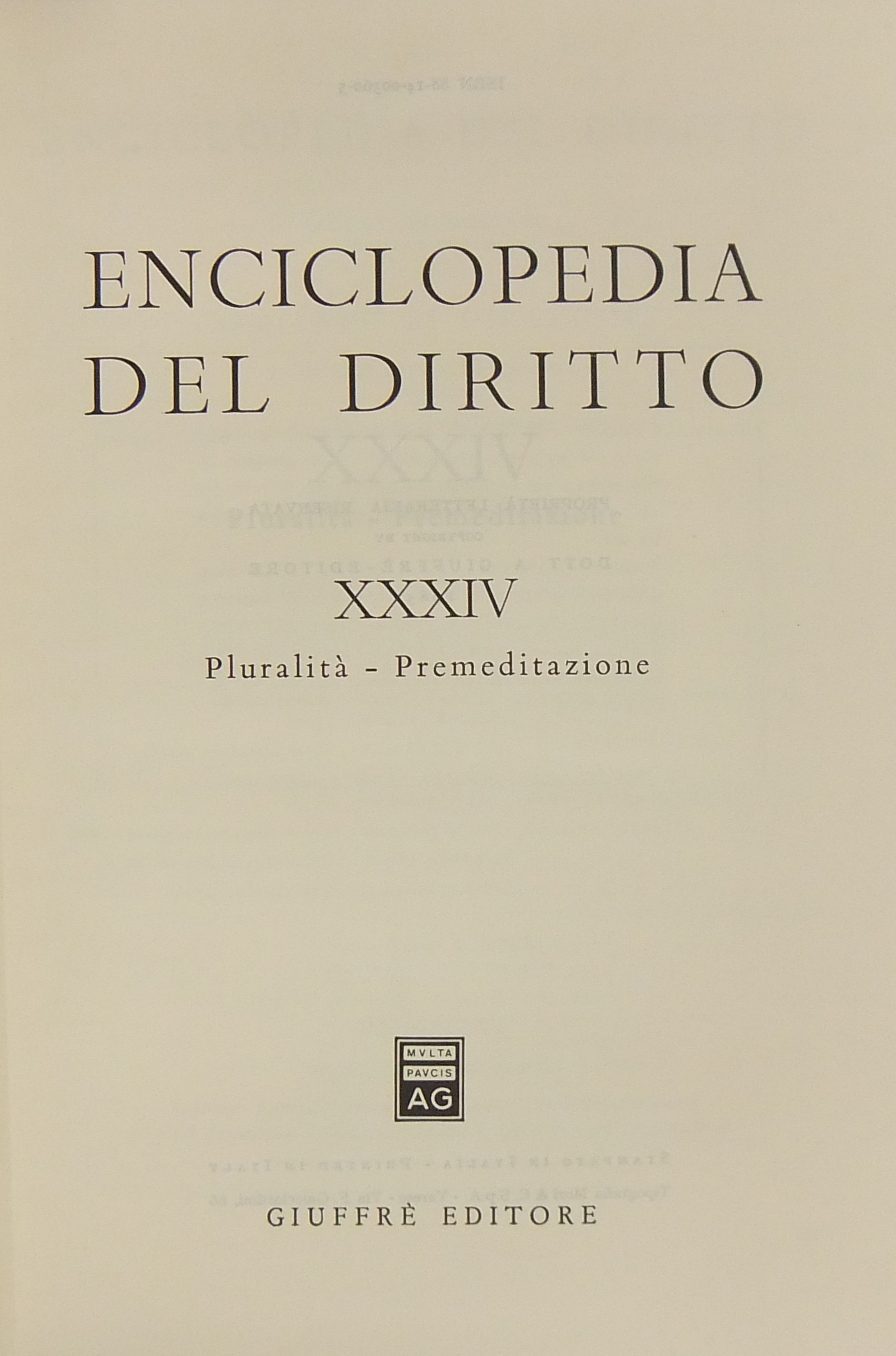 Enciclopedia del diritto. Vol. XXXIV - Pluralità -Premeditazione. Diretta da Francesco Calasso poi (dal 1966) da Costantino Mortati e Salvatore Pugliatti poi anche (dal 1978) da Francesco Santoro-Passarelli