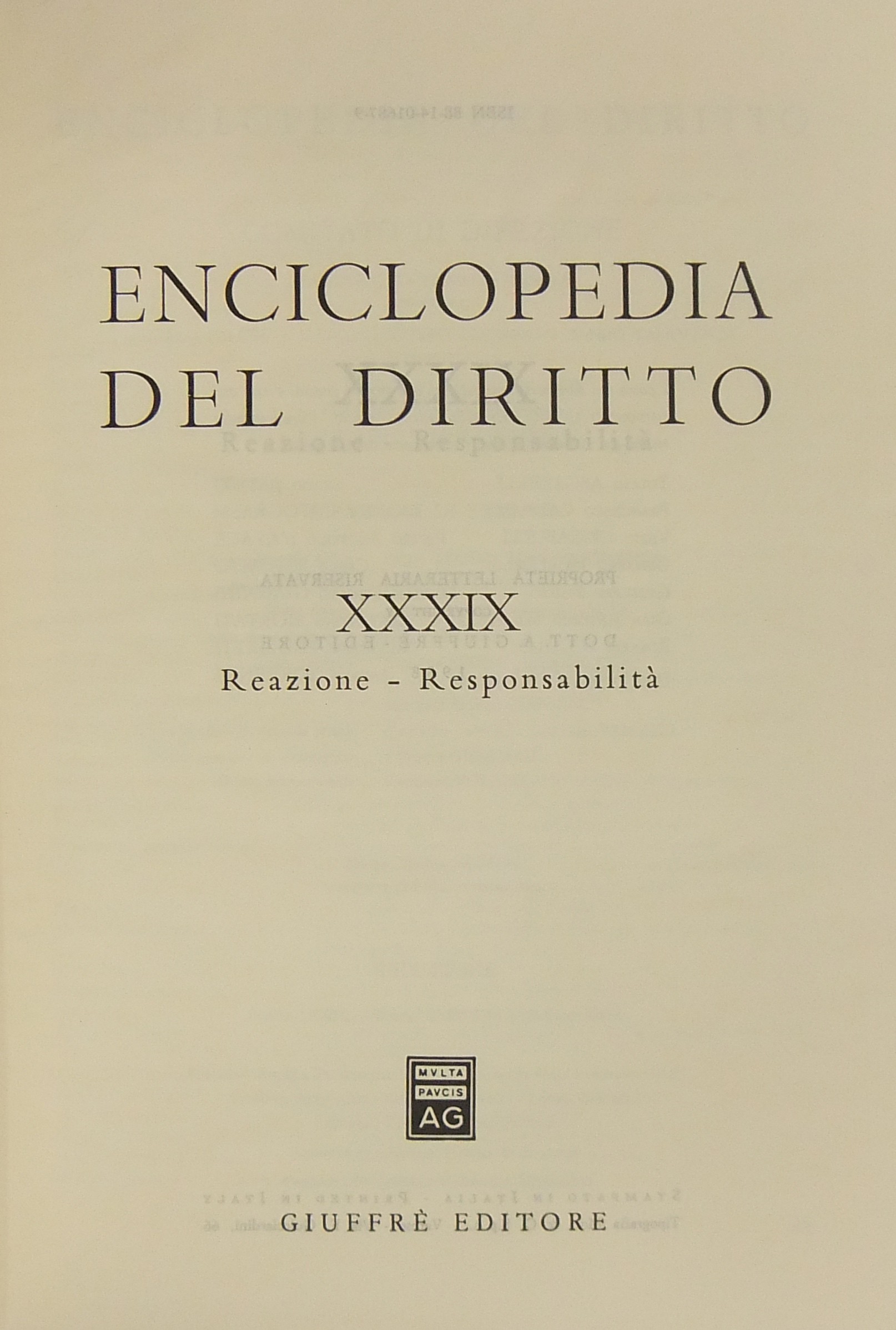 Enciclopedia del diritto. Vol. XXXIX - Reazione-Responsabilità . Diretta da Francesco Calasso poi (dal 1966) da Costantino Mortati e Salvatore Pugliatti poi anche (dal 1978) da Francesco Santoro-Passarelli