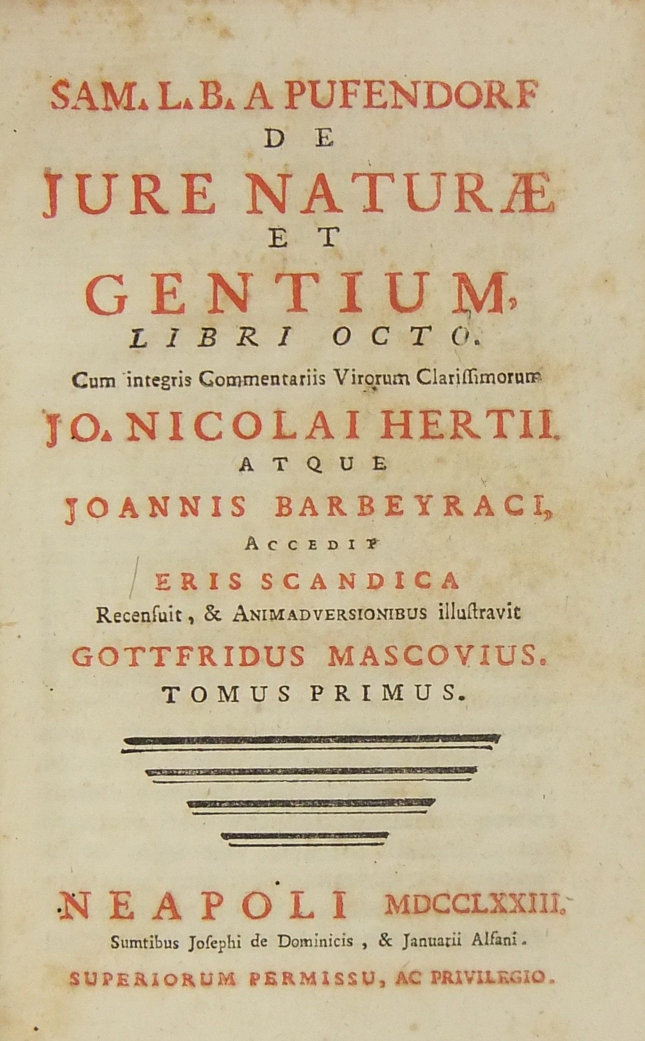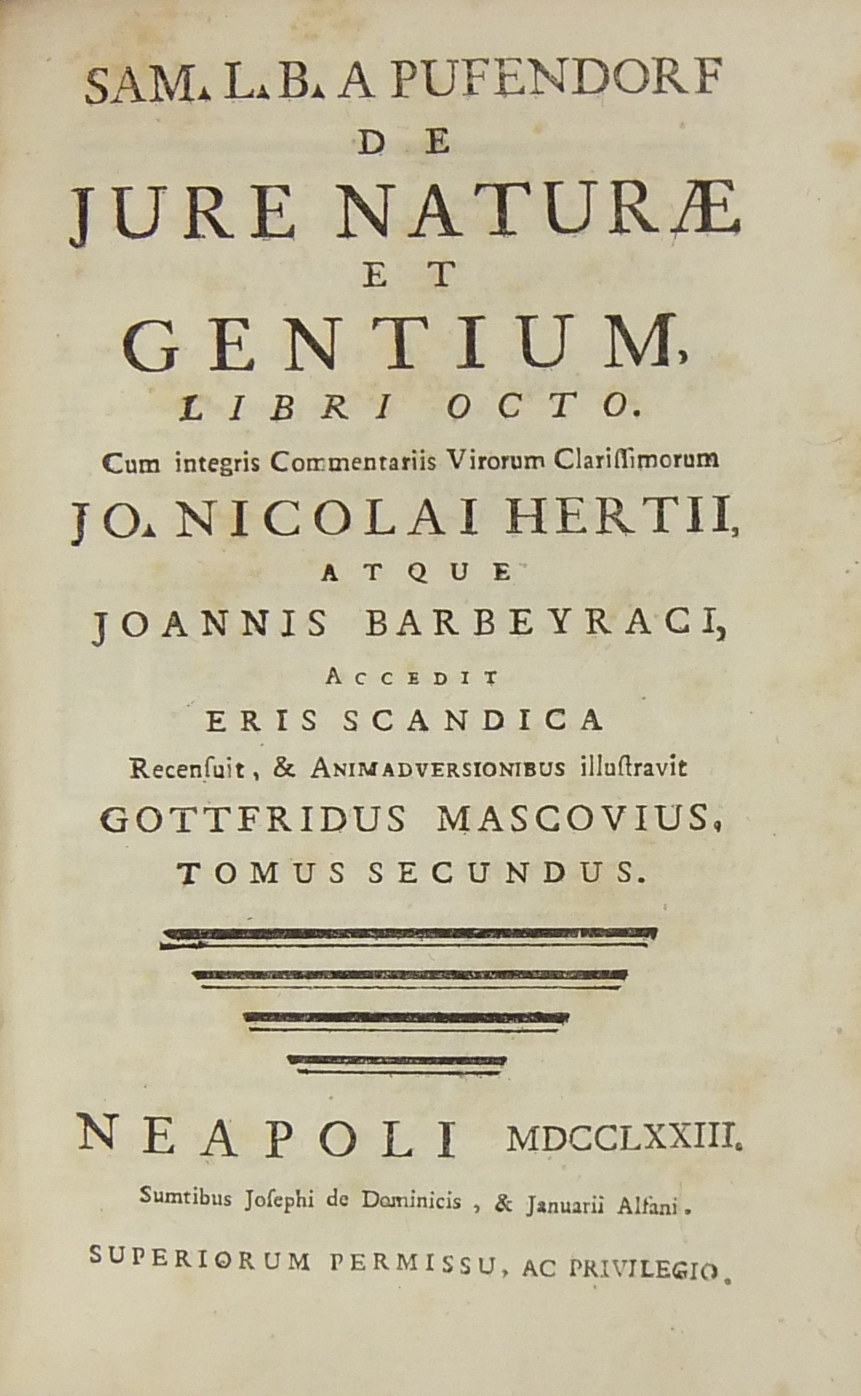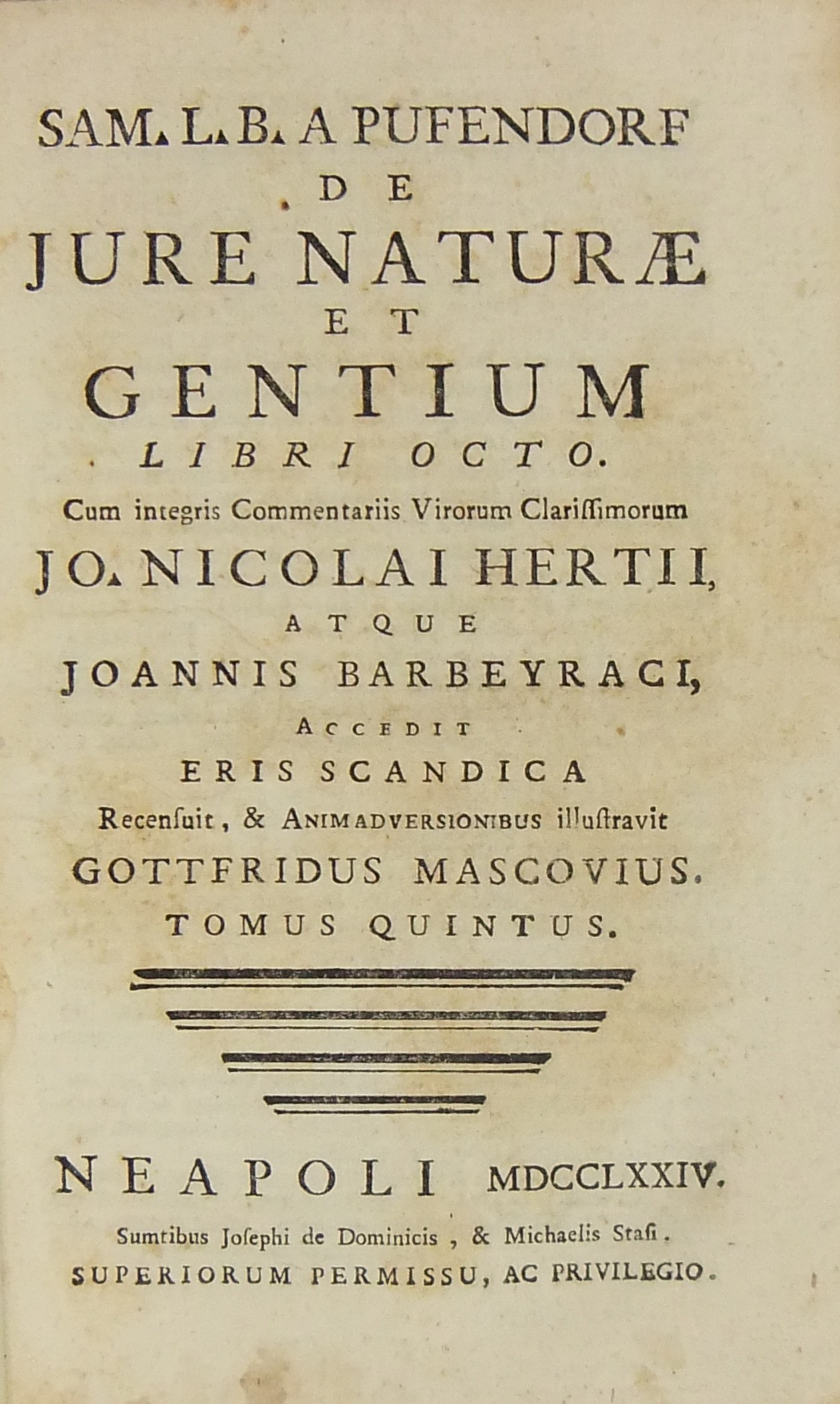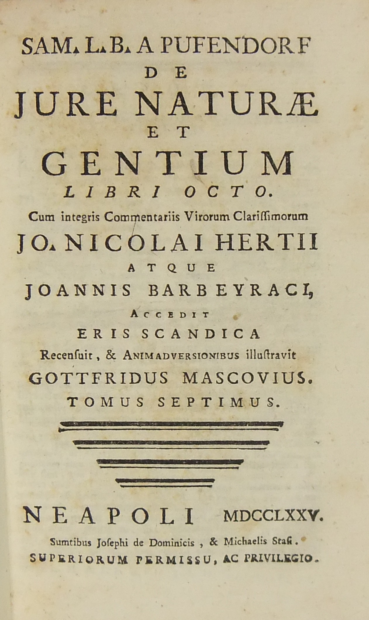 De jure naturae et gentium libri octo. Cum integris Commentariis Virorum Clarissimorum Jo. Nicolai Hertii atque Joannis Barbeyraci. Accedit eris scandica. Recensuit et Animadversionibus illustravit Gottfridus Mascovius