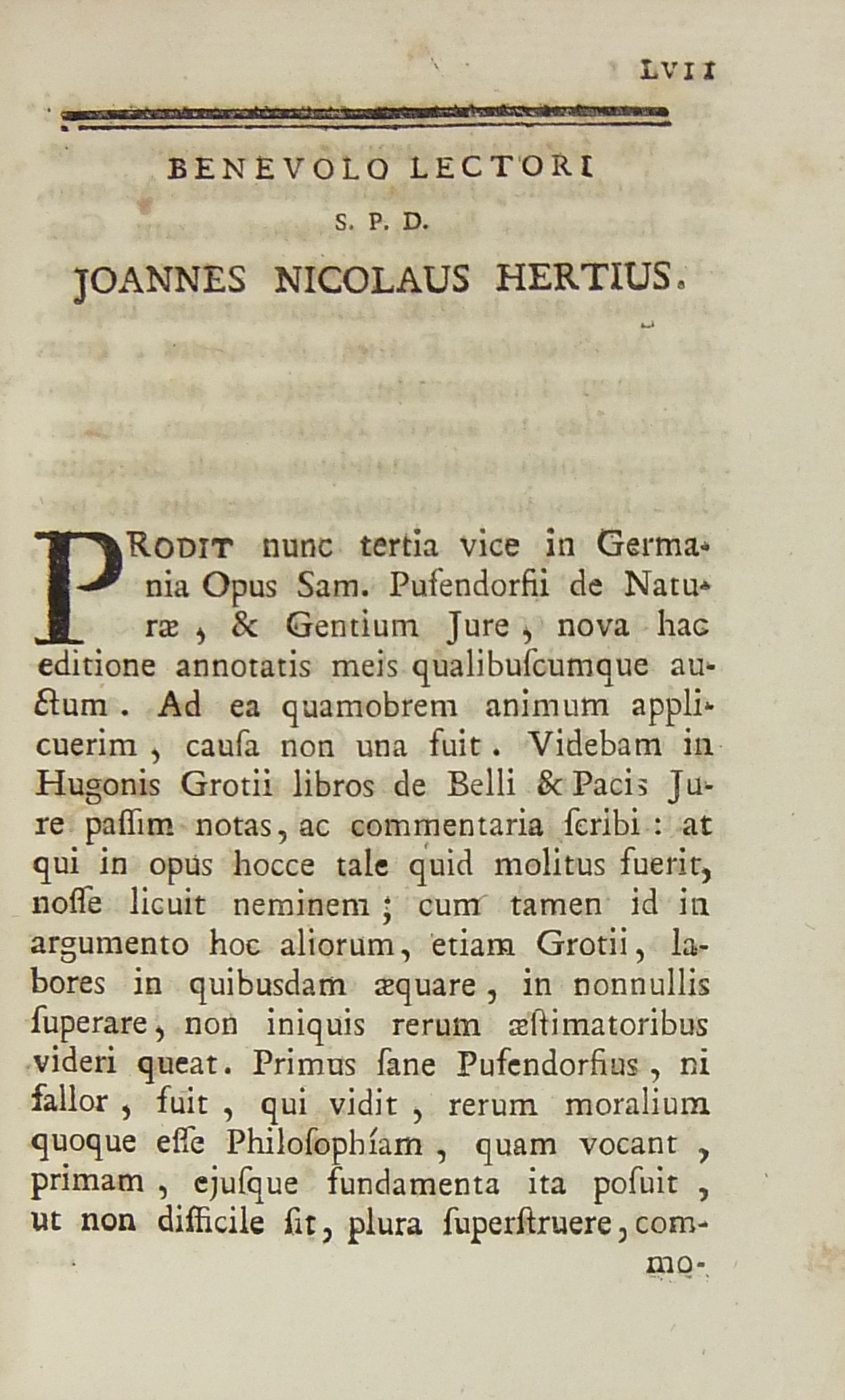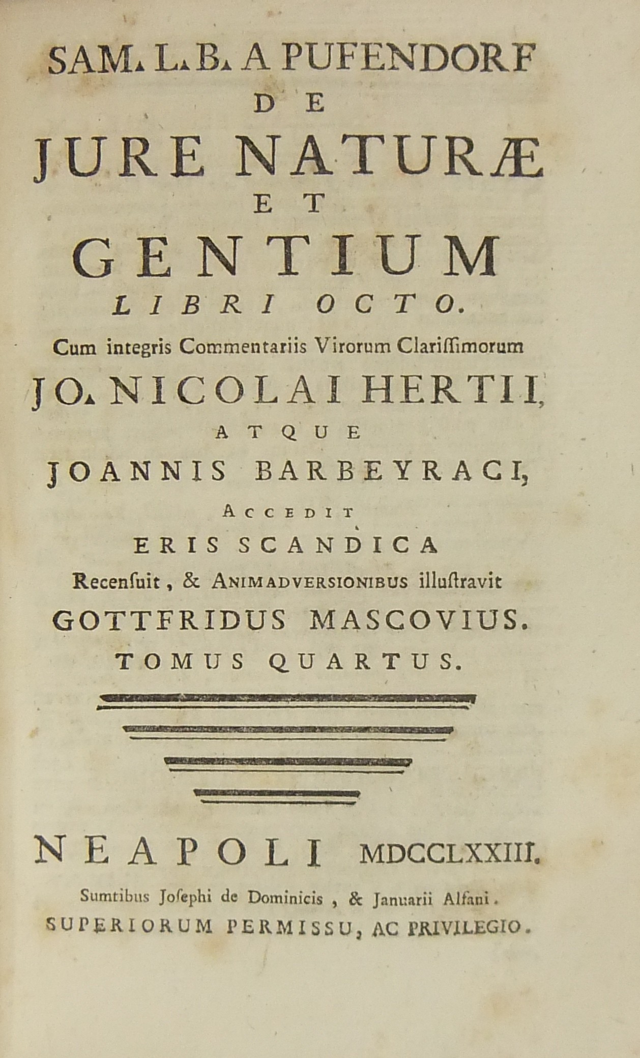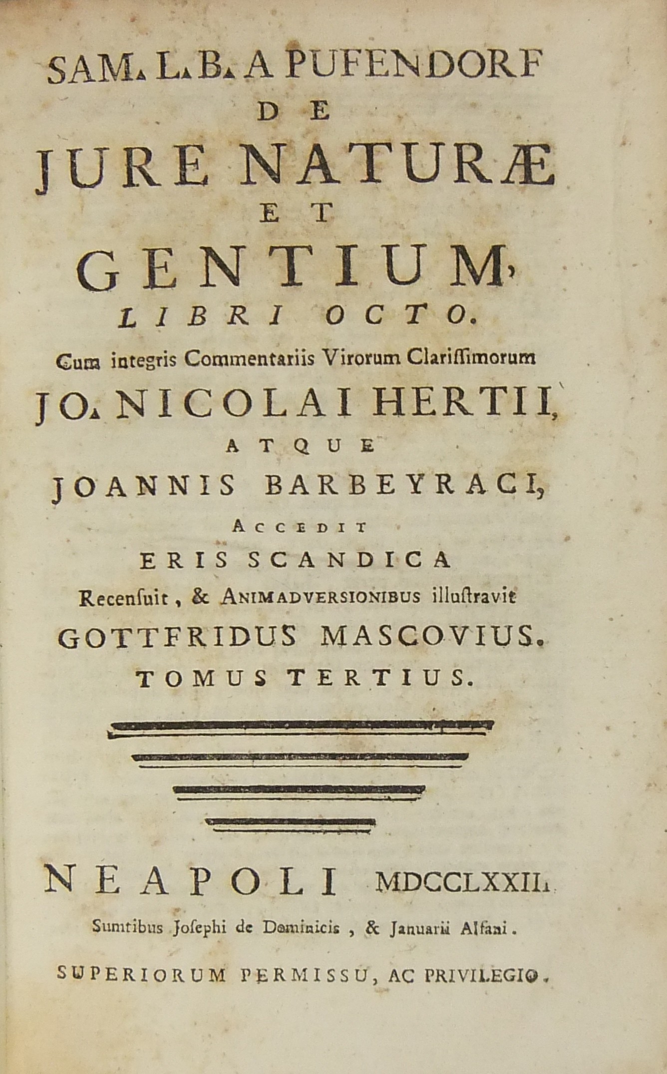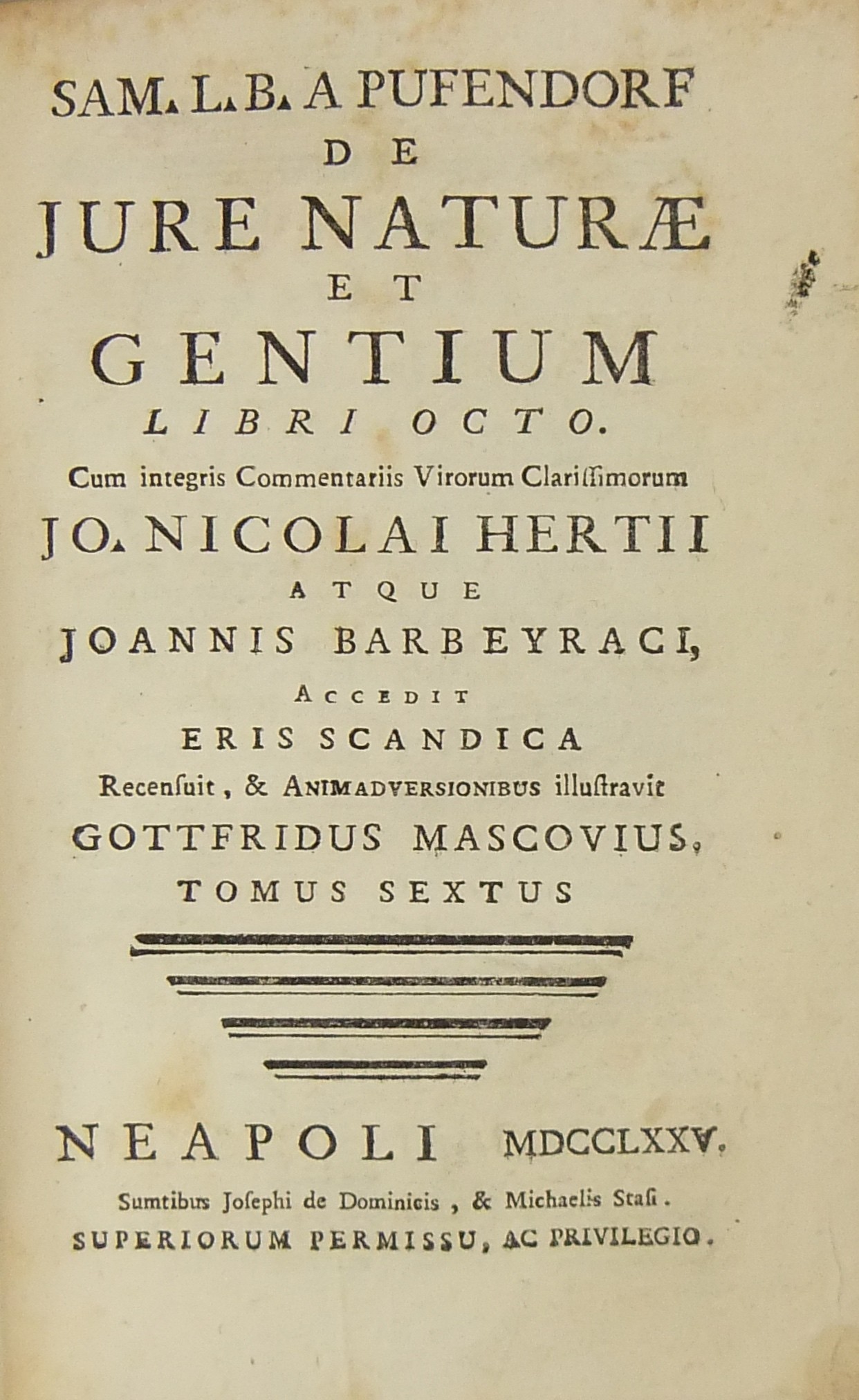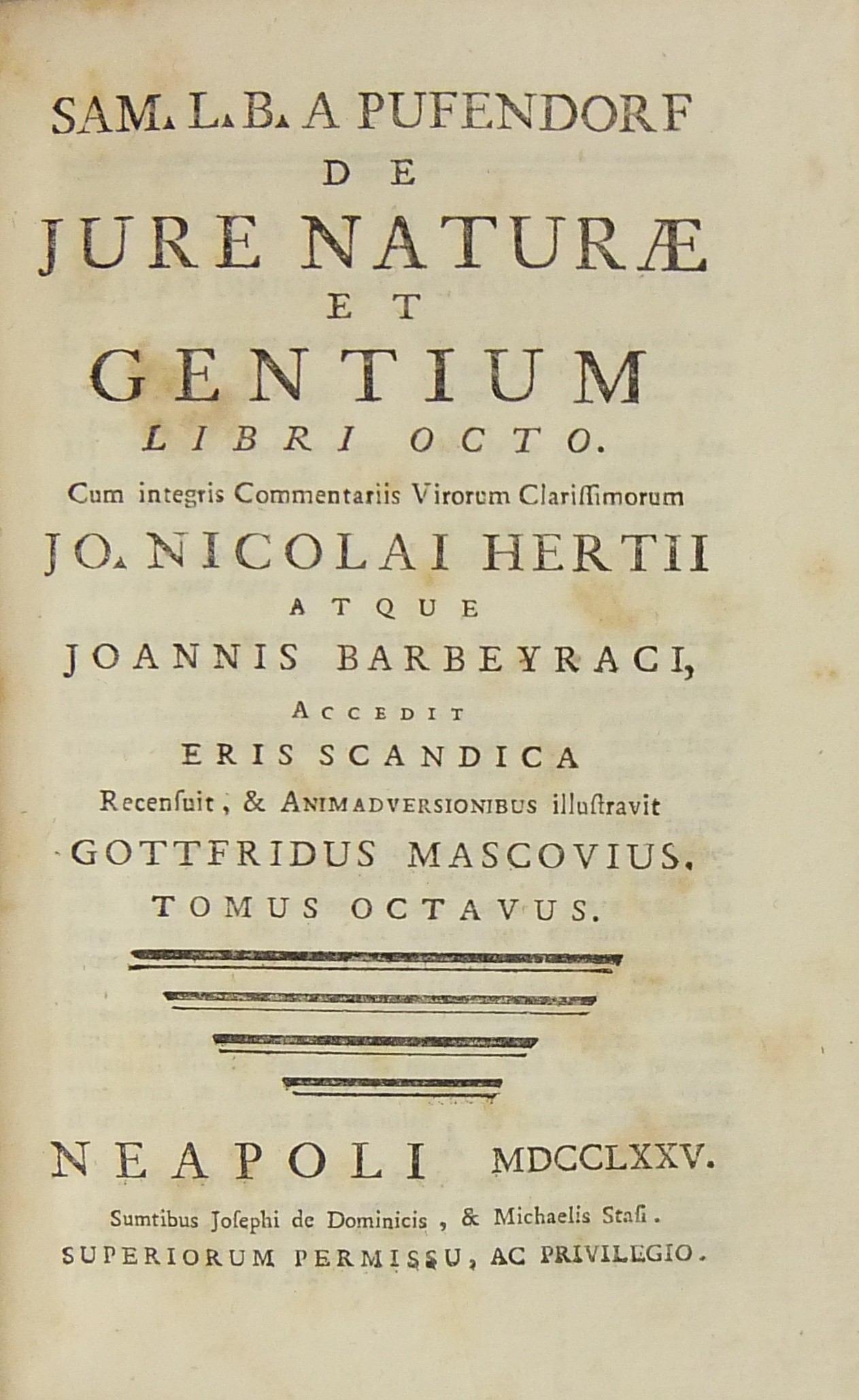 De jure naturae et gentium libri octo. Cum integris Commentariis Virorum Clarissimorum Jo. Nicolai Hertii atque Joannis Barbeyraci. Accedit eris scandica. Recensuit et Animadversionibus illustravit Gottfridus Mascovius