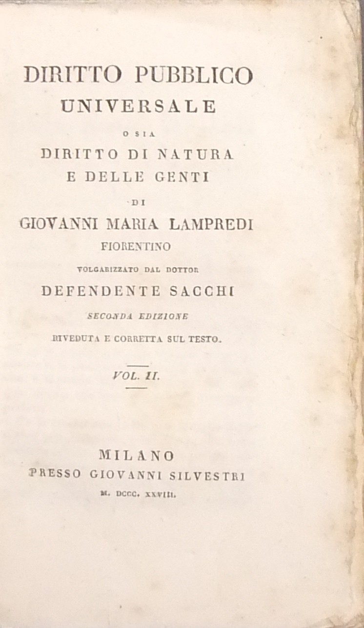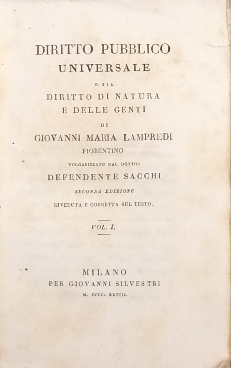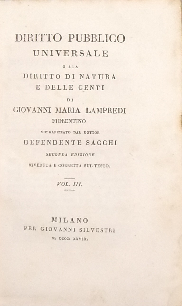 Diritto pubblico universale o sia diritto di natura e delle genti. Volgarizzato dal Dottor Defendente Sacchi