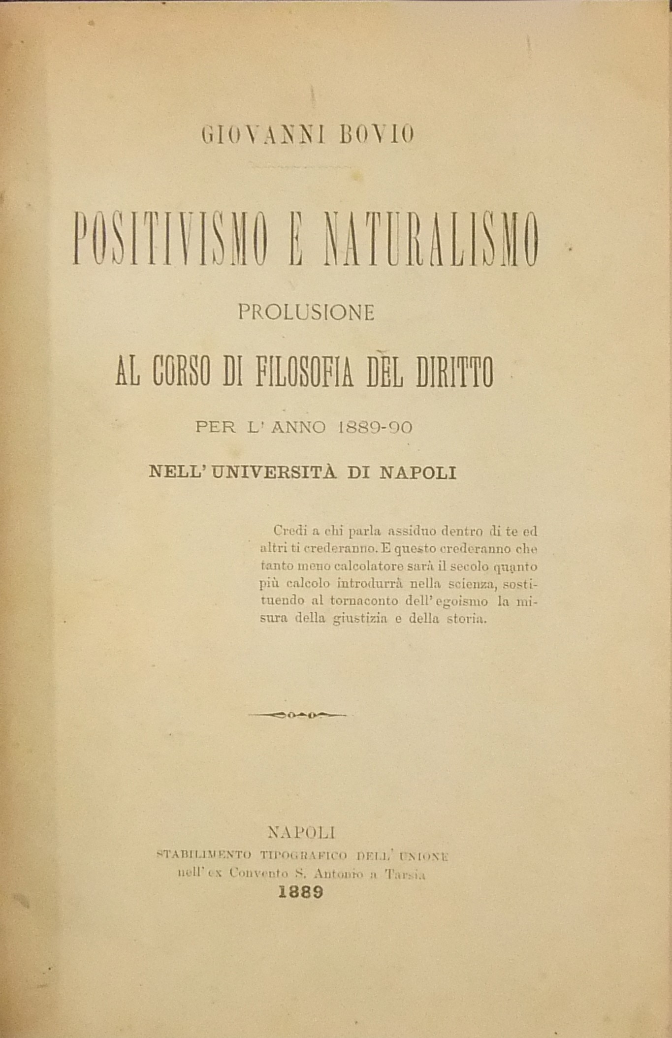 Filosofia del diritto. UNITO A: Positivismo e naturalismo. Prolusione al corso di filosofia del diritto per l'anno 1889-90 nell'Università di Napoli. Napoli, 1889, Stab.Tip. dell'Unione, pp. 24