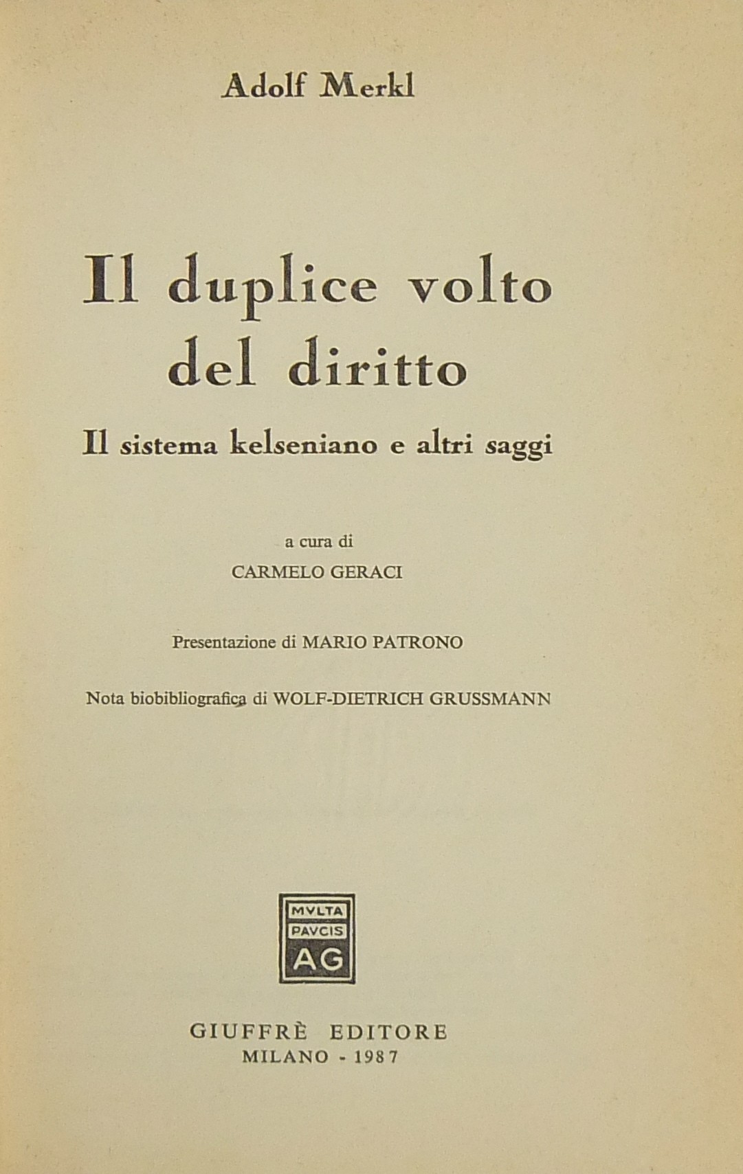 Il duplice volto del diritto. Il sistema kelseniano e altri saggi. A cura di Carmelo Geraci. Presentazione di Mario Patrono. Nota biobibliografica di Wolf-Dietrich Grussmann
