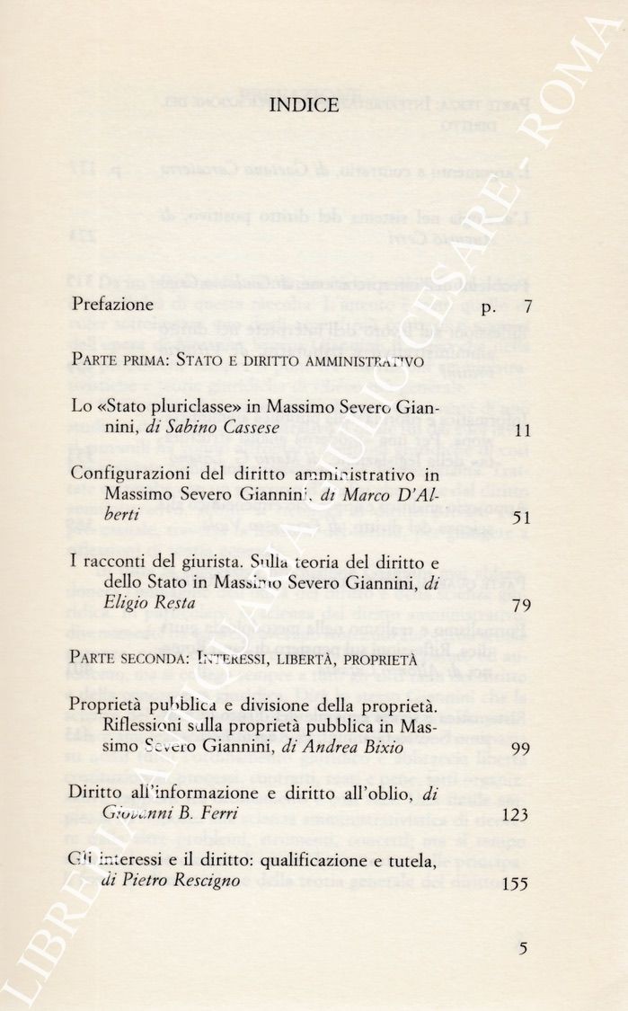 Scritti di: Bixio A., Carcaterra G., Cassese S., Catania A., Cerri A., Crifò G., D’Alberti M., Falzea A., Ferri G.B., Frosini V., Losano M.G., Rescigno P., Resta E., Viola F.