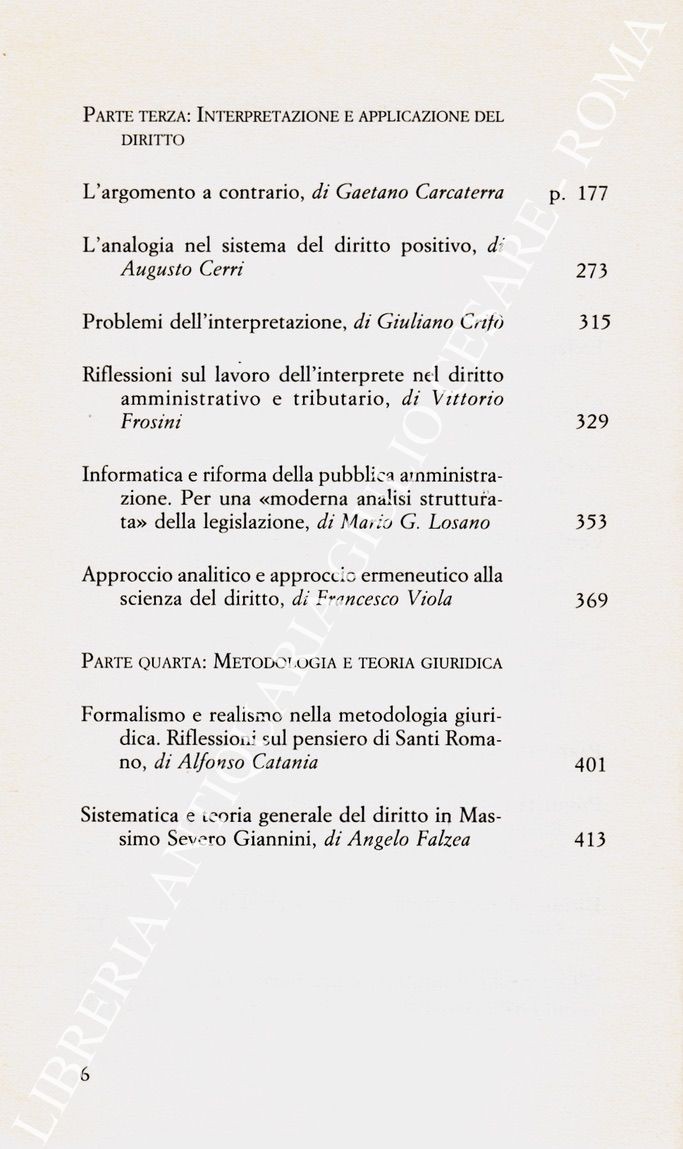 Scritti di: Bixio A., Carcaterra G., Cassese S., Catania A., Cerri A., Crifò G., D'Alberti M., Falzea A., Ferri G.B., Frosini V., Losano M.G., Rescigno P., Resta E., Viola F.