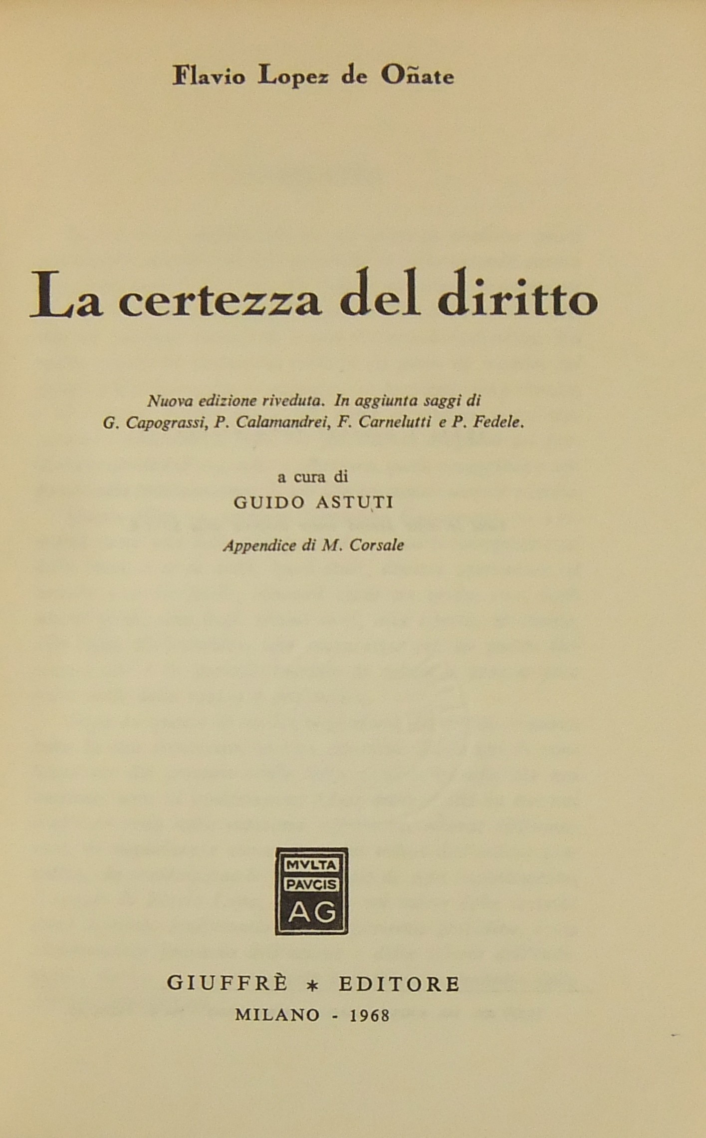 La certezza del diritto. Nuova edizione riveduta. In aggiunta saggi di G. Capograssi, P. Calamandrei, F. Carnelutti e P. Fedele. A cura di Guido Astuti. Appendice di M. Corsale