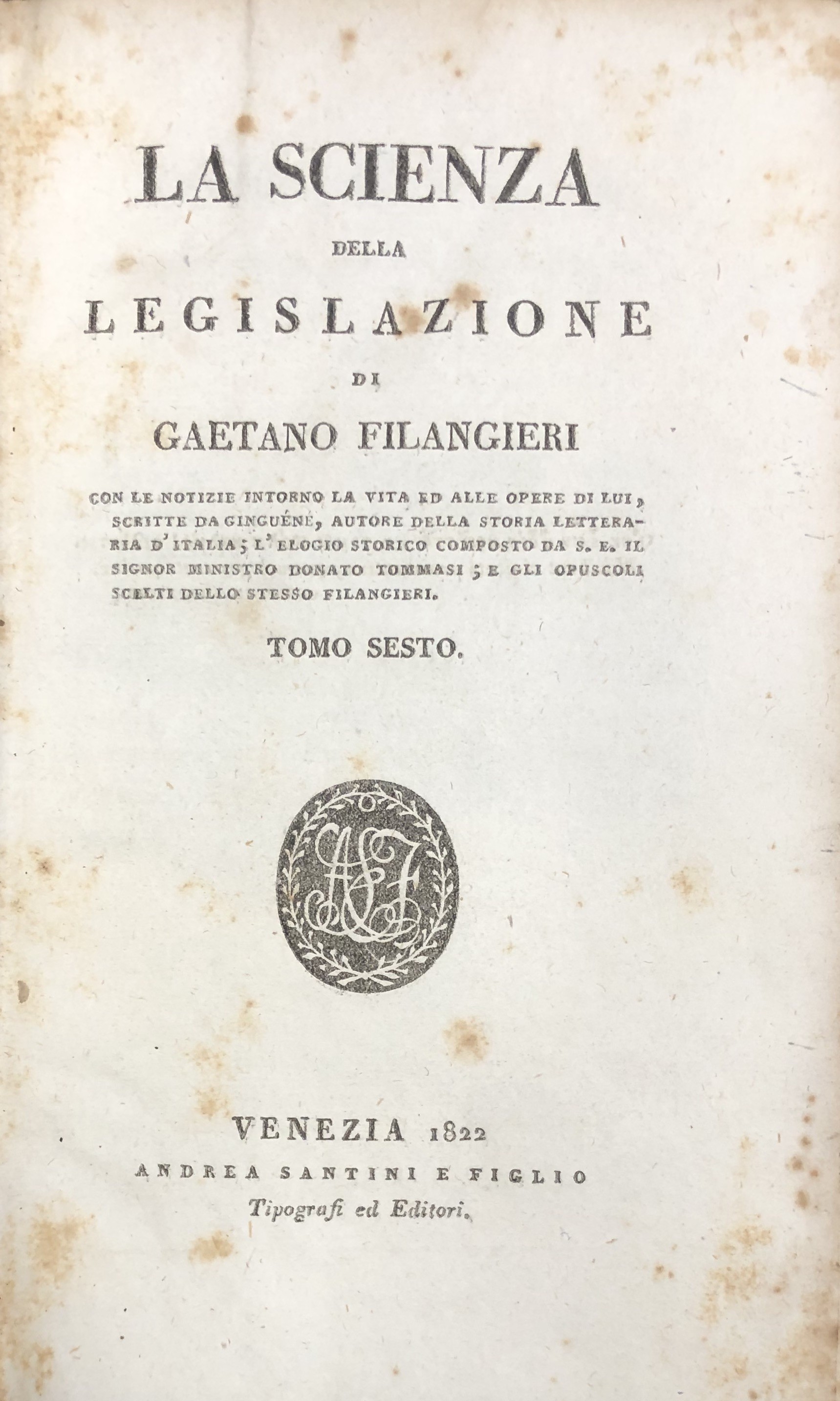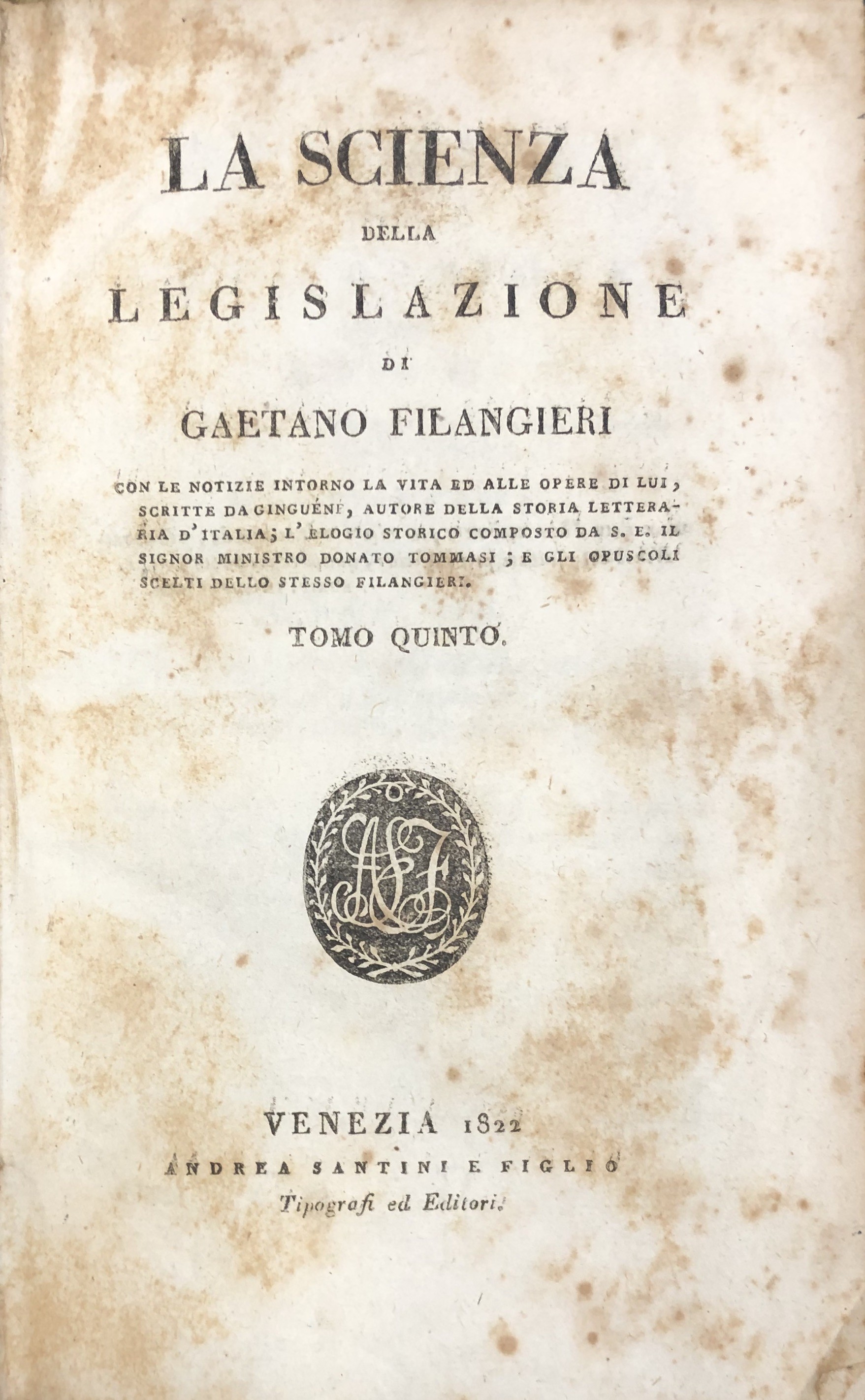La scienza della legislazione. Con le notizie intorno la vita ed alle opere di lui, scritte da Ginguene, autore della storia letteraria d'Italia; L'elogio storico composto da S.E. il signor Ministro Donato Tommasi; e gli opuscoli scelti dello stesso Filangieri