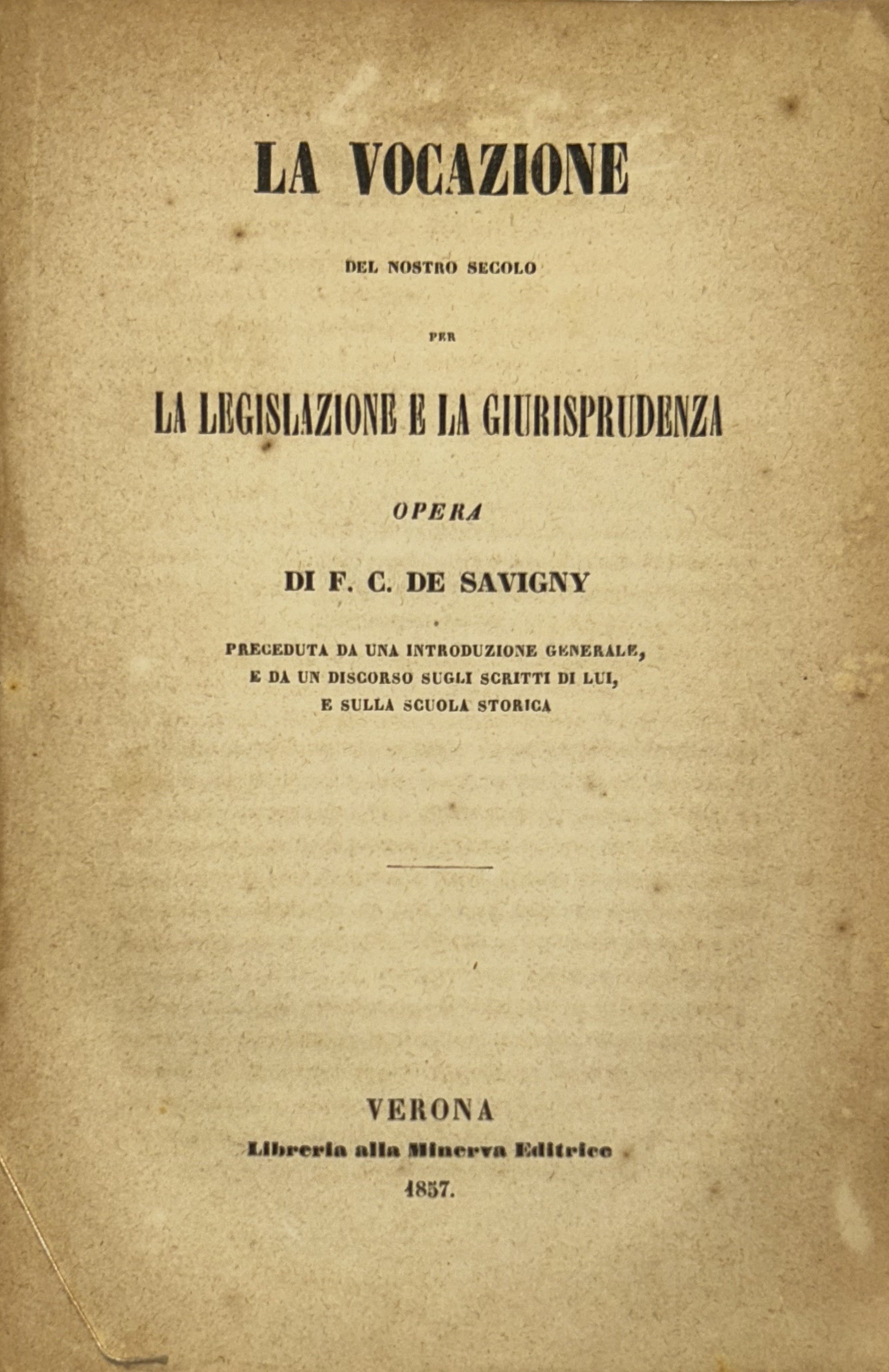 La vocazione del nostro secolo per la legislazione e la giurisprudenza. Opera di F. C. De Savigny preceduta da una introduzione generale, e da un discorso sugli scritti di lui, e sulla scuola storica