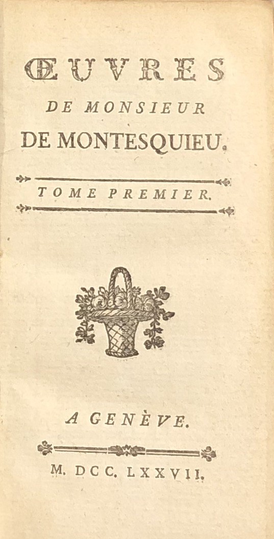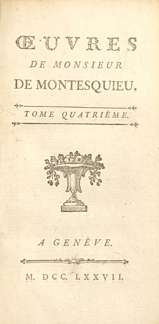 Esemplare in quattro volumi de "Lo spirito delle leggi" di Montesquieu. Ogni tomo contiene nelle pagine finali un indice dettagliato dei capitoli presenti. In antiporta al primo volume ritratto inciso dell'Autore.