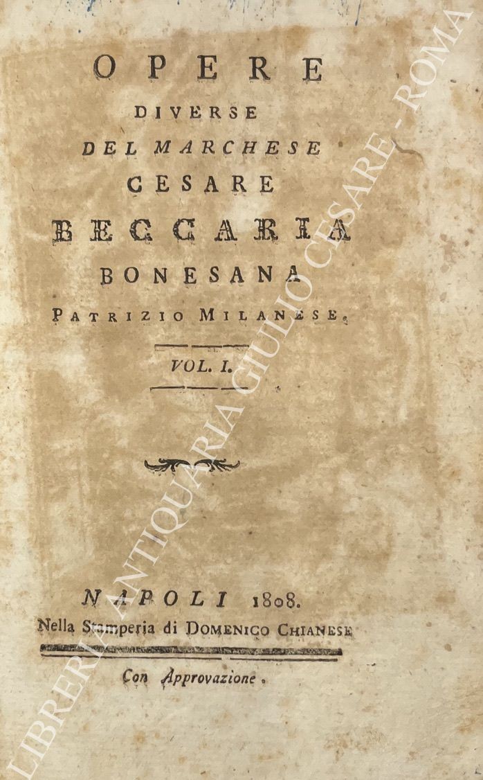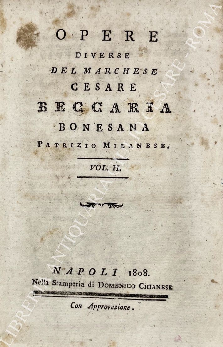 Opere diverse del marchese Cesare Beccaria Bonesana Patrizio Milanese. Vol. I - "De' Delitti e delle Pene"; Vol. II - Raccolta di giudizi e di accuse mosse all'opera con risposte di Beccaria (e Commento al libro di Voltaire)