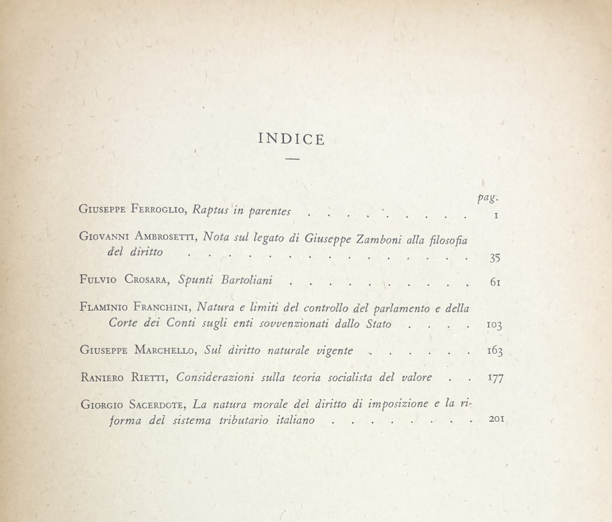 Raptus in parentes (Ferroglio). Nota sul legato di Giuseppe Zamboni alla filosofia del diritto (Ambrosetti). Spunti Bartoliani (Crosara). Natura e limiti del controllo del Parlamento e della Corte dei Conti sugli enti sovvenzionati dallo Stato (Franchini). Sul diritto naturale vigente (Marchello). Considerazioni sulle teoria socialista del valore (Rietti). La natura morale del diritto di imposizione e la riforma del sistema tributario italiano (Sacerdote)