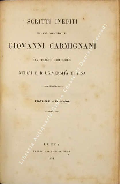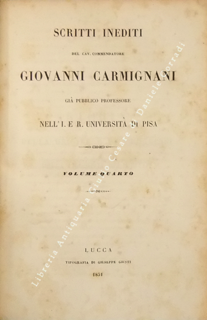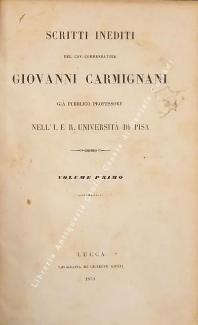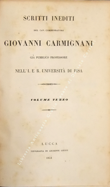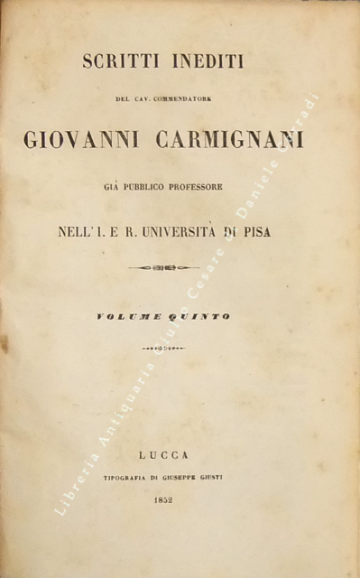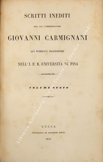 Scritti inediti. Voll. I-IV - Storia della origine e de' progressi della filosofia del dritto. Vol. V - Dichiarazione de' progetti di codice penale e di codice di procedura criminale. Vol. VI - Osservazioni alle istruzioni per norma dei redattori di un codice penale toscano del quale si progettava la compilazione sul cadere dell'anno 1839