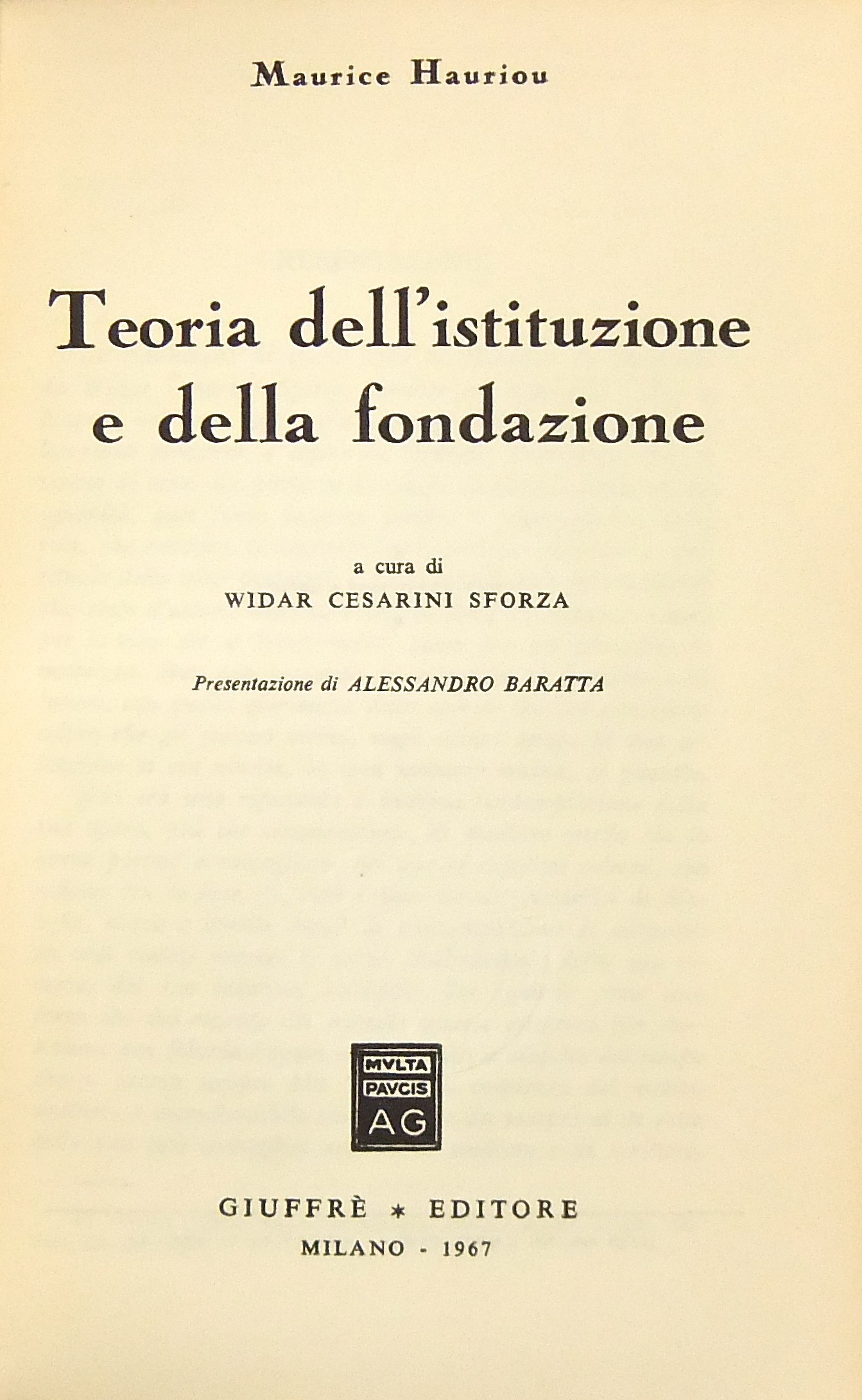 Teoria dell'istituzione e della fondazione. A cura di Widar Cesarini Sforza. Presentazione di Alessandro Baratta
