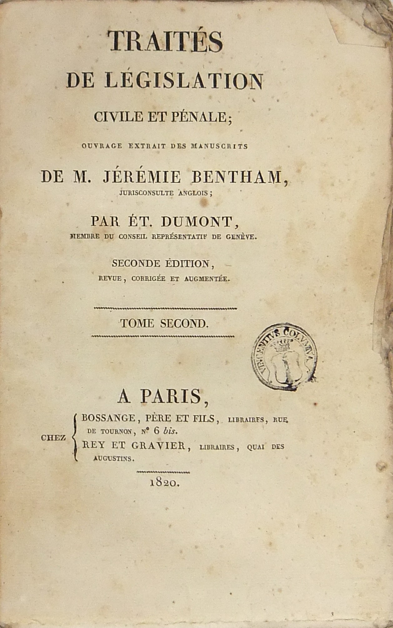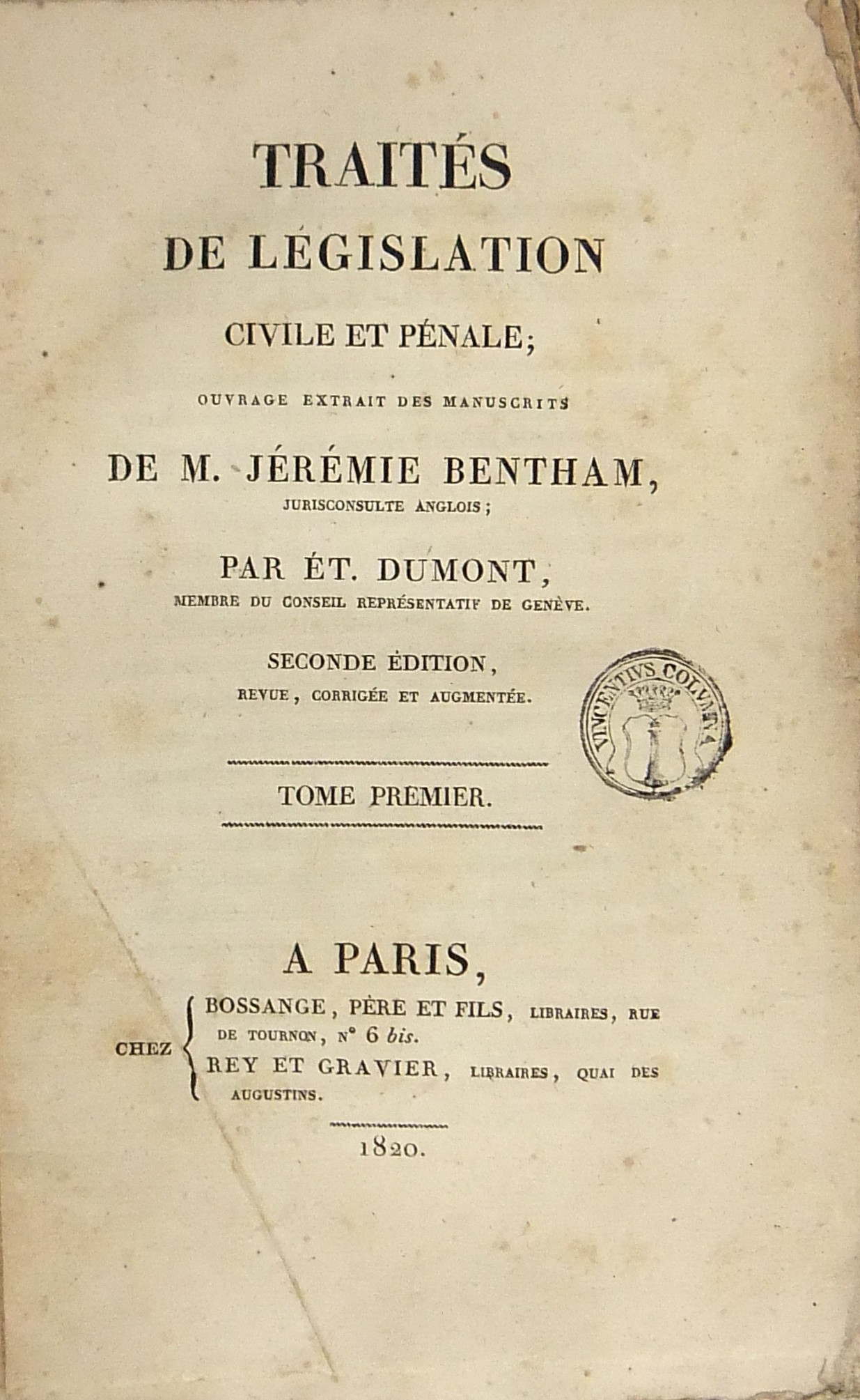 Traites de legislation civile et penale ouvrage extrait des manuscrits de M. Jeremie Bentham par Et. Dumont
