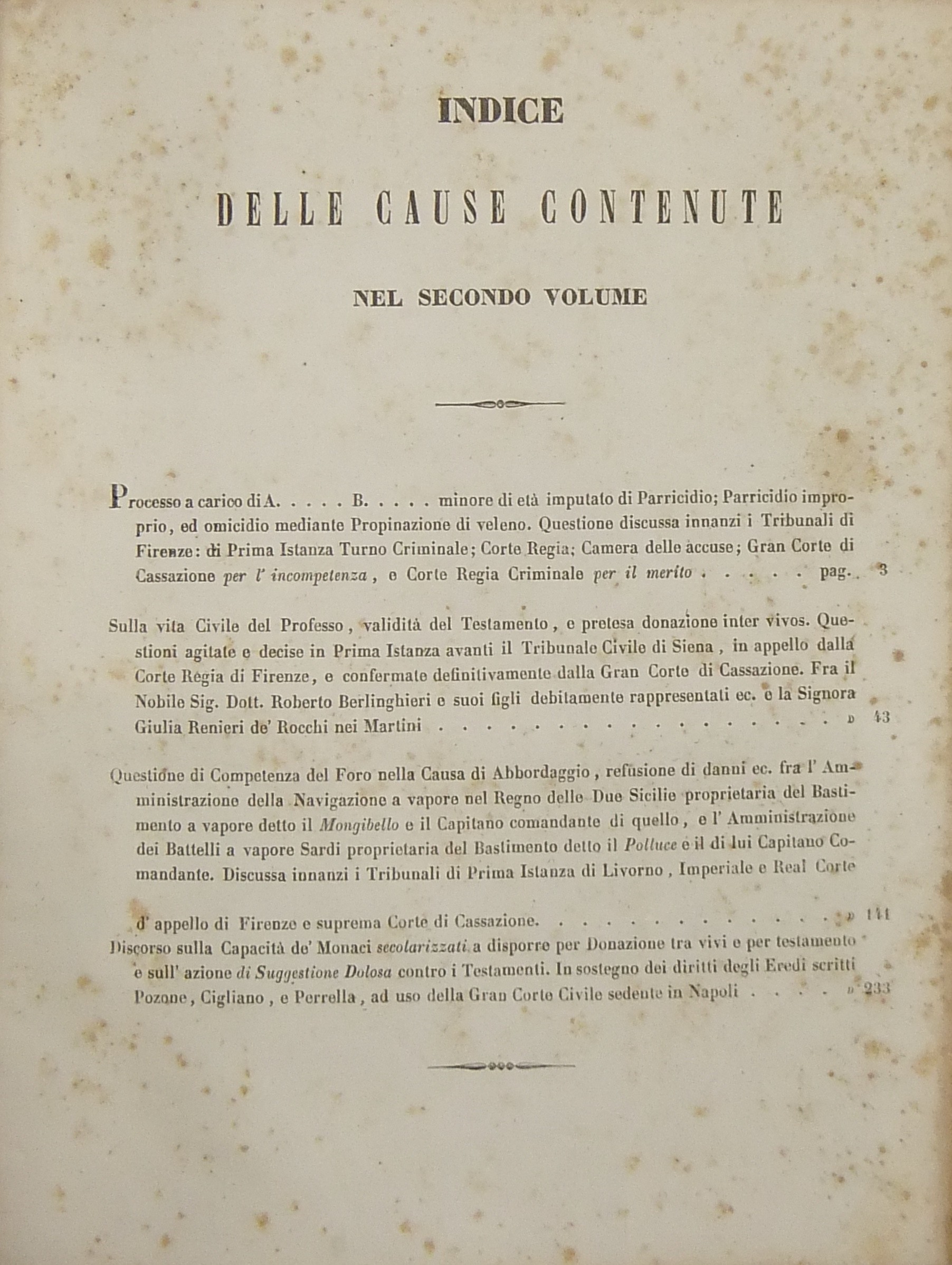 Contiene: Processo a carico di A... B... minore di età imputato di parricidio ...; Sulla vita civile del professo, validità del testamento, e pretesa donazione intervivos ...; Questione di competenza del Foro nella causa di abbordaggio, refusione di danni ecc. fra il Mongibello e il Polluce ...; Discorso sulla capacità de' monaci secolarizzati a disporre per donazione tra vivi e per testamento ...;