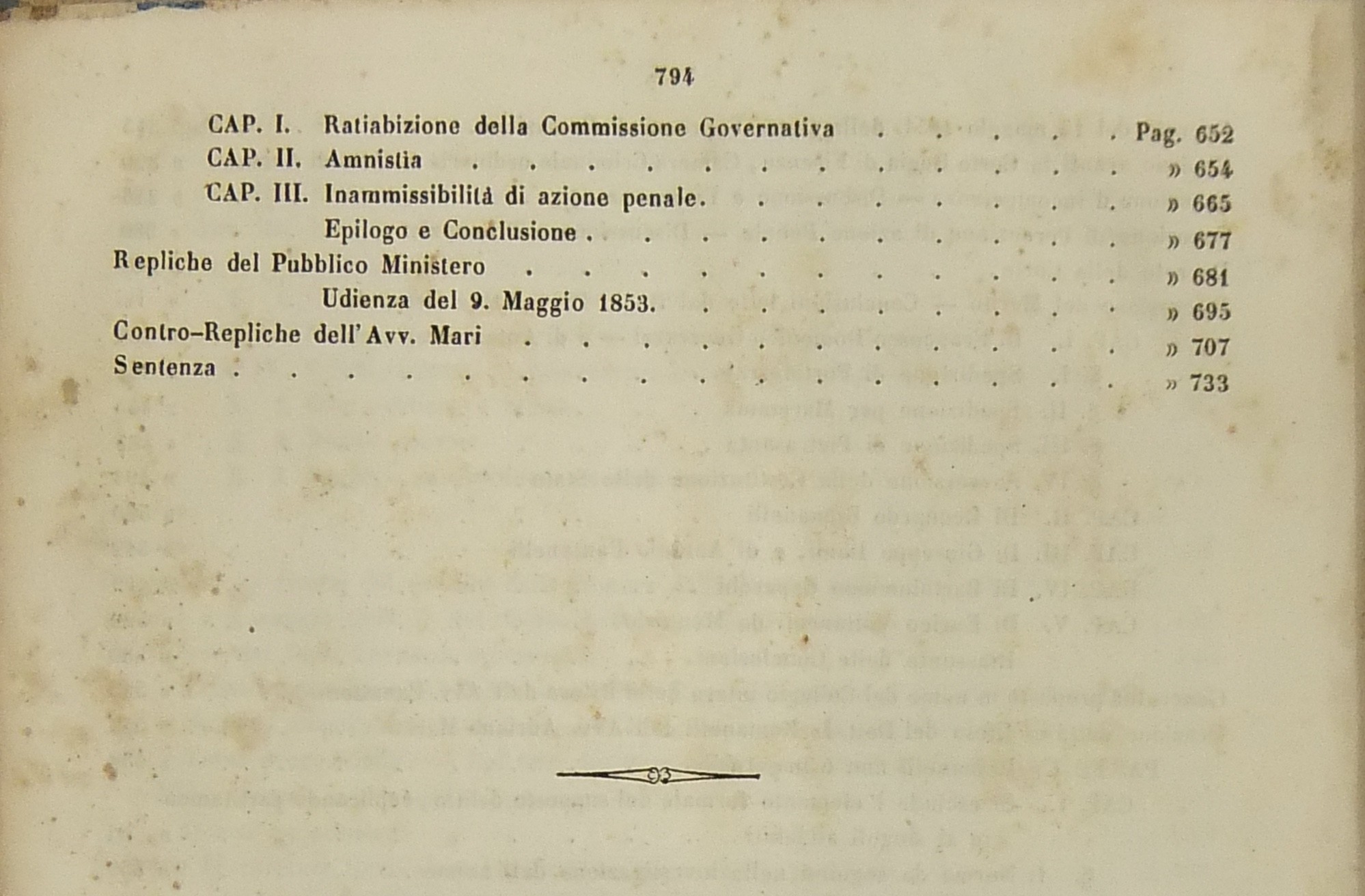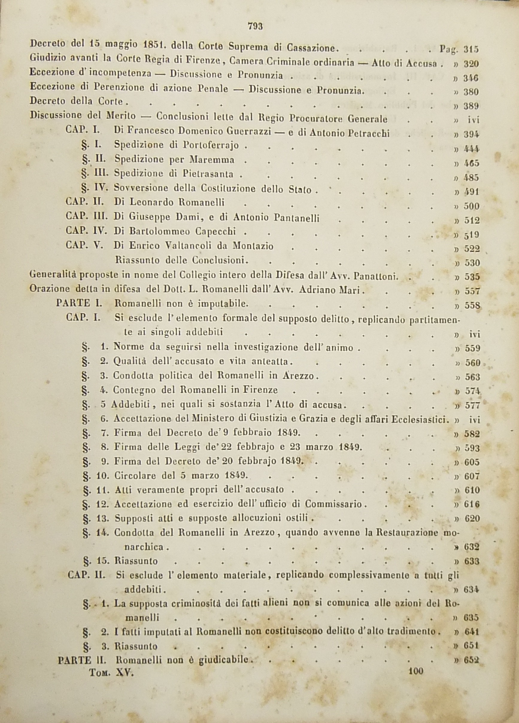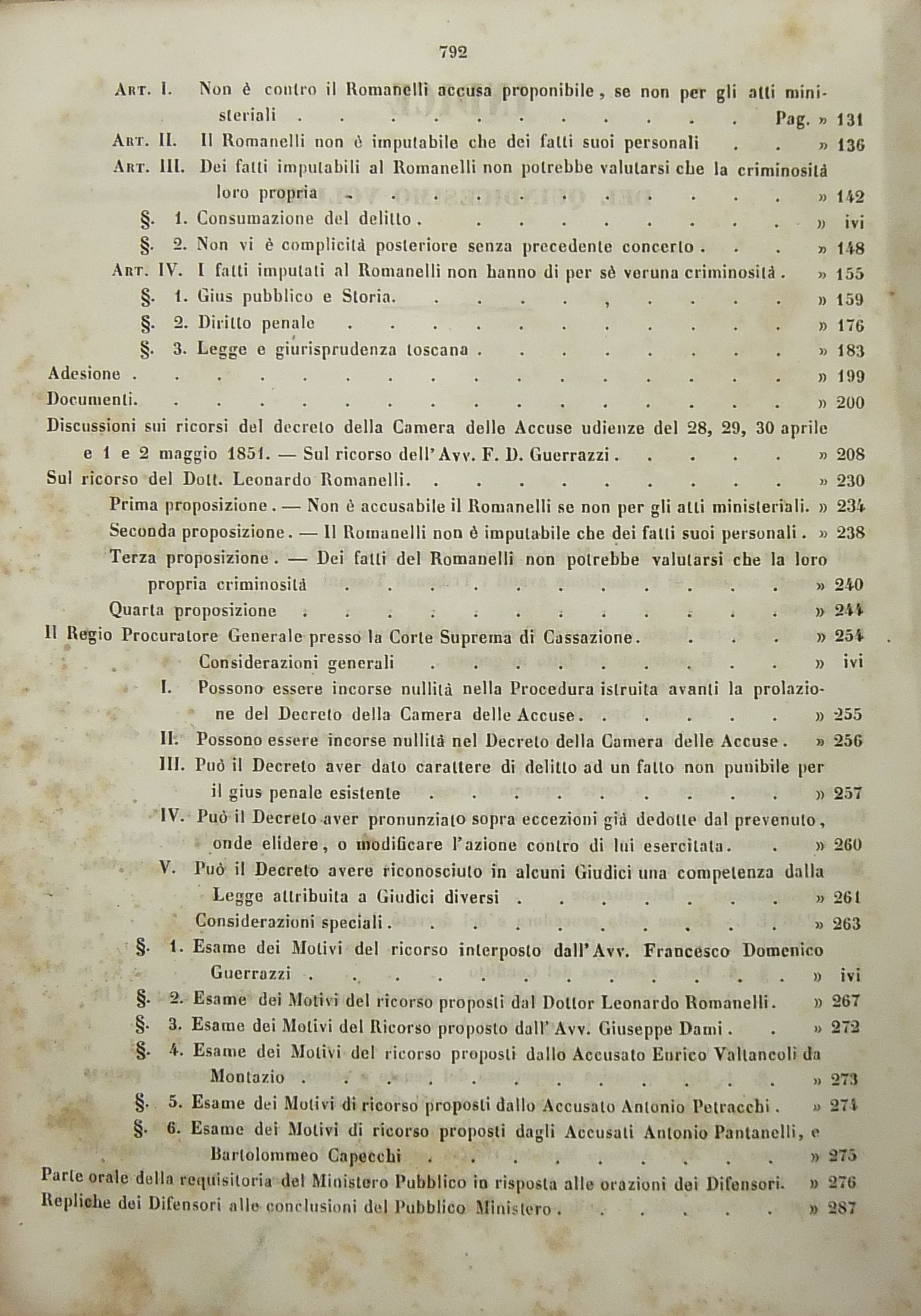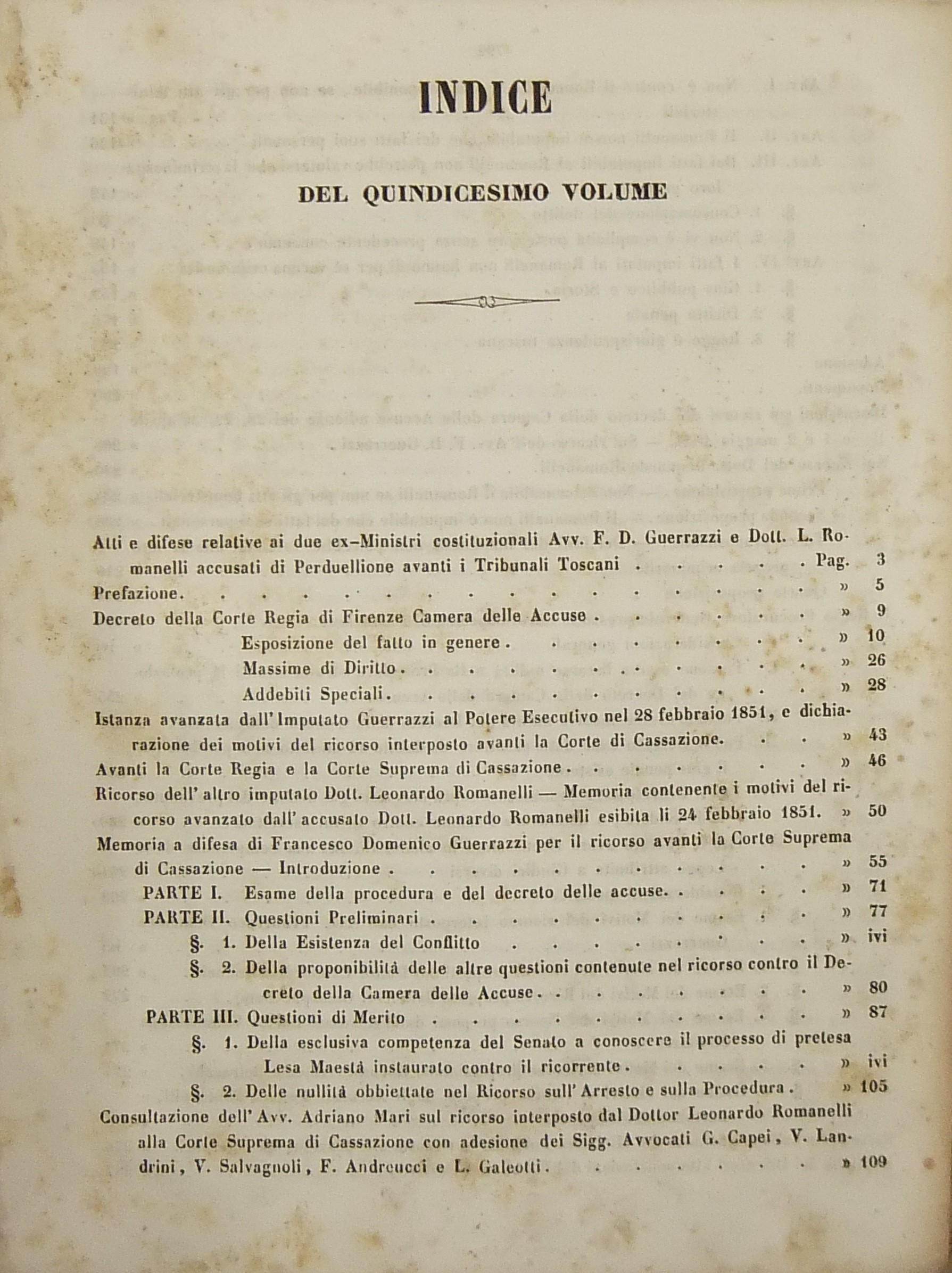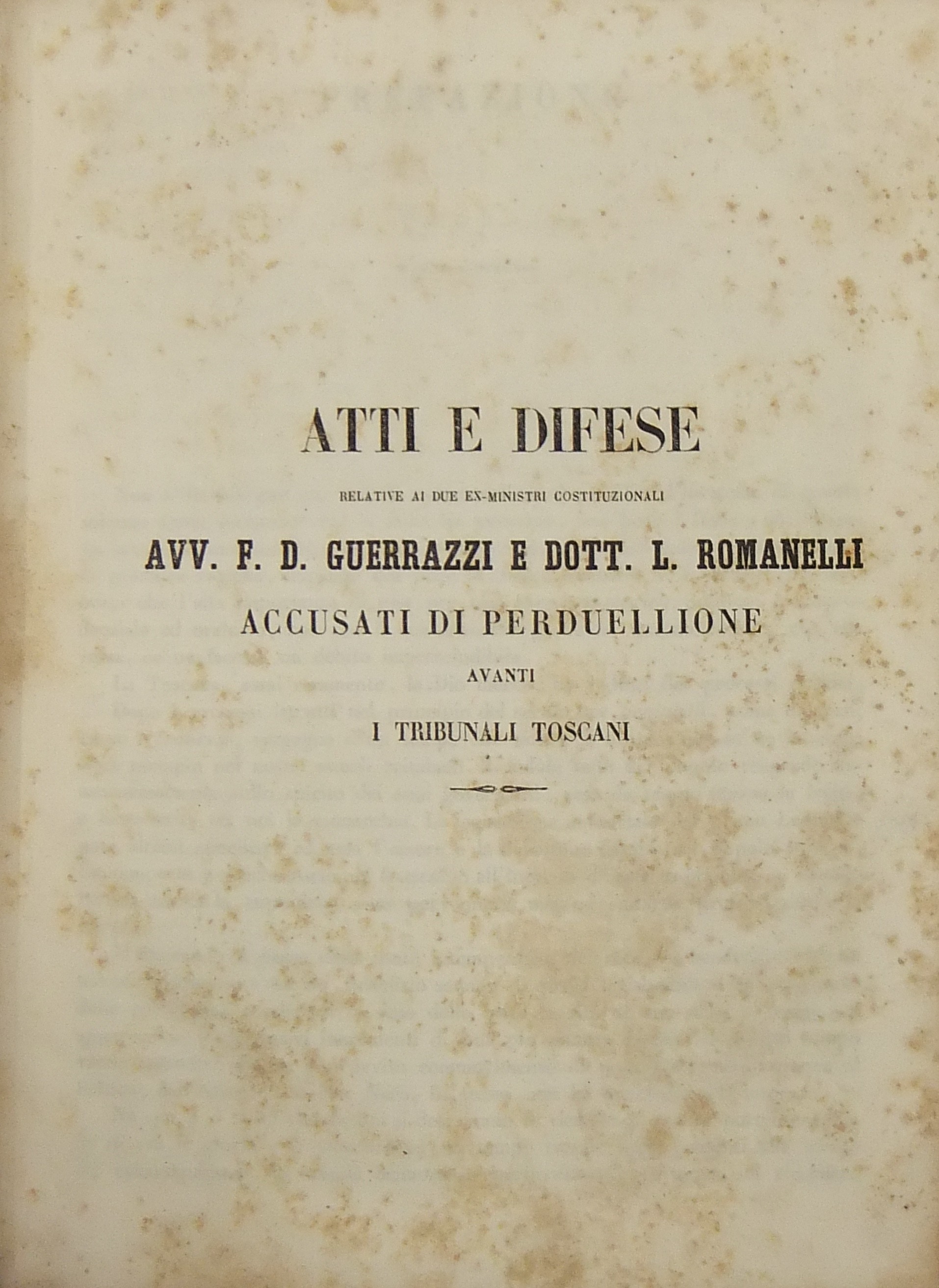 Contiene: Atti e difese relative ai due ex-Ministri Guerrazzi e Romanelli accusati di Perduellione avanti i Tribunali Toscani.