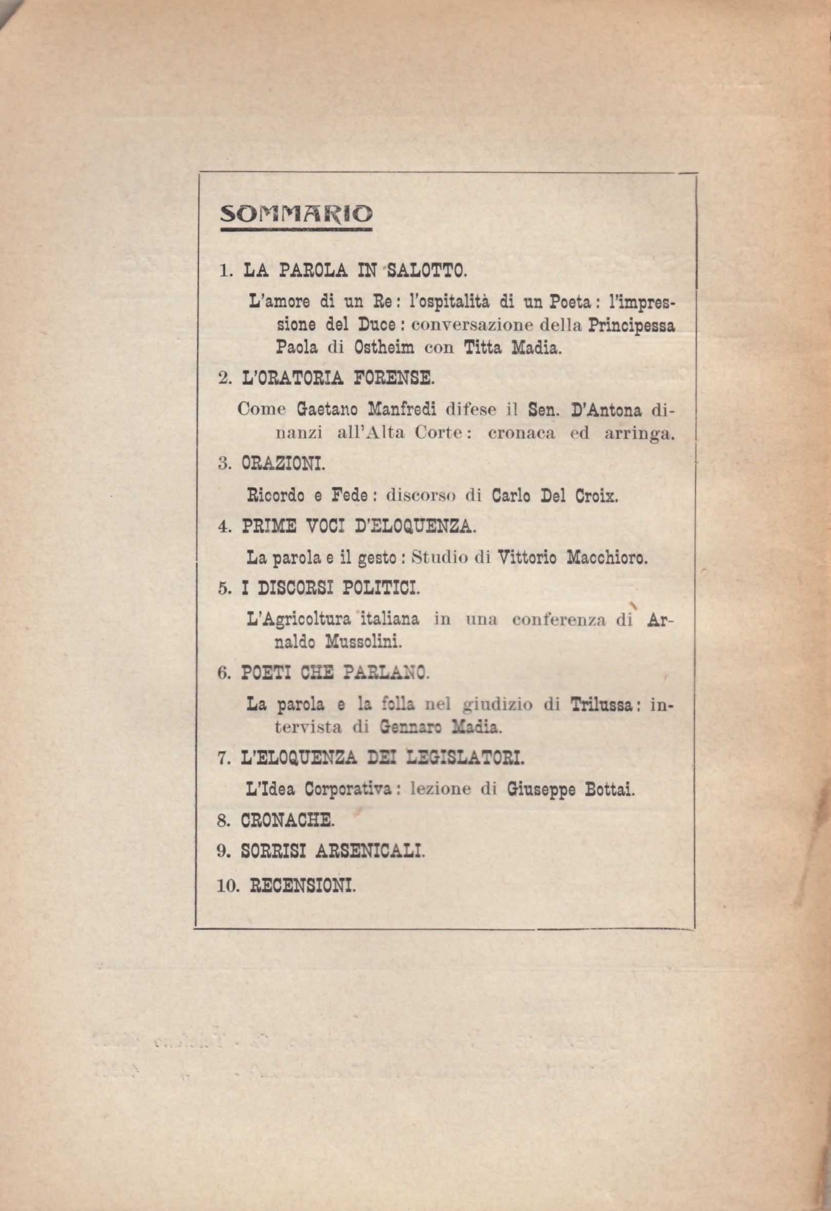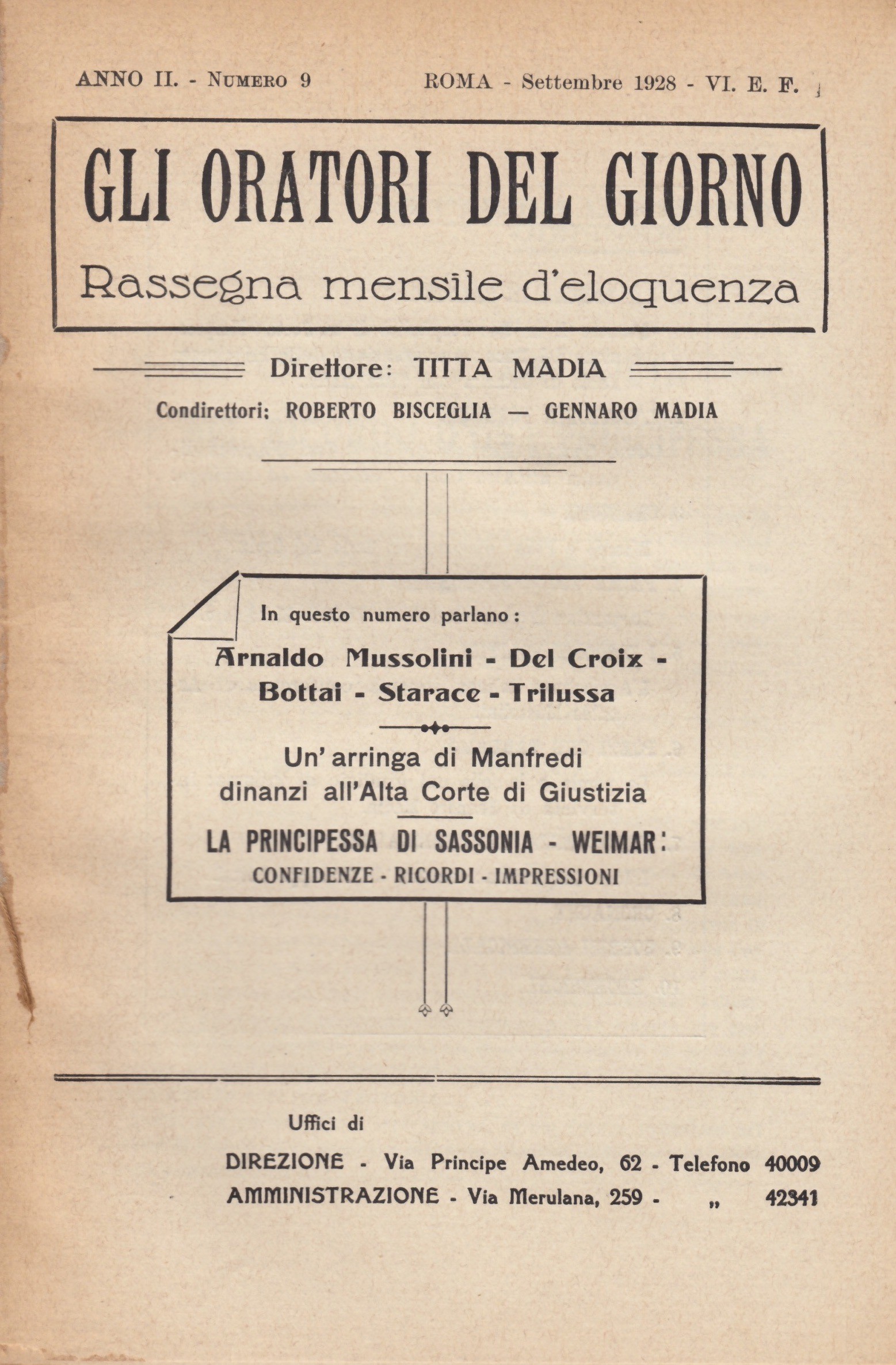 Gli oratori del giorno. Rassegna mensile d'eloquenza. Anno II, Numero 9. Settembre 1928. La parola in salotto; L'amore di un Re; L'ospitalità di un Poeta; L'impressione del Duce; Conversazione della Principessa Paola di Ostheim con Titta Madia; L'oratoria forense; Come Gaetano Manfredi difese il Sen. D'Antona dinanzi all'Alta Corte; Orazioni; Ricordo e fede discorso di Carlo Del Croix; Prime voci d'eloquenza; La parola e il gesto; Studio di Vittorio Macchioro; I discorsi politici; L'agricoltura italiana in una conferenza di Arnaldo Mussolini; Poeti che parlano, La parola e la folla nel giudizio di Trilussa, intervista di Gennaro Madia; L'eloquenza dei Legislatori; L'idea corporativa, lezione di Giuseppe Bottai