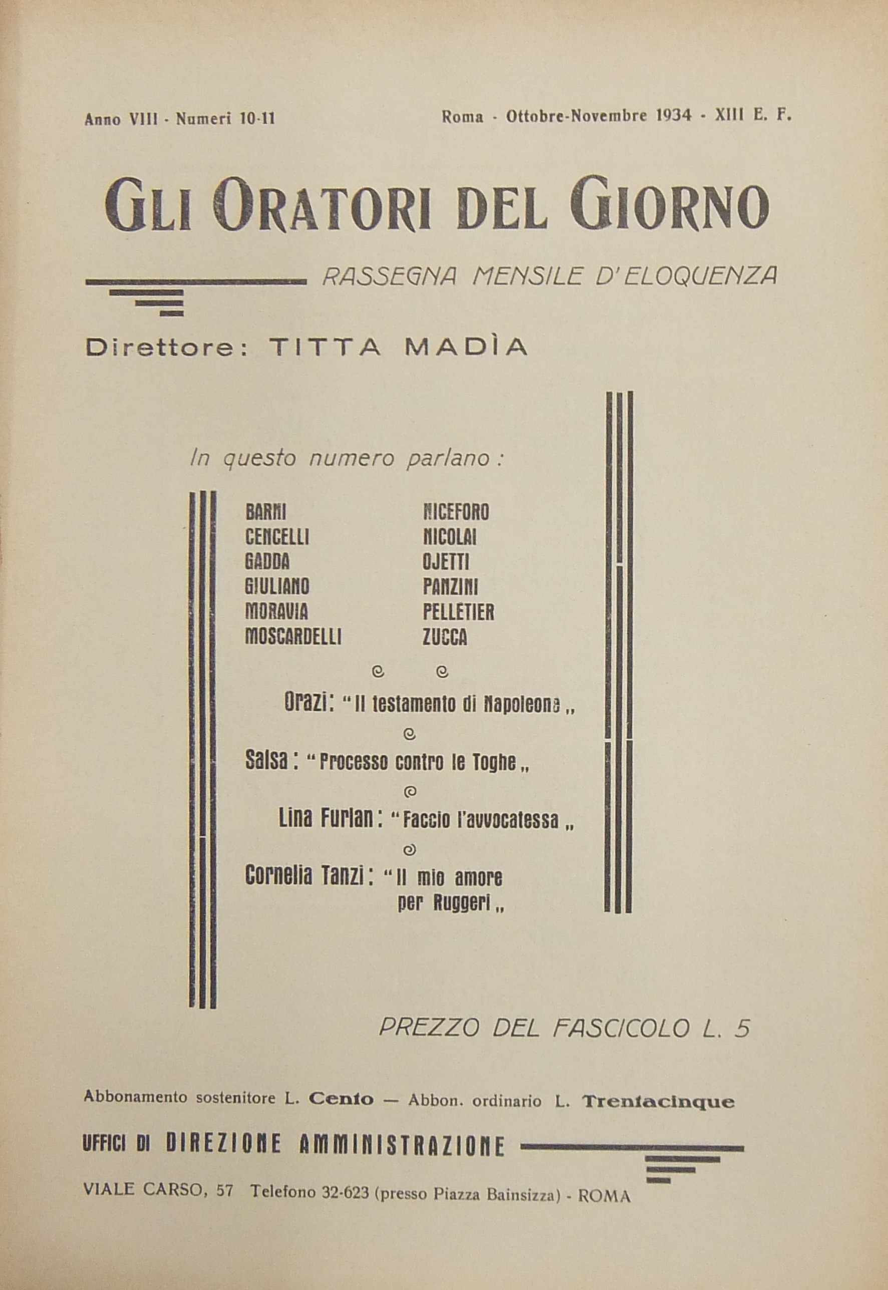 Gli oratori del giorno. Rassegna mensile d'eloquenza. Anno VIII - Numero 10-11. Ottobre-Novembre 1934