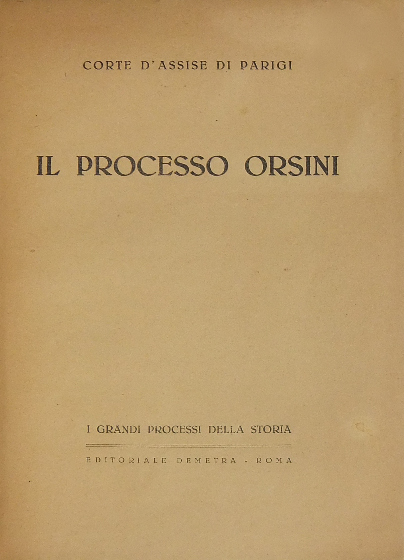 Resoconto e documenti del processo presso Corte d'Assise di Parigi contro Felice Orsini autore con altri tre complici del famoso attentato dinamitardo a Napoleone III. Alla fine del volume in una tavola fuori testo un facsimile di una lettera dell'Orsini all'avvocato Favre.