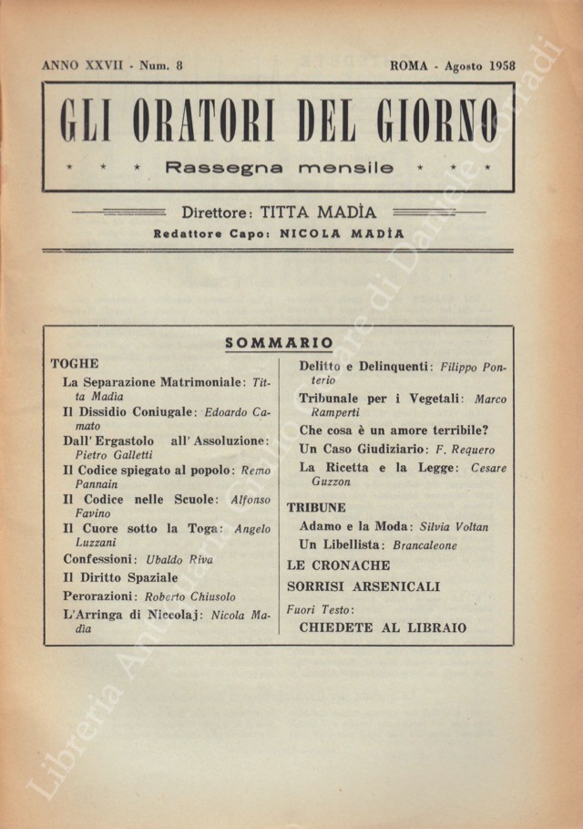 Gli oratori del giorno. Rassegna mensile d’eloquenza. Anno XXVII – Numero 8. Agosto 1958