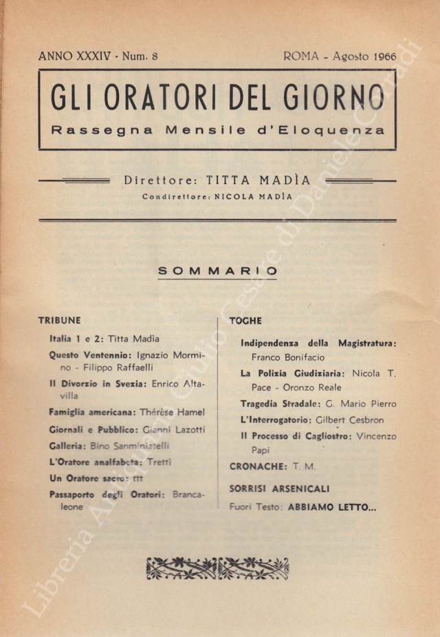 Gli oratori del giorno. Rassegna mensile d’eloquenza. Anno XXXIV – Numero 8. Agosto 1966