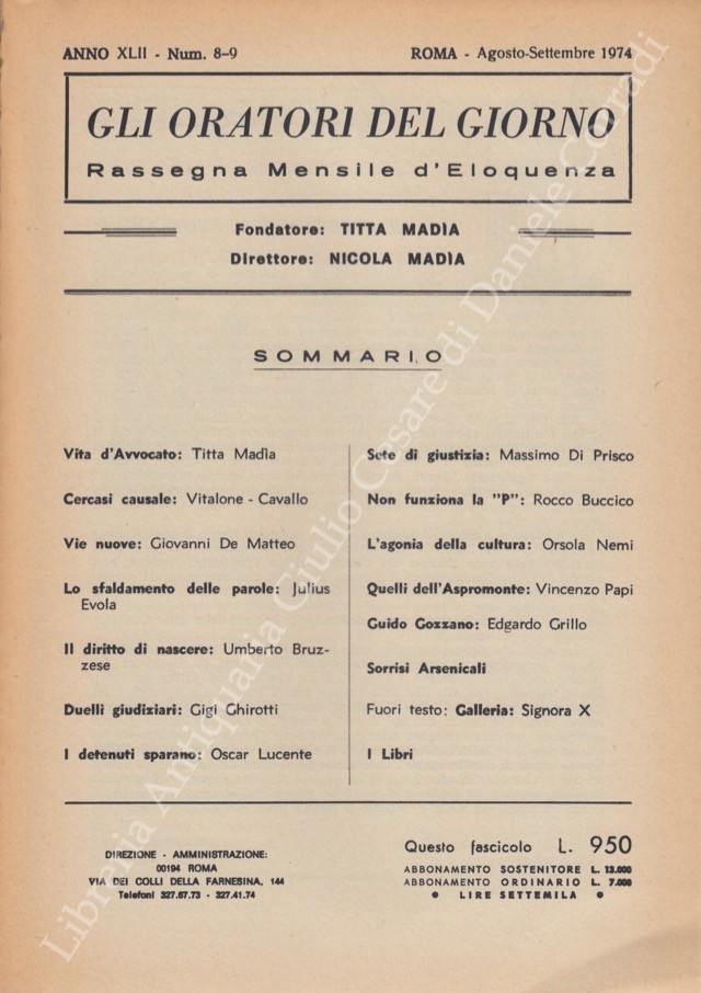 Gli oratori del giorno. Rassegna mensile d'eloquenza. Anno XLII - Numero 8-9. Agosto-Settembre 1974