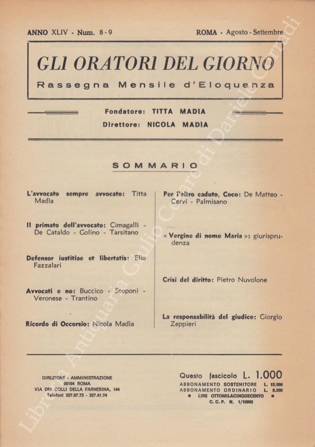 Gli oratori del giorno. Rassegna mensile d’eloquenza. Anno XLIV – Numero 8-9. Agosto-Settembre 1976