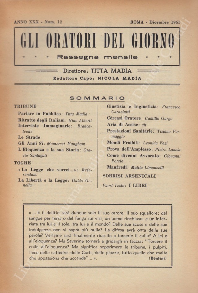 Gli oratori del giorno. Rassegna mensile d'eloquenza. Anno XXX - Numero 11. Dicembre 1961