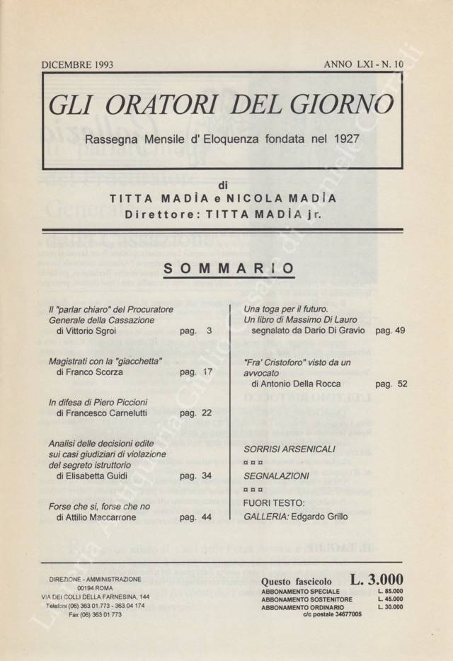 Gli oratori del giorno. Rassegna mensile d’eloquenza. Anno LXI – Numero 10. Dicembre 1993